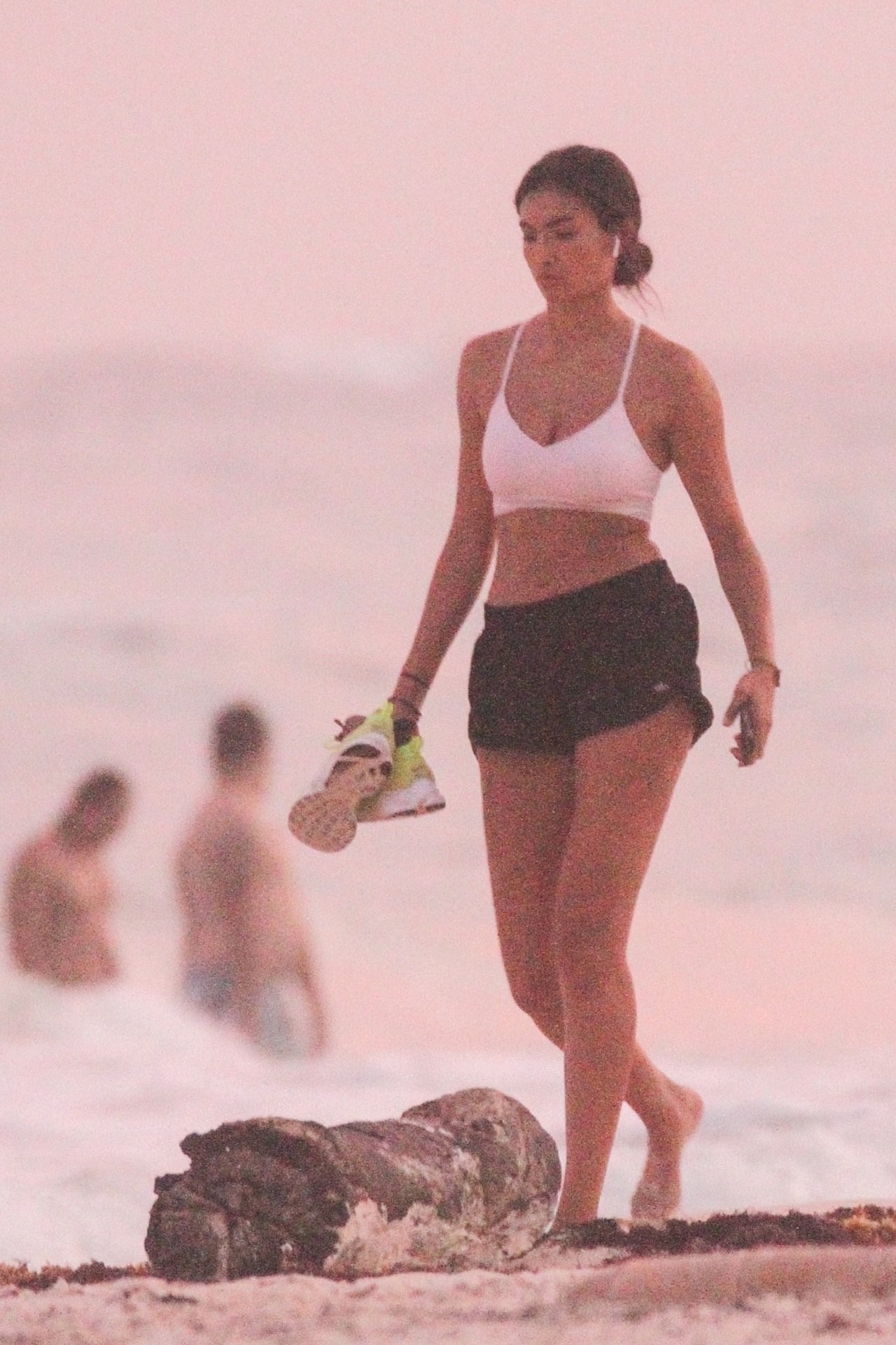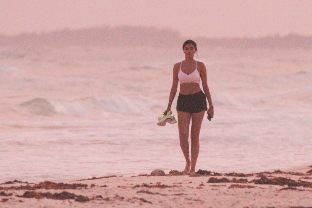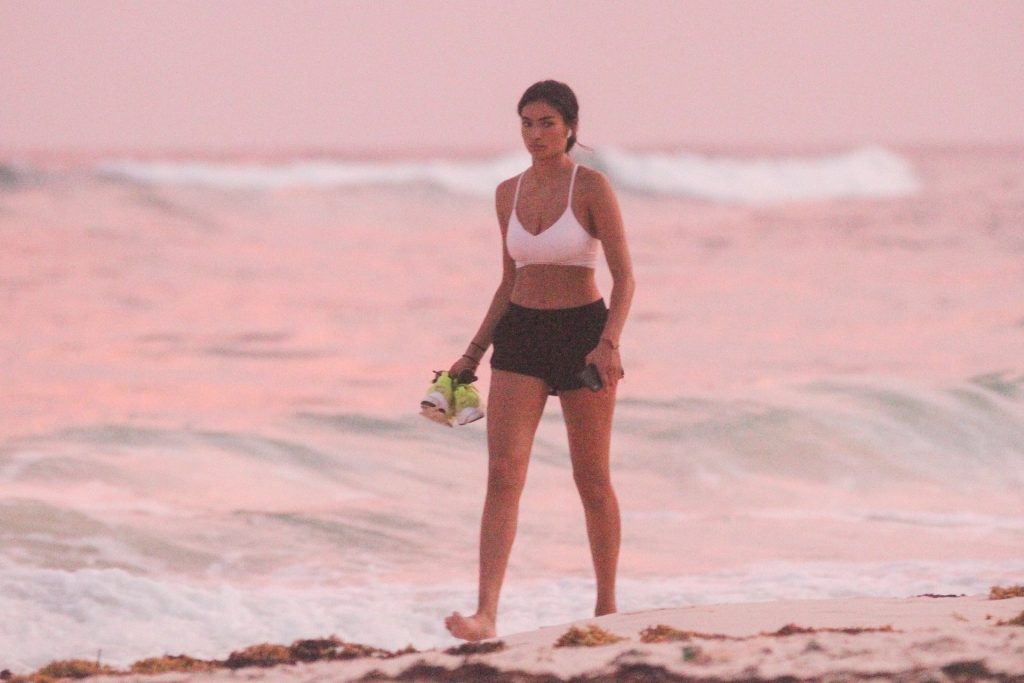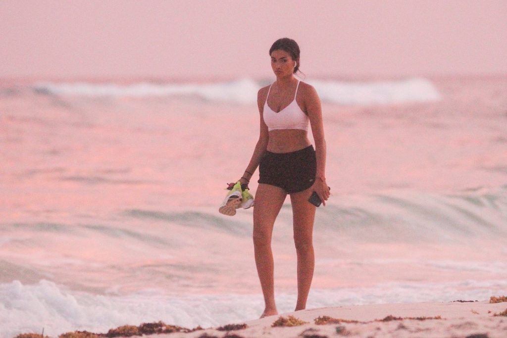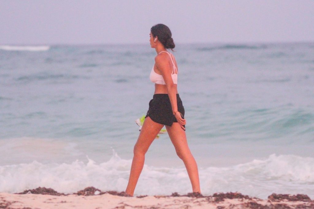 Модель Victoria’s Secret Келли Гейл наслаждается расслабляющей прогулкой в одиночестве по пляжу в Тулуме, Мексика, 13.12.2019. Шведско-австралийская модель несет обувь в руках, прогуливаясь по песку после вечерней пробежки во время отпуска на юге от границы.