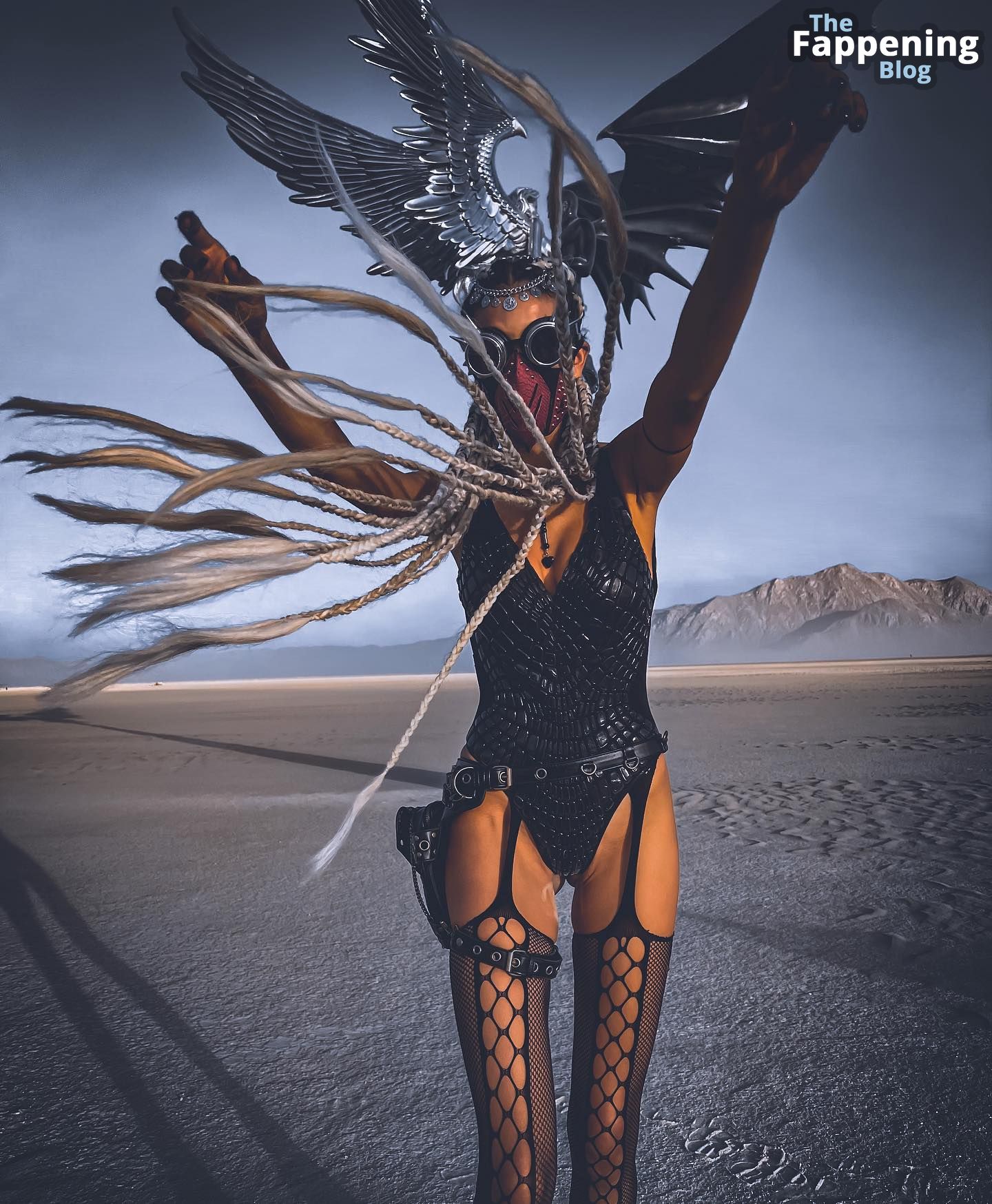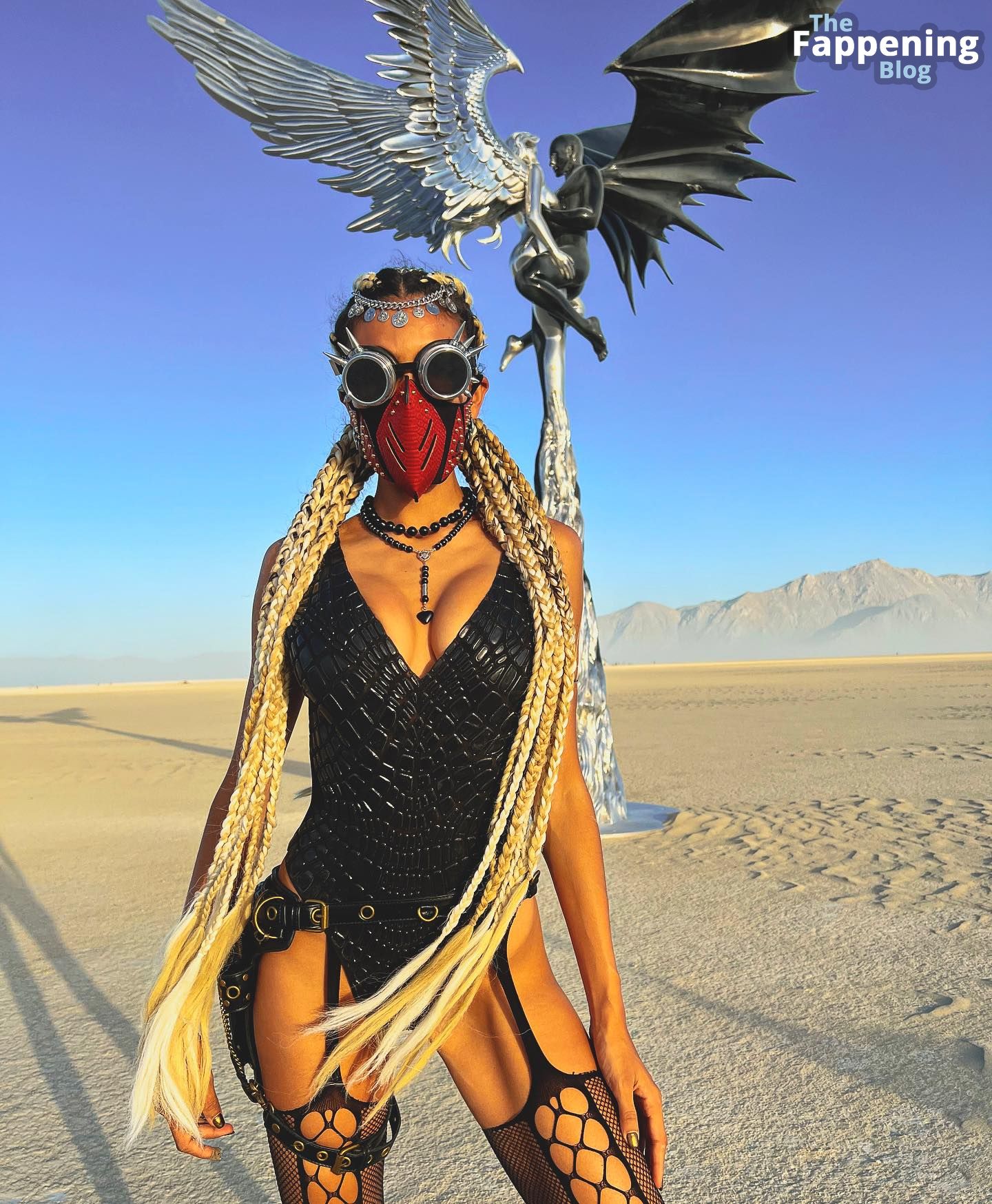 Шесть фотографий были сделаны на фоне эпических скульптур и инсталляций Burning Man, наполняя их особой энергией и атмосферой свободы. Лицо и тело Келли освещены золотыми лучами заката, подчеркивая её природную красоту и сияние. Звездочки на её груди отражают свет, создавая визуально завораживающий эффект. А на заднем плане можно увидеть замысловатые арт-объекты и силуэты других участников фестиваля, добавляя этим захватывающим снимкам дополнительную живость и динамику.