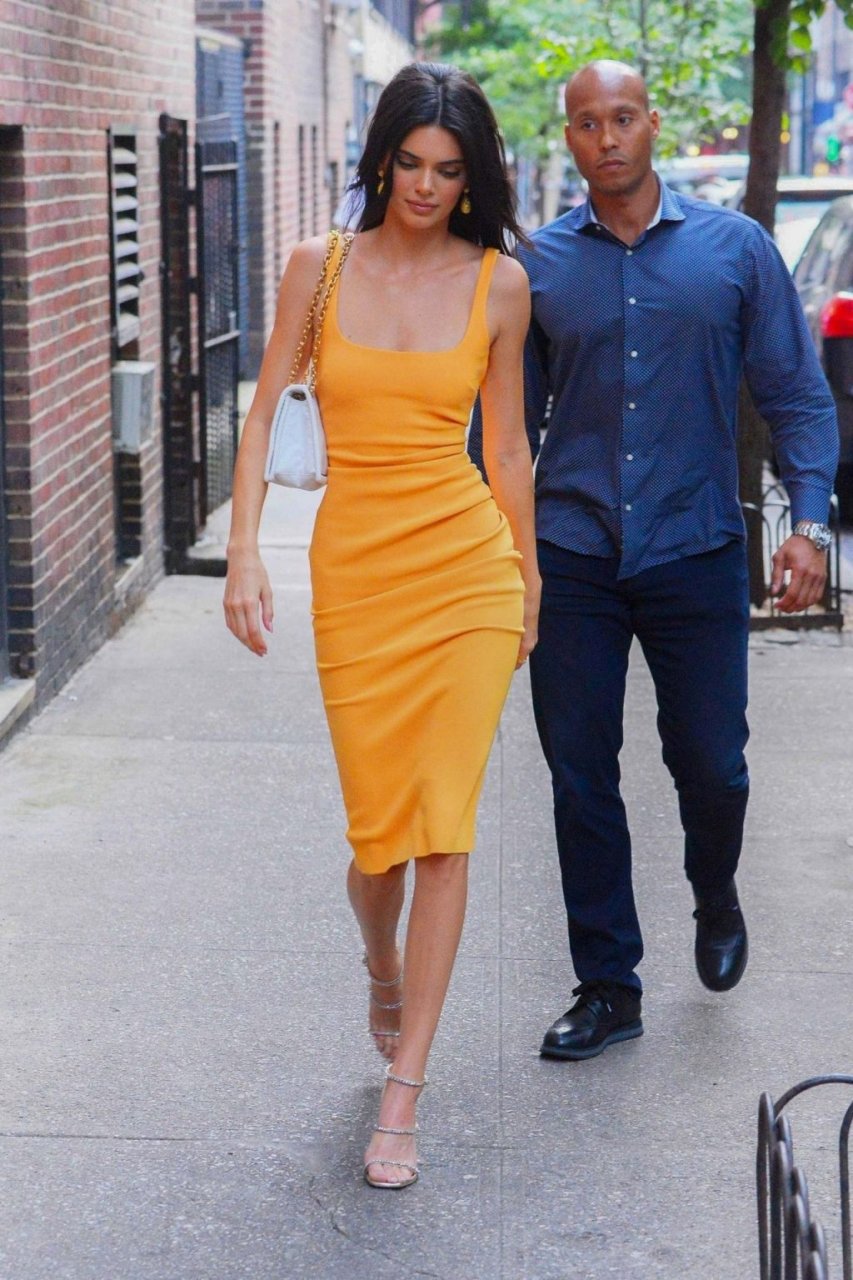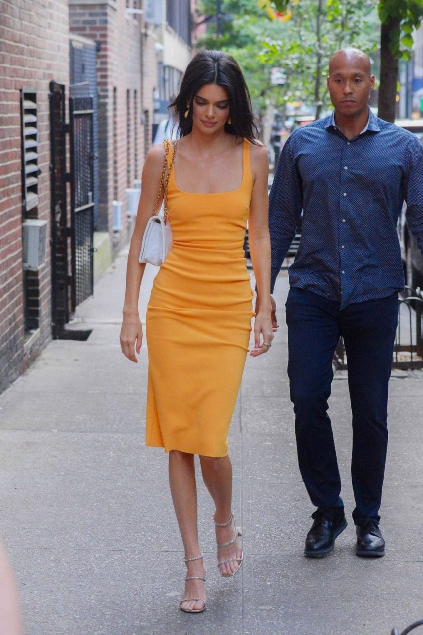 Стройная модель Кендалл Дженнер демонстрирует свою потрясающую улыбку во время прогулки по Нью-Йорку в стильном платье и туфлях на каблуках с белой сумочкой Prada, 17.06.2019. Она заходит в гастроном за Coca-Cola и несколькими закусками перед тем, как отправиться на мероприятие в Cafe Clover.