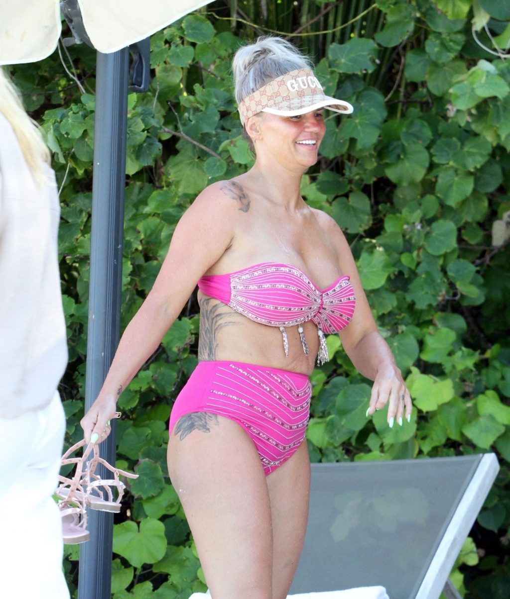 В розовом сексуальном бикини и кепке Gucci, бывшая звезда “Atomic Kitten” Керри Катона прогуливается по роскошному пятизвездочному курорту Ayada Maldives, 03/09/2020.