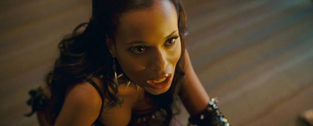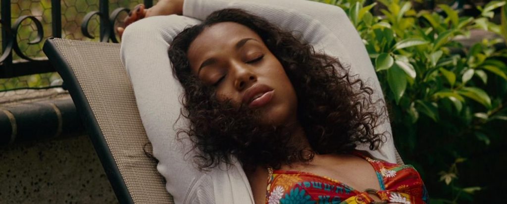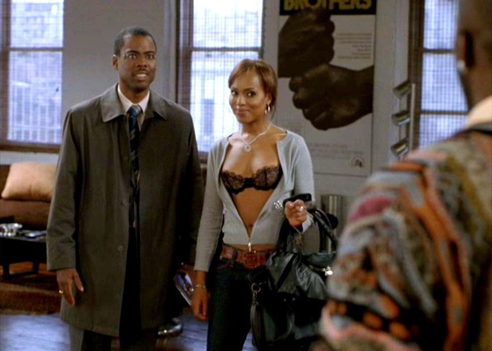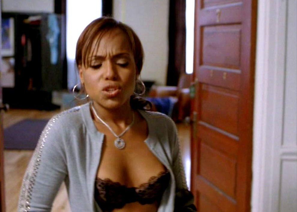 This is the best role of Kerry Washington, and we can see her making out with a guy against the wall. They remove clothes and reveal her white bra. The man picks her up and then carries her out of the room.