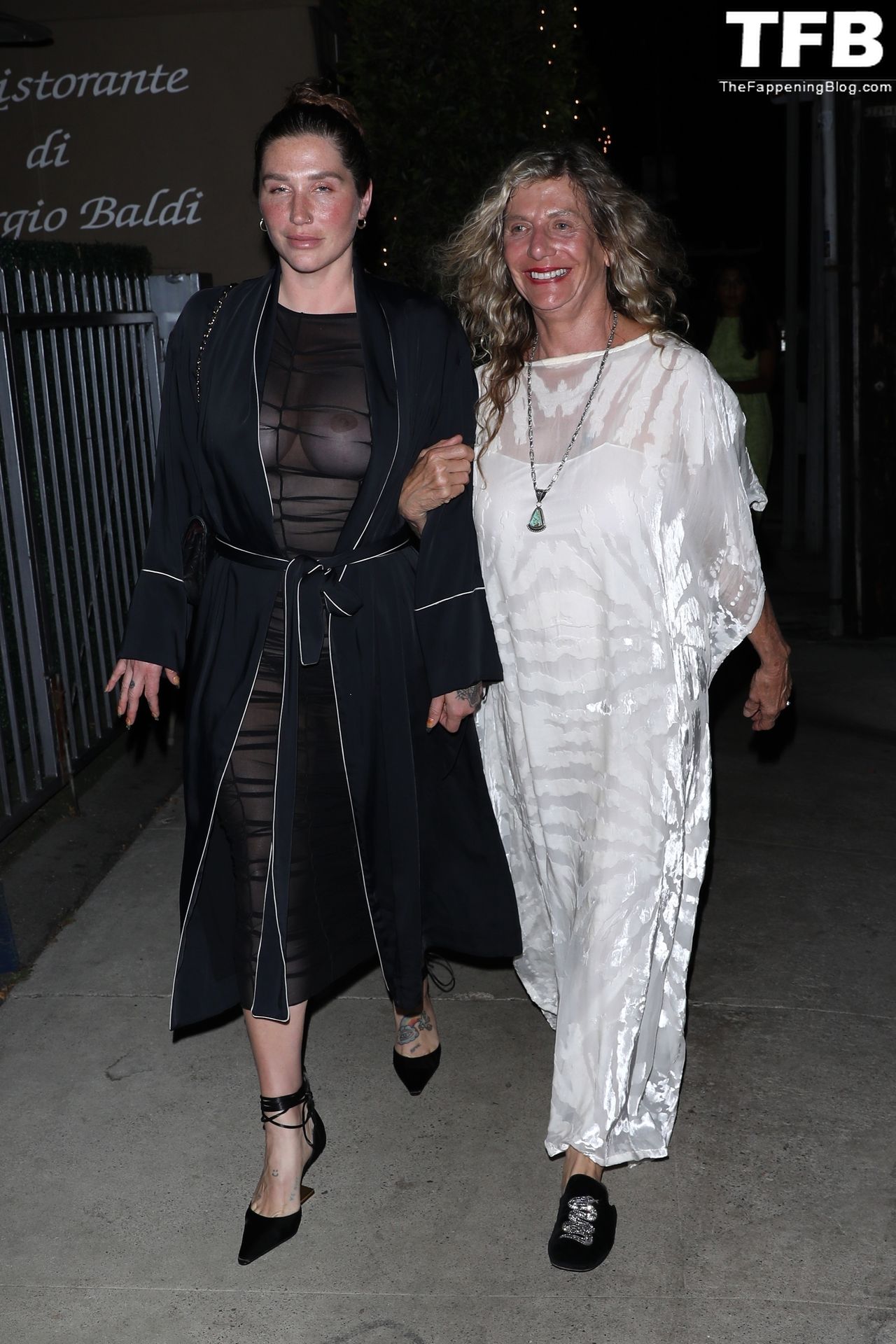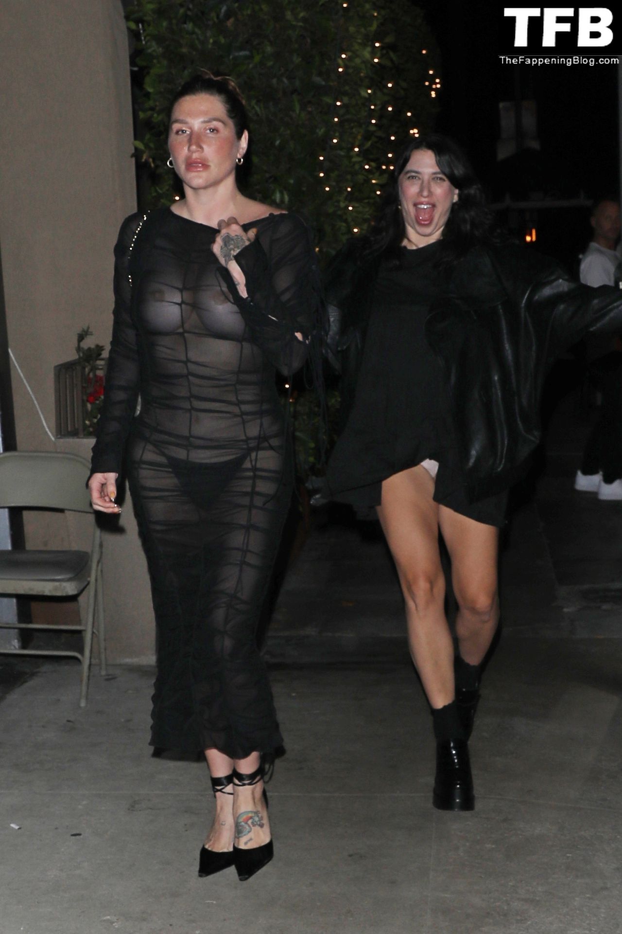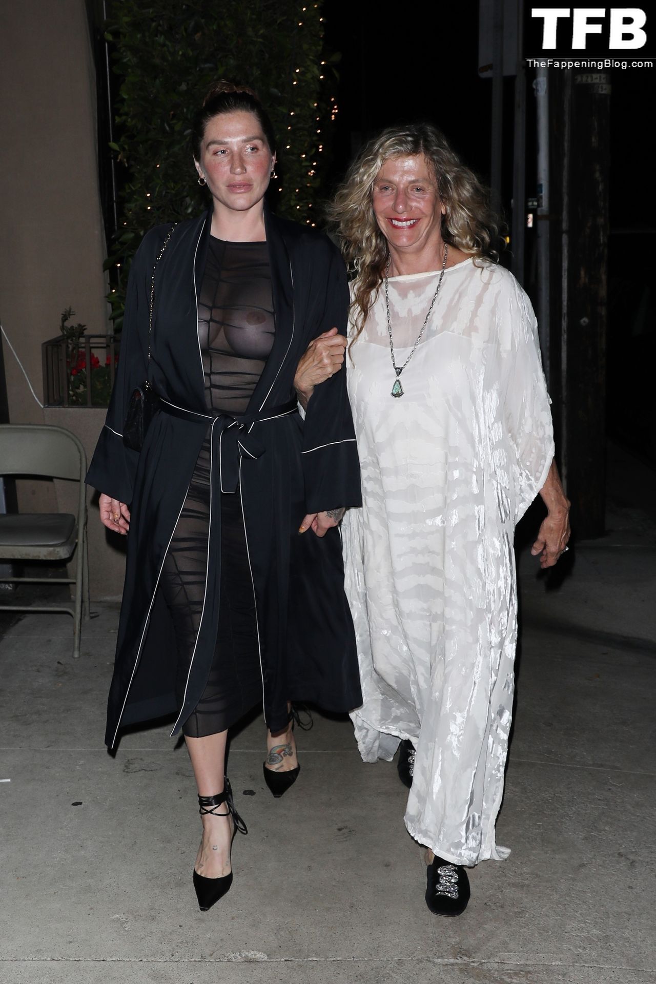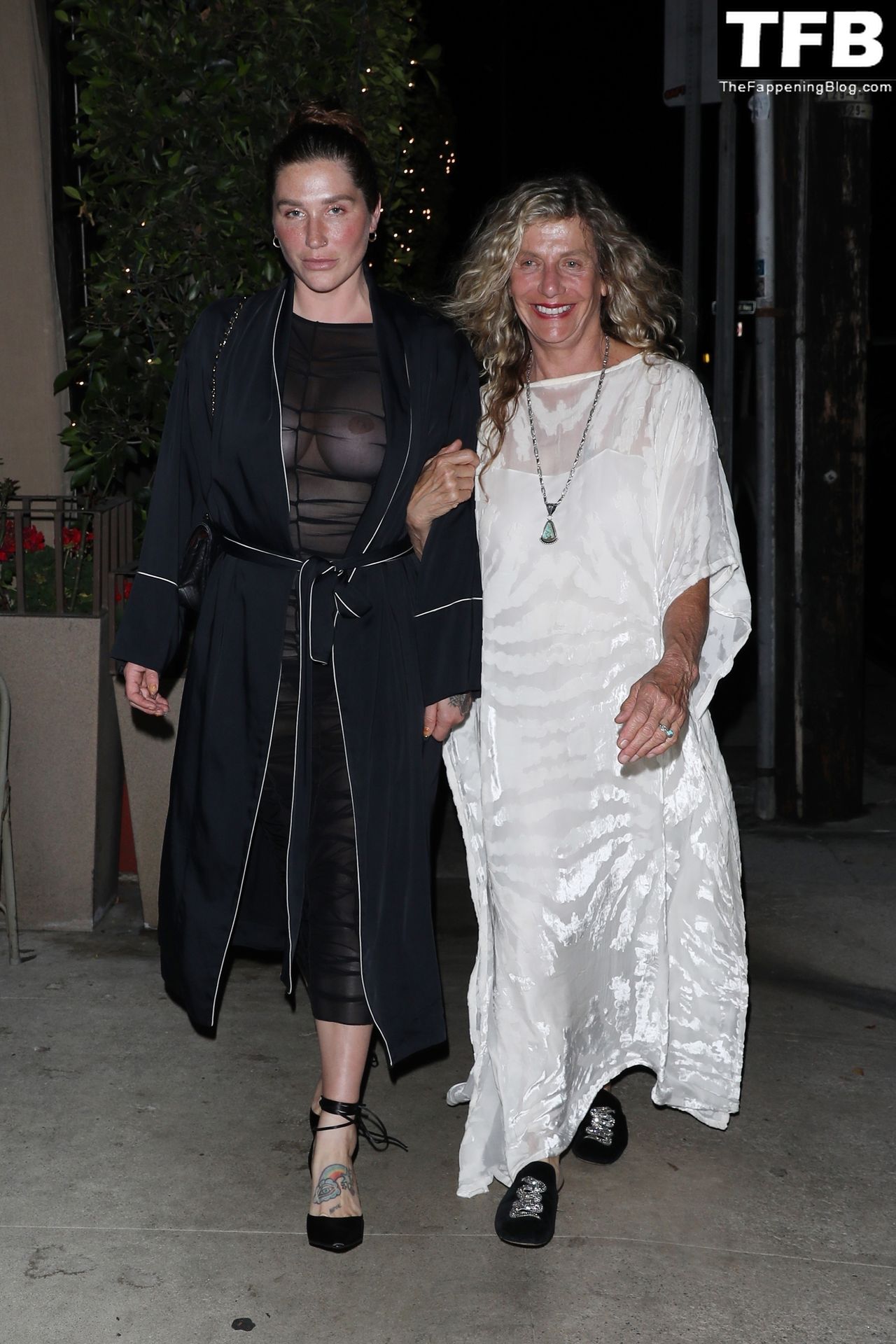 Певица Кеша оставляет мало места для воображения, покидая ресторан Giorgio Baldi в чёрном прозрачном платье из сетки с подходящим нижним бельём вместе со своей матерью Пиби Себерт и другом в Санта-Монике, 07.08.2022.