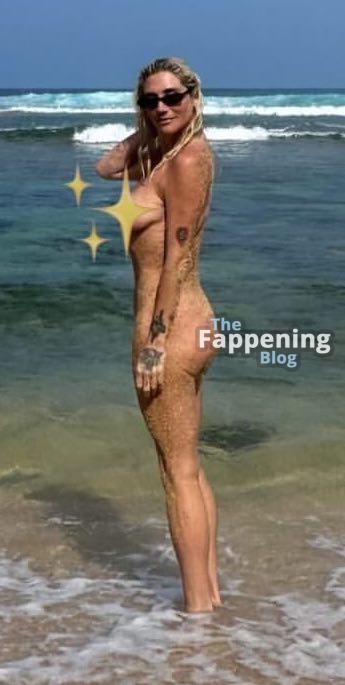Кеша полностью обнажена в образе хиппи на пляжных снимках, демонстрируя свою грудь и голую попу, стоя в воде. Она не стесняется, показывая свои прелести в фотосессии для социальных сетей.