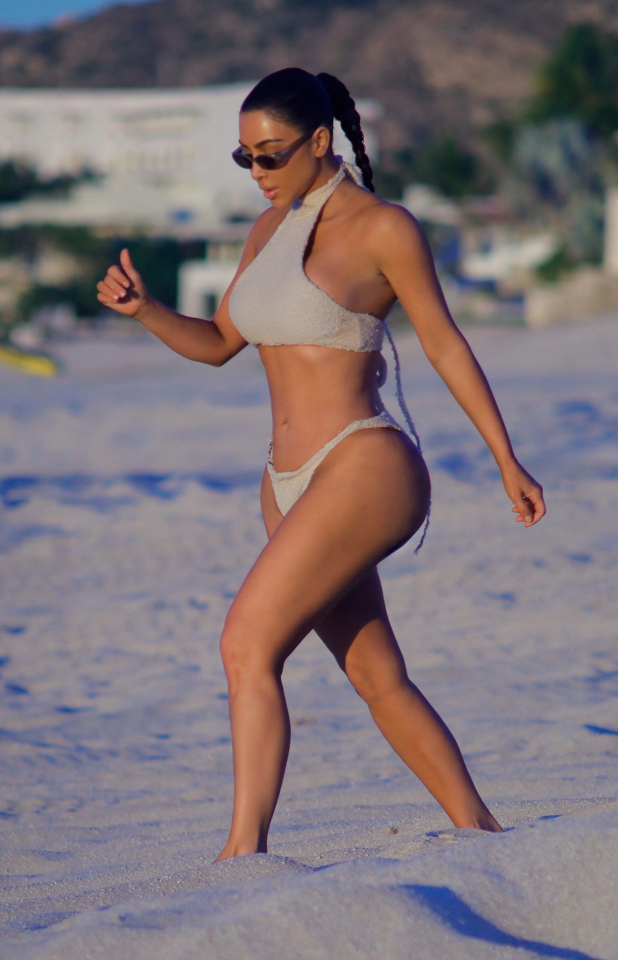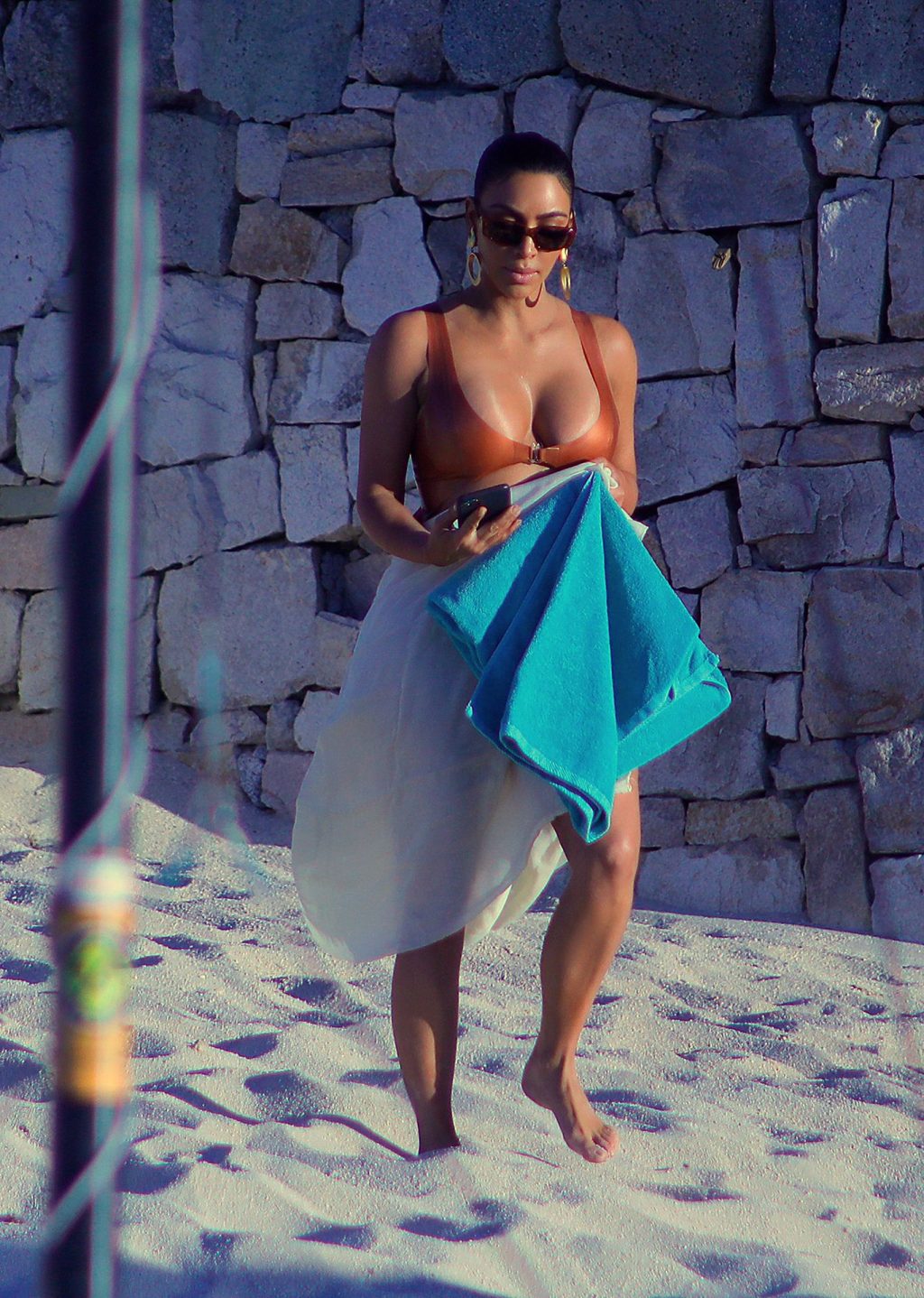 Её видели на утренней прогулке по пляжу в купальнике медного цвета. Ким и её друзья остановились в отеле Exclusive Esperanza Hotel and Resort, где виллы с видом на океан могут стоить более 7000 долларов за ночь.