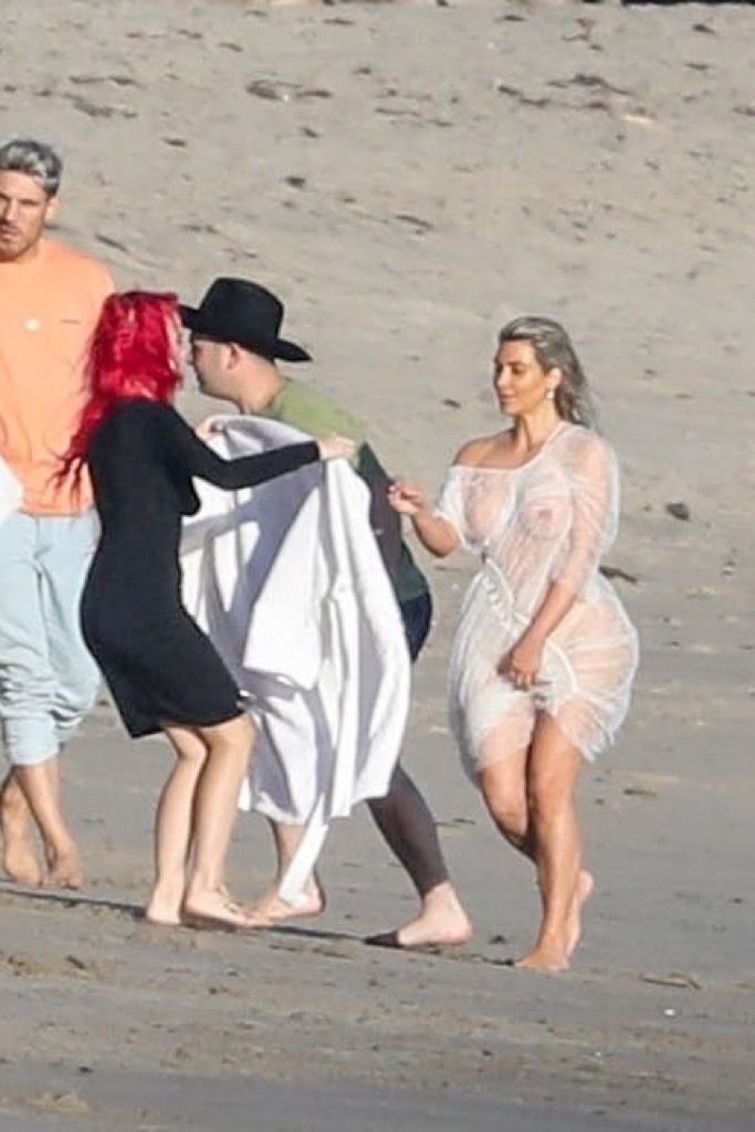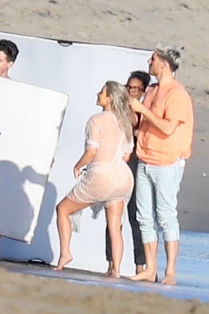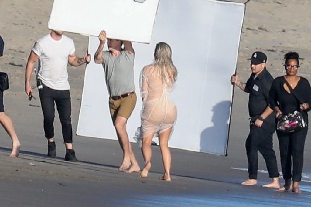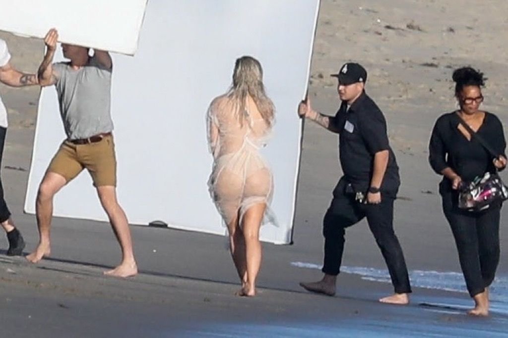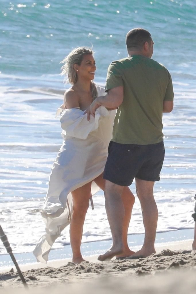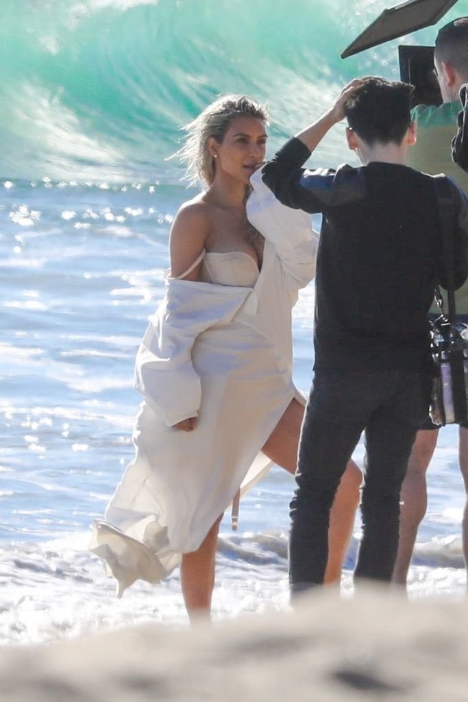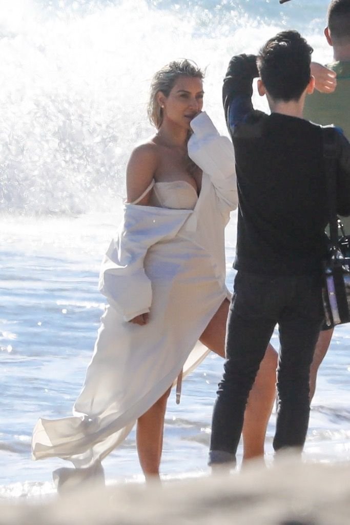 Телезвезда Ким Кардашьян, 37 лет, выглядит нелепо во время фотосессии на пляже в Малибу, 22.01.2018.