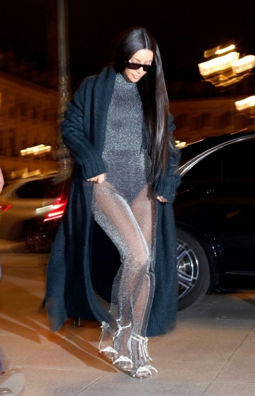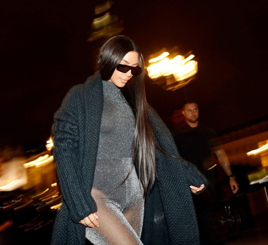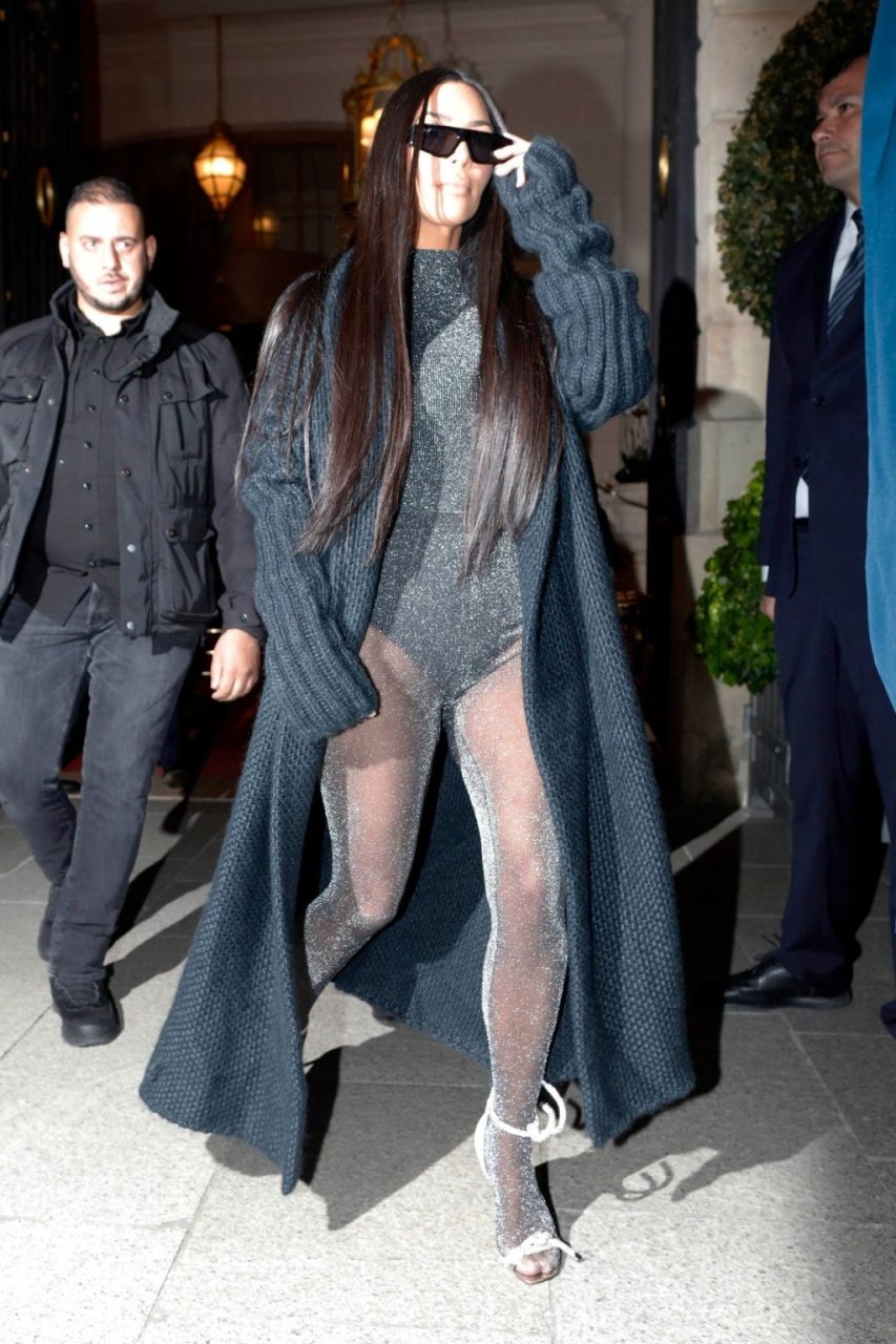 Ким Кардашьян запечатлена возвращающейся в свой отель в Париже после ужина в ресторане Ferdi. Звезда реалити-шоу была в вязаном макси-пальто и сверкающем сером комбинезоне.