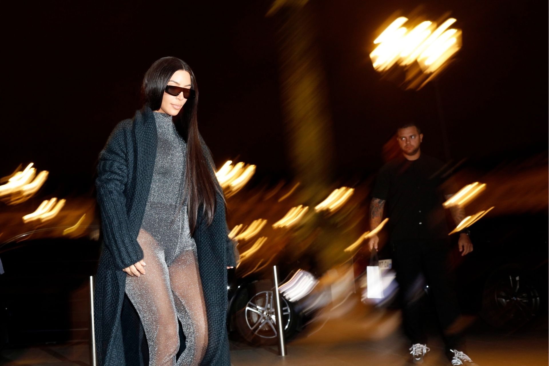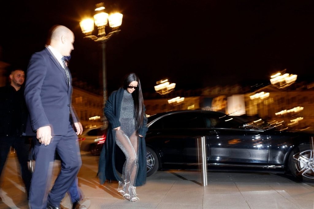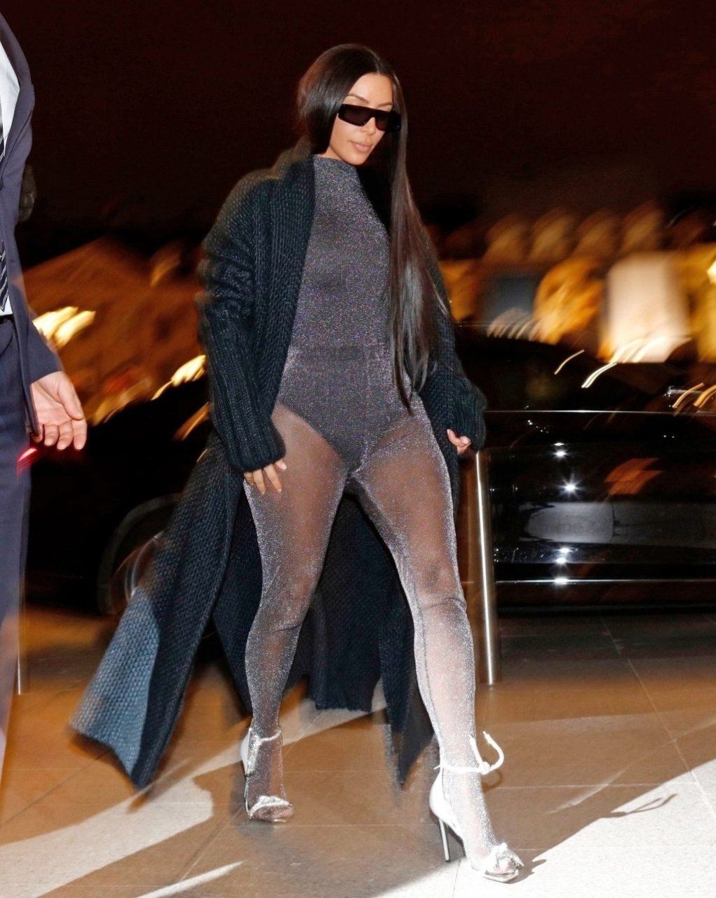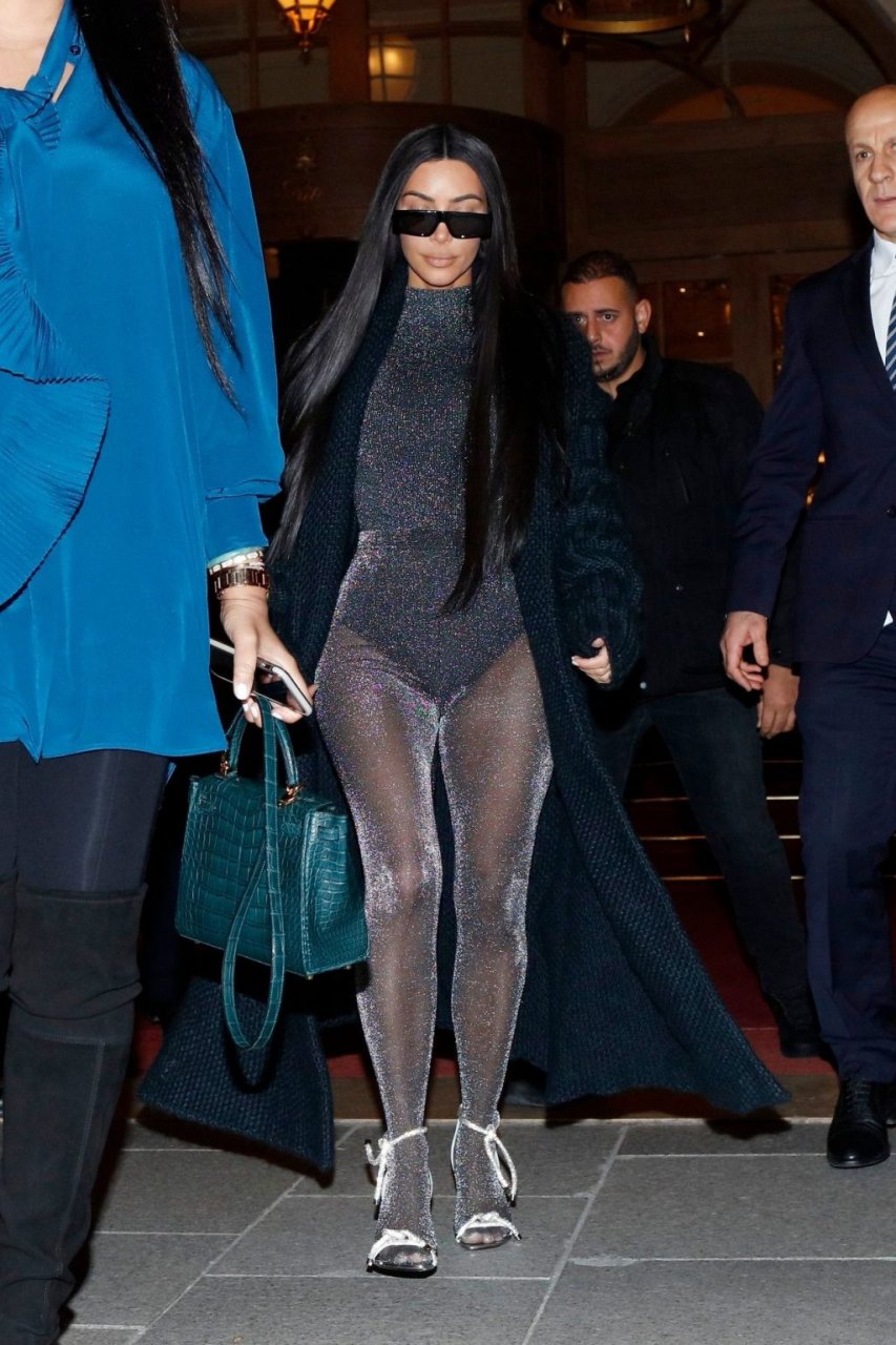 Ким Кардашьян запечатлена возвращающейся в свой отель в Париже после ужина в ресторане Ferdi. Звезда реалити-шоу была в вязаном макси-пальто и сверкающем сером комбинезоне.