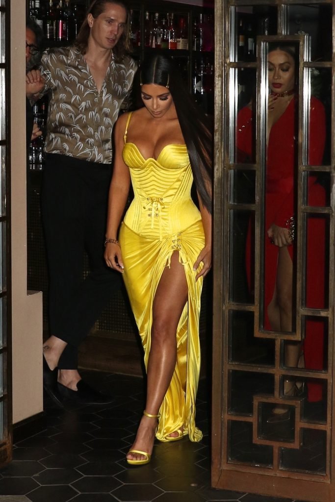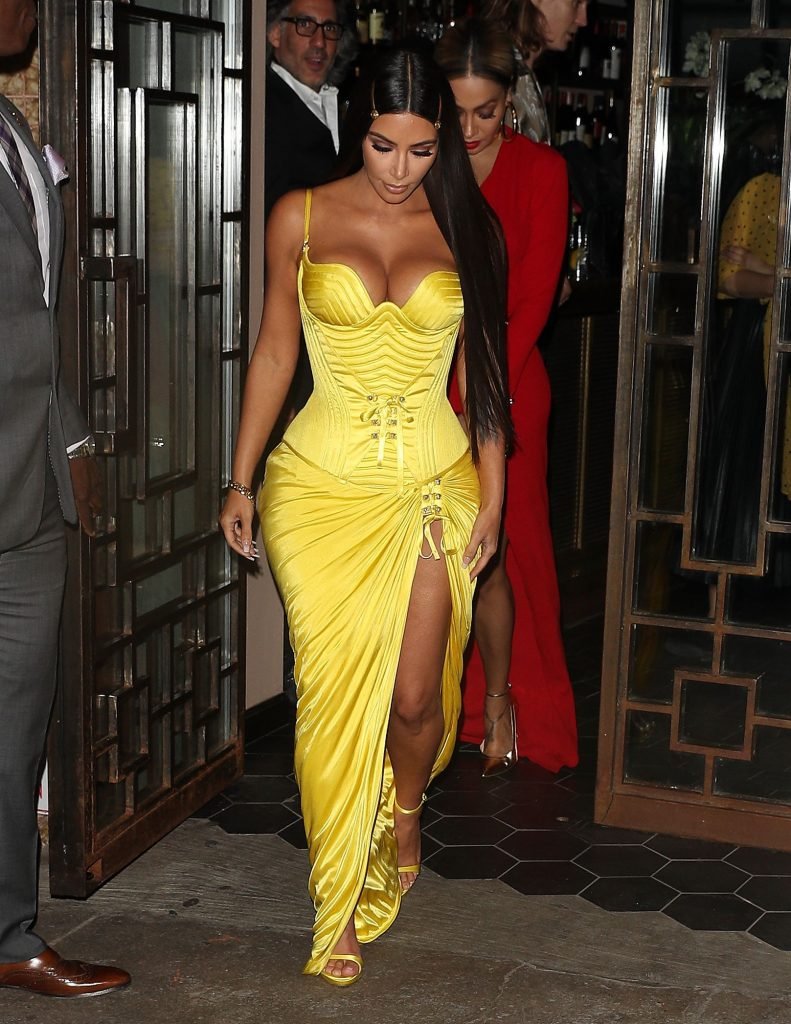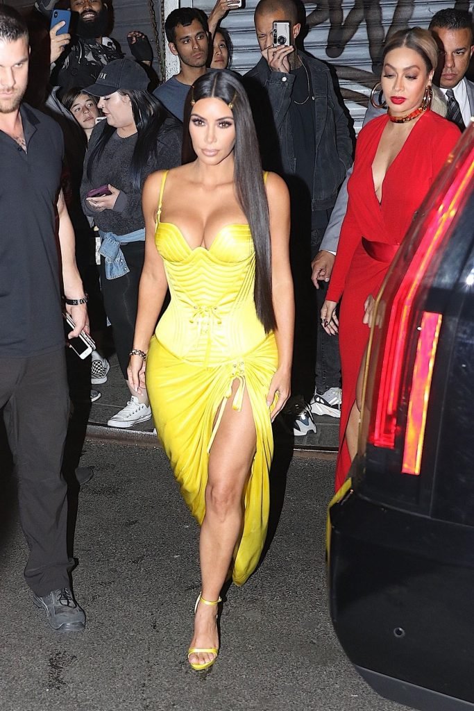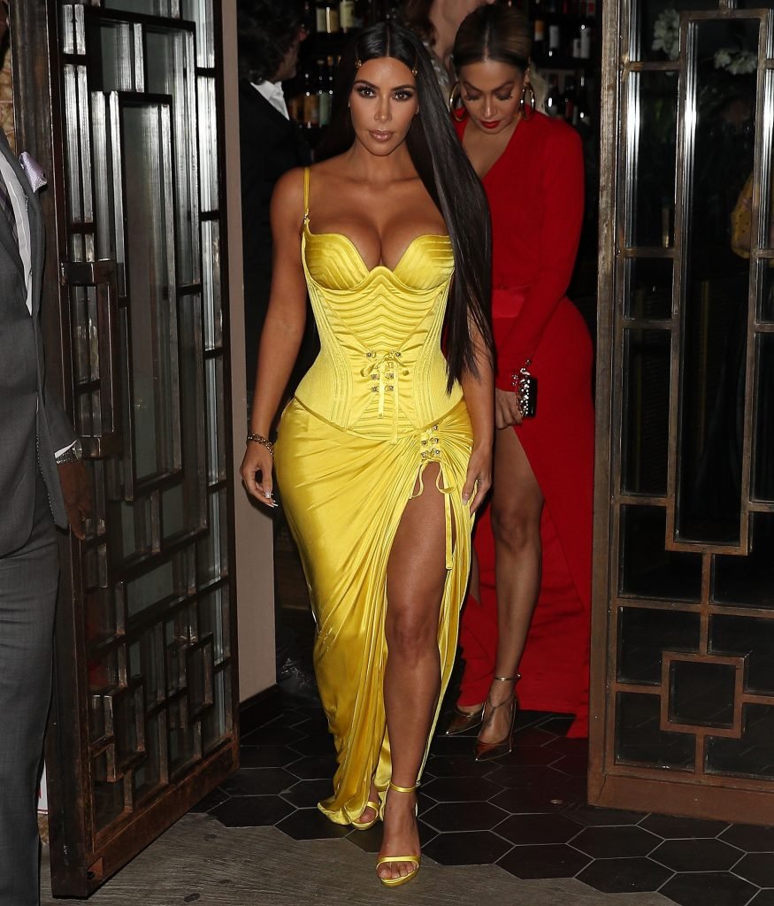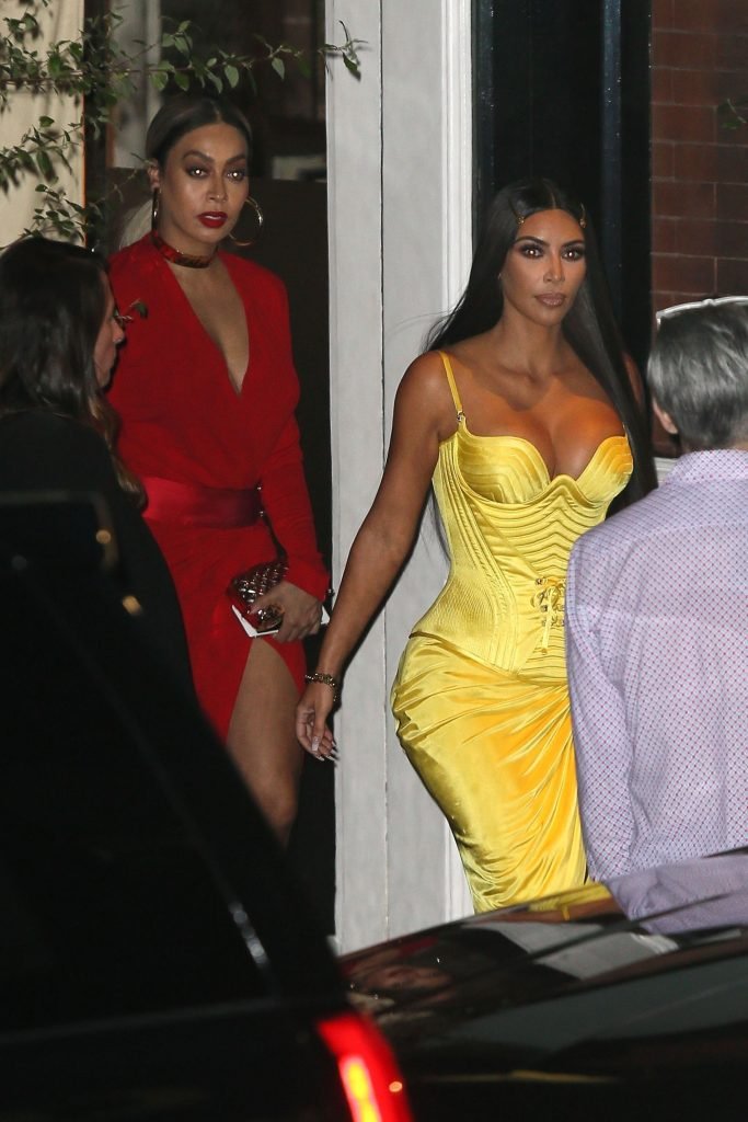 Ким Кардашьян, 37 лет, угощает Кайли Дженнер, Ла Ла Энтони и Джордин Вудс ужином в Нью-Йорке, 08.05.2018. Девушки все выглядели стильно в облегающих ярких платьях для своего ужина.