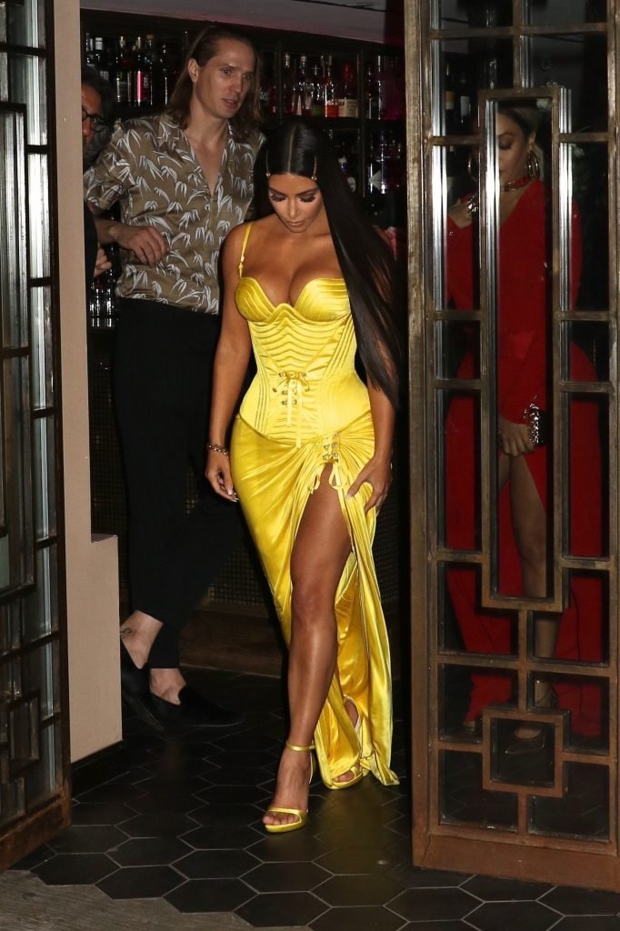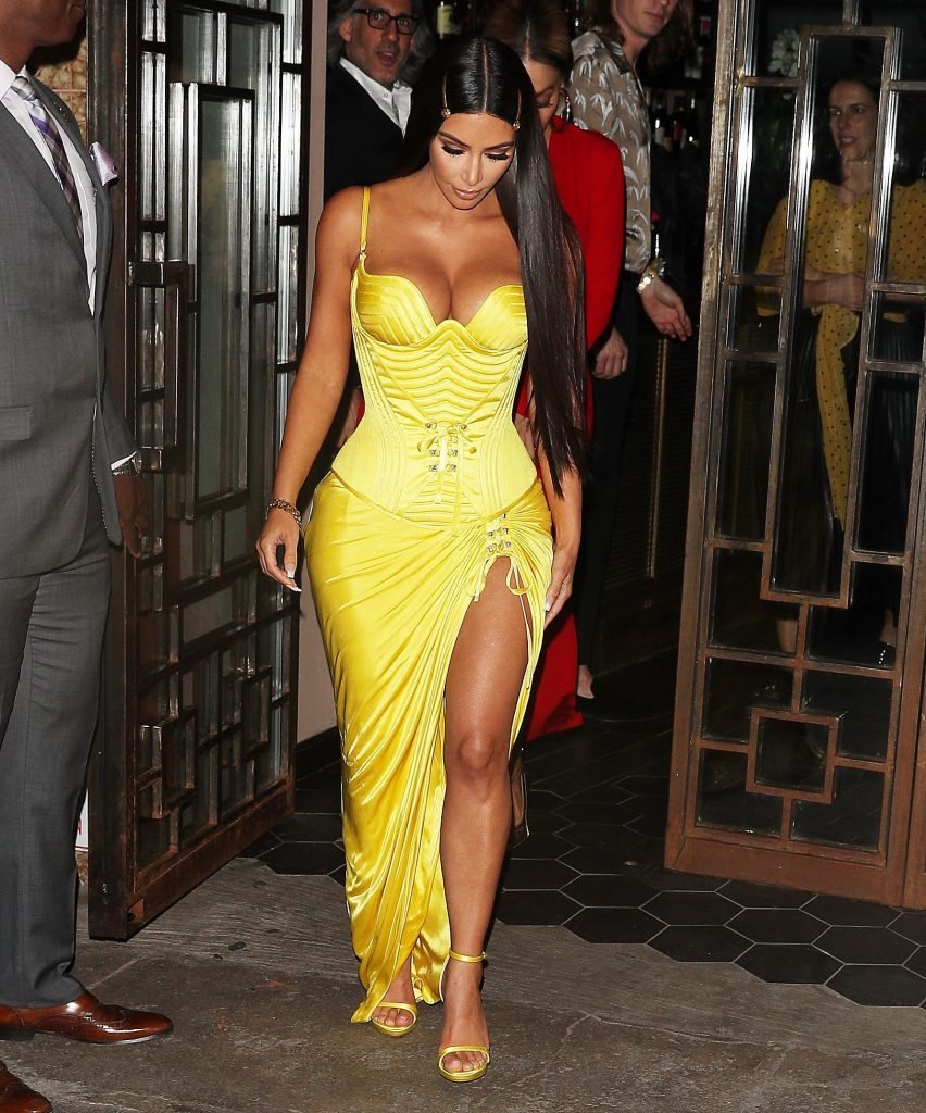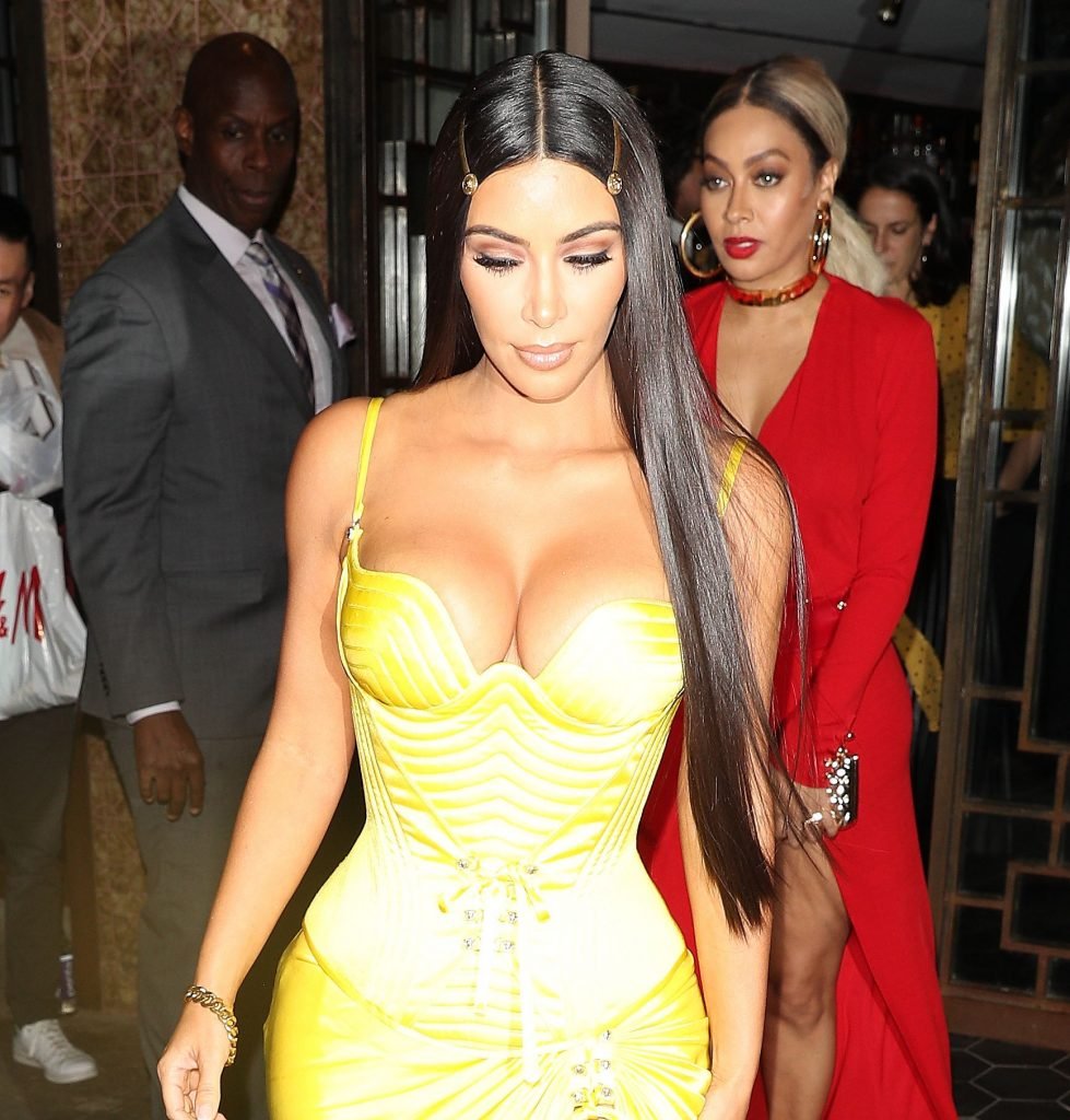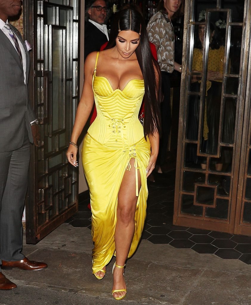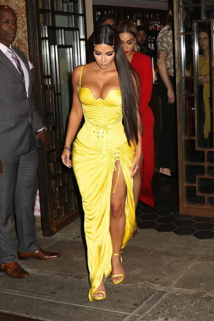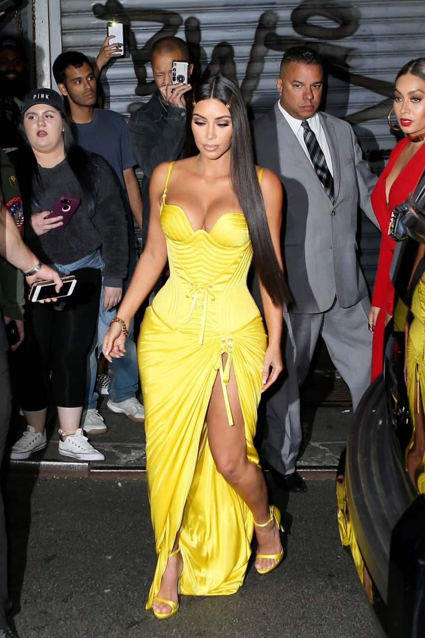 Ким Кардашьян, 37 лет, угощает Кайли Дженнер, Ла Ла Энтони и Джордин Вудс ужином в Нью-Йорке, 08.05.2018. Девушки все выглядели стильно в облегающих ярких платьях для своего ужина.