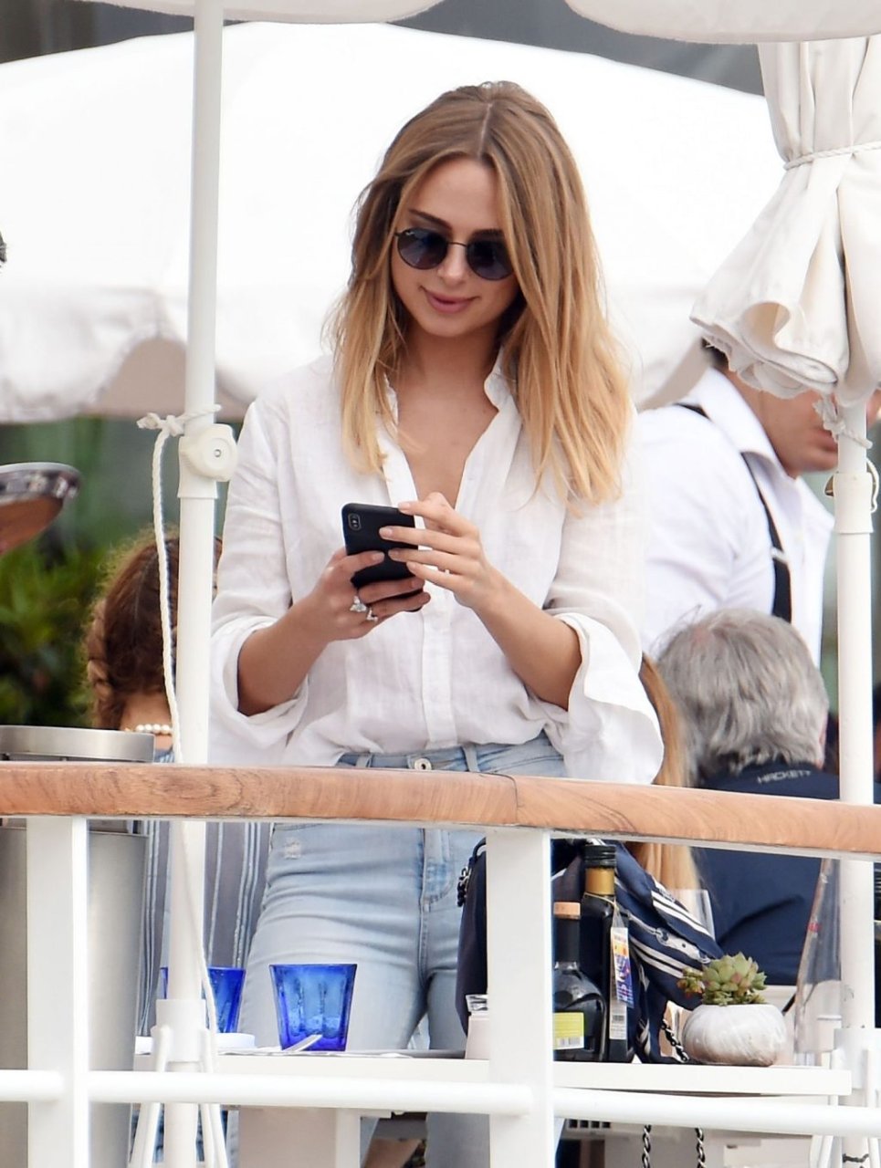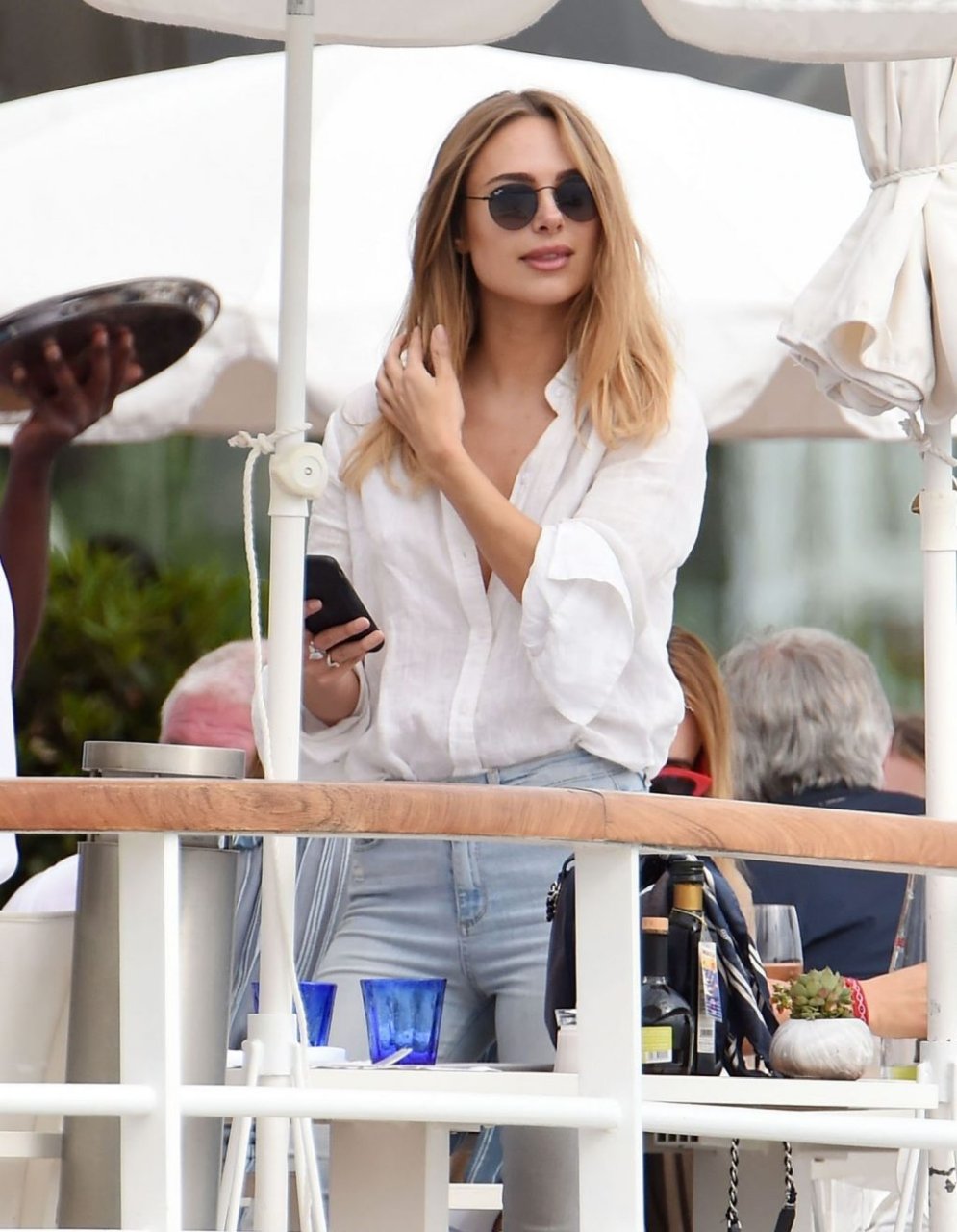 Модель Кимберли Гарнер была сфотографирована без бюстгальтера в отеле Eden Roc Resort во время 72-го Каннского кинофестиваля, 24.05.2019.