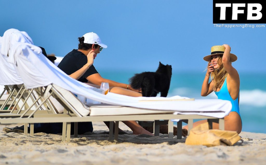 Модель и дизайнер купальников Кимберли Гарнер демонстрирует свою невероятную фигуру в облегающем синем купальнике, резвясь в море во время поездки в Майами, 19.12.2021.