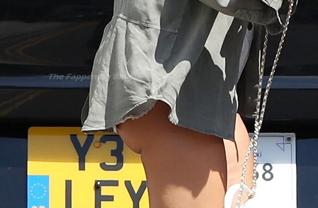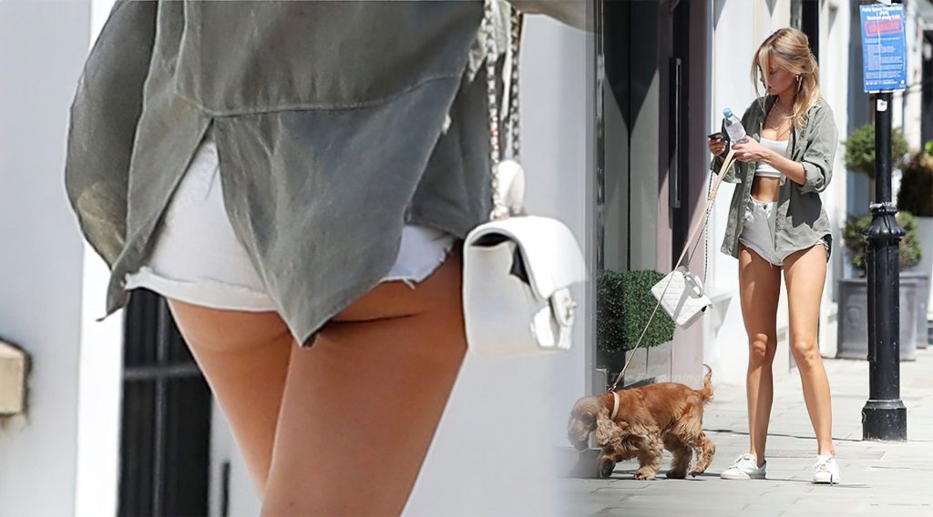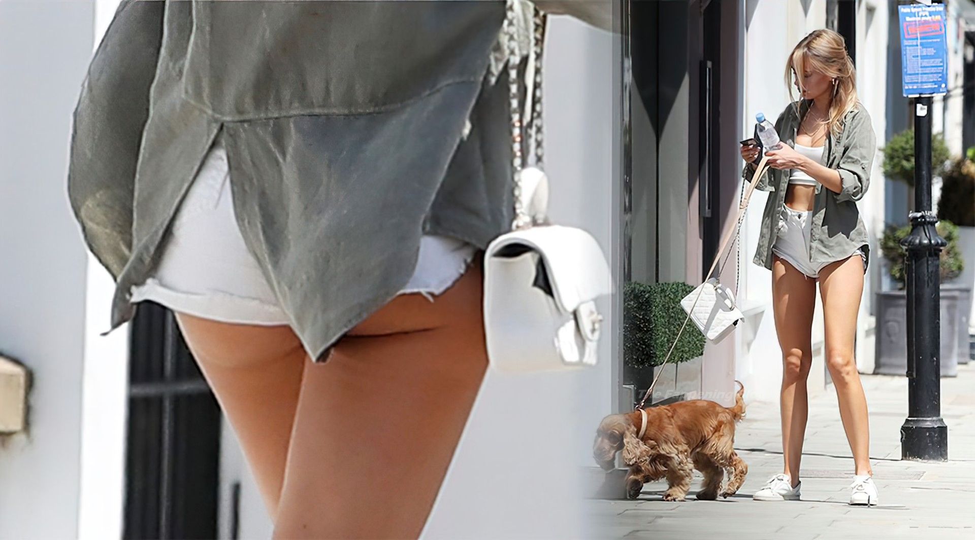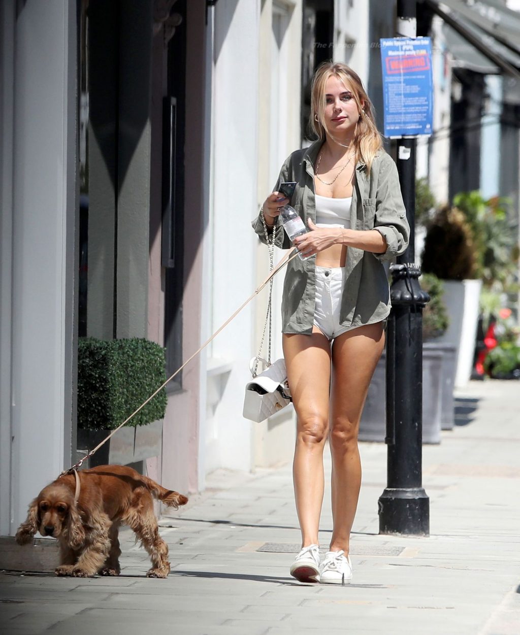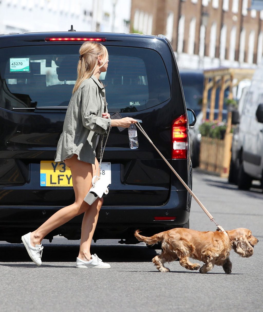 Длинноногая модель и дизайнер купальников Кимберли Гарнер замечена во время прогулки с собакой в Западном Лондоне, 06/02/2021.