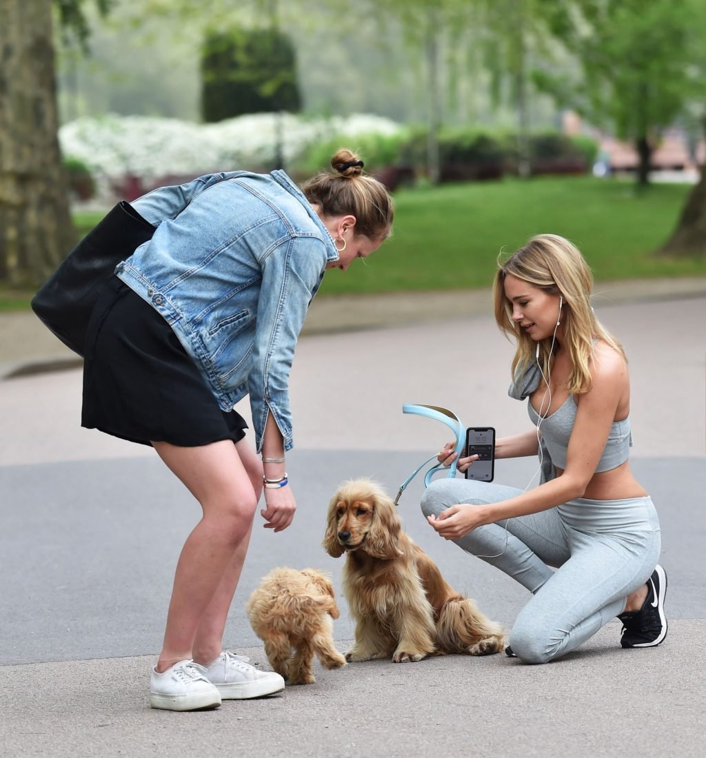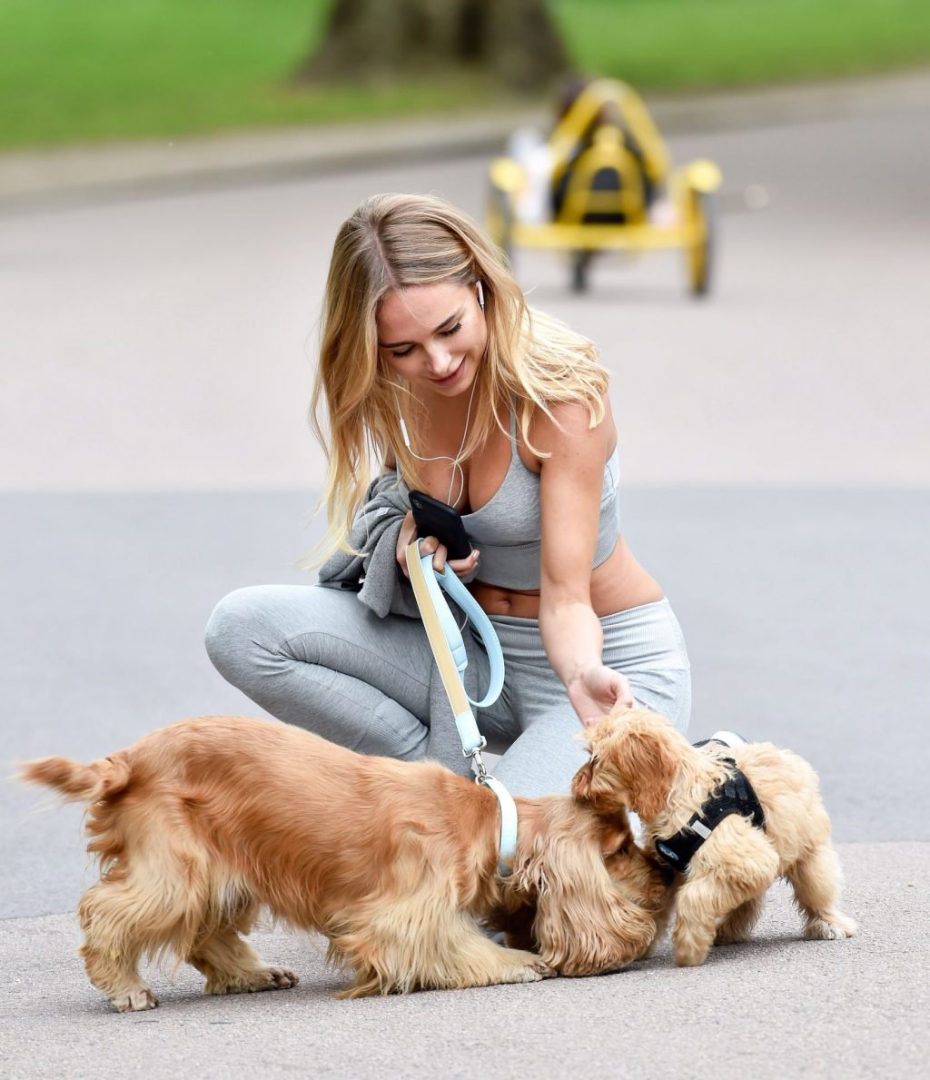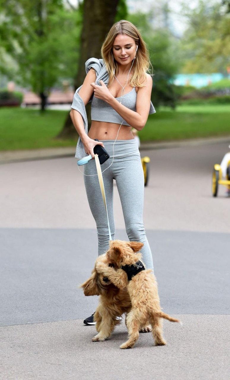 Кимберли Гарнер занимается спортом в Баттерси-парке, Лондон, 24.04.2019. Ее видели в серой майке и леггинсах, подчеркивающих декольте.