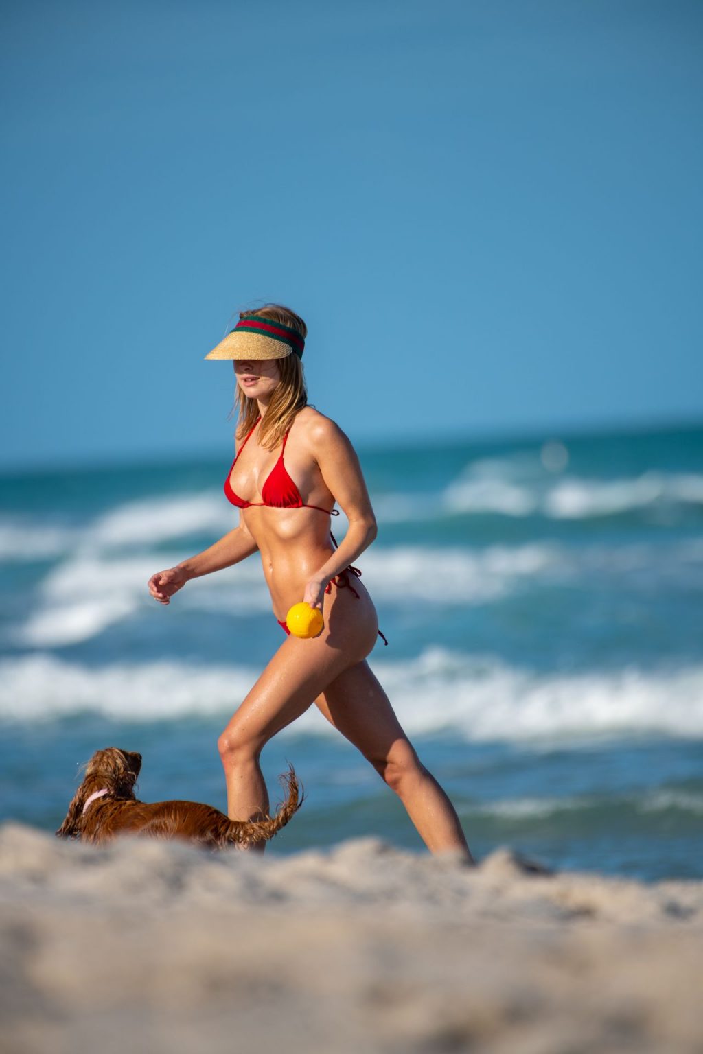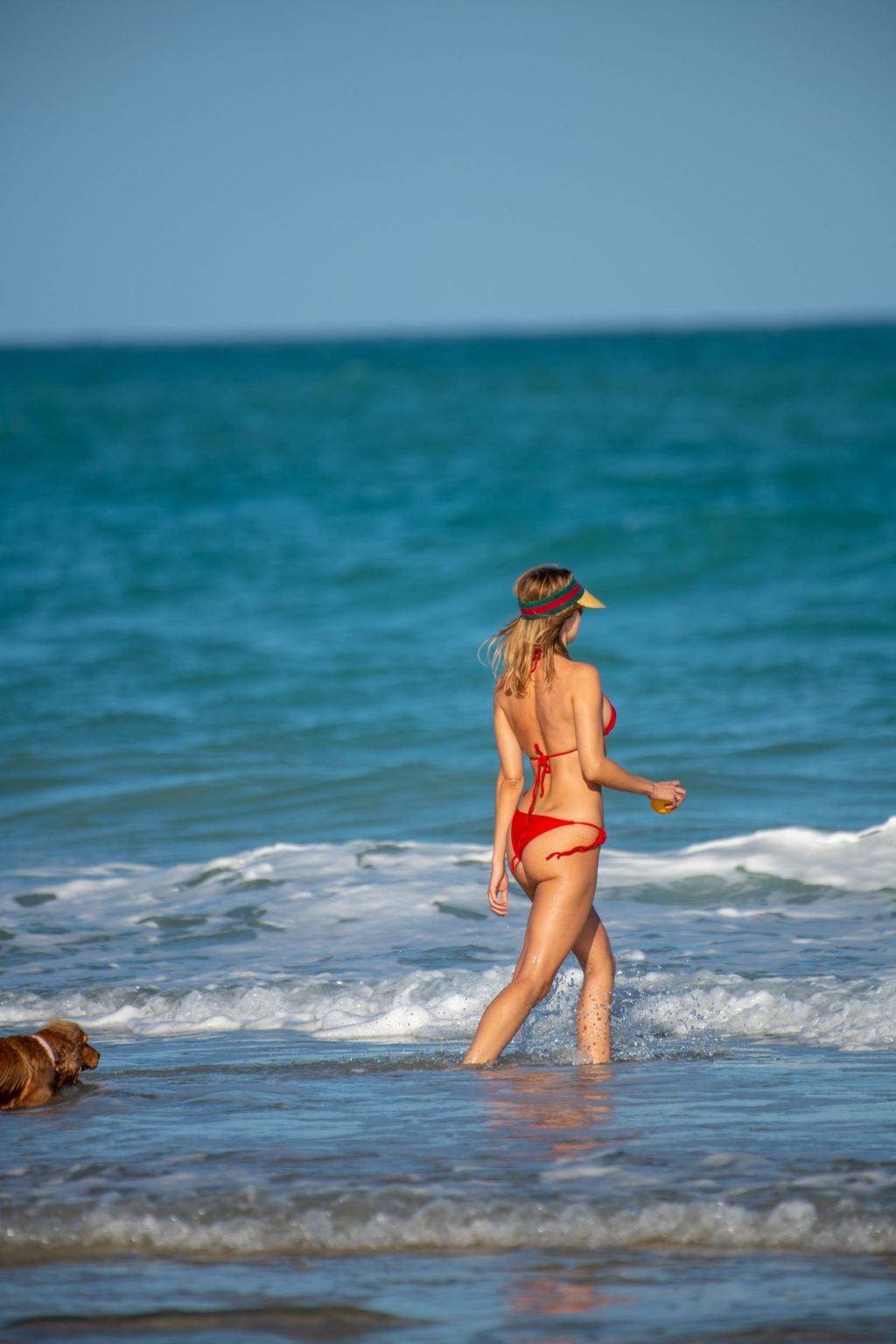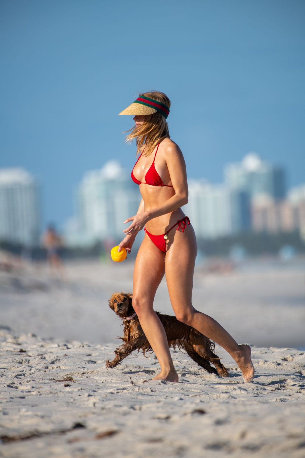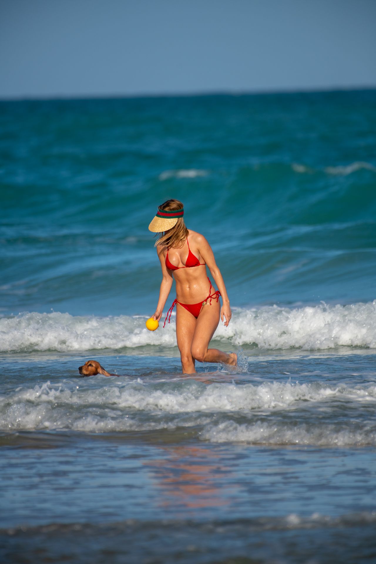 Кимберли Гарнер наслаждается днем с собакой на пляже в Майами, 14.01.2020. На ней красный купальник и козырек Gucci.