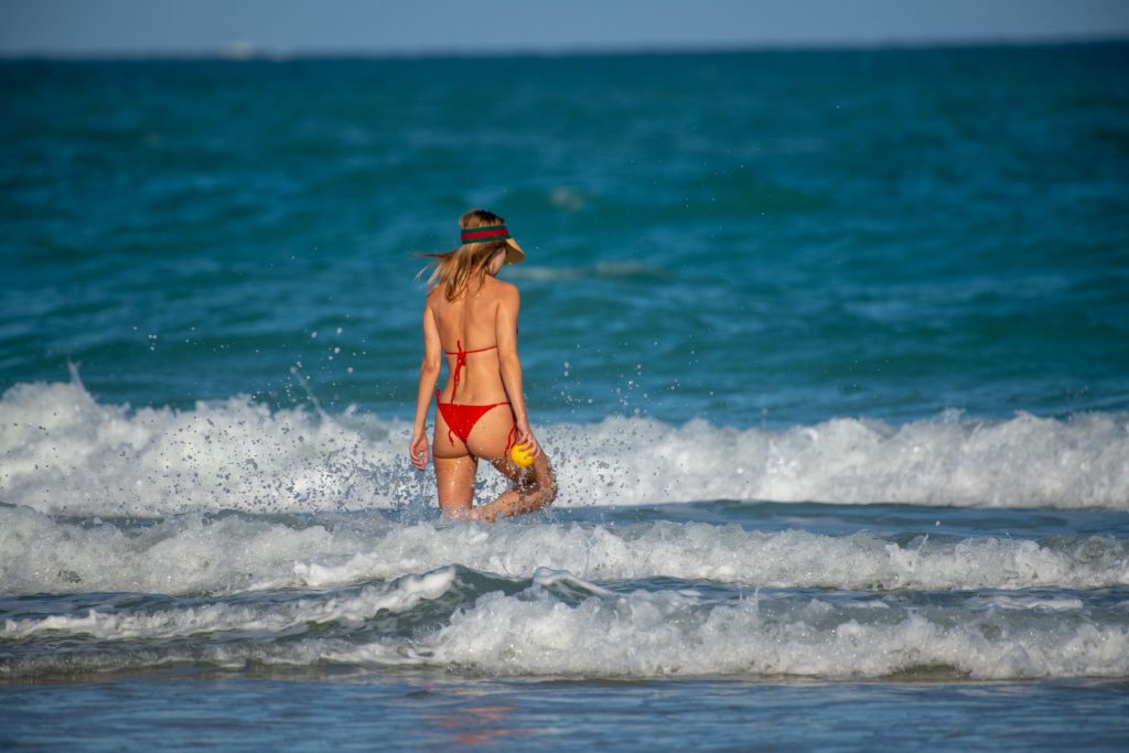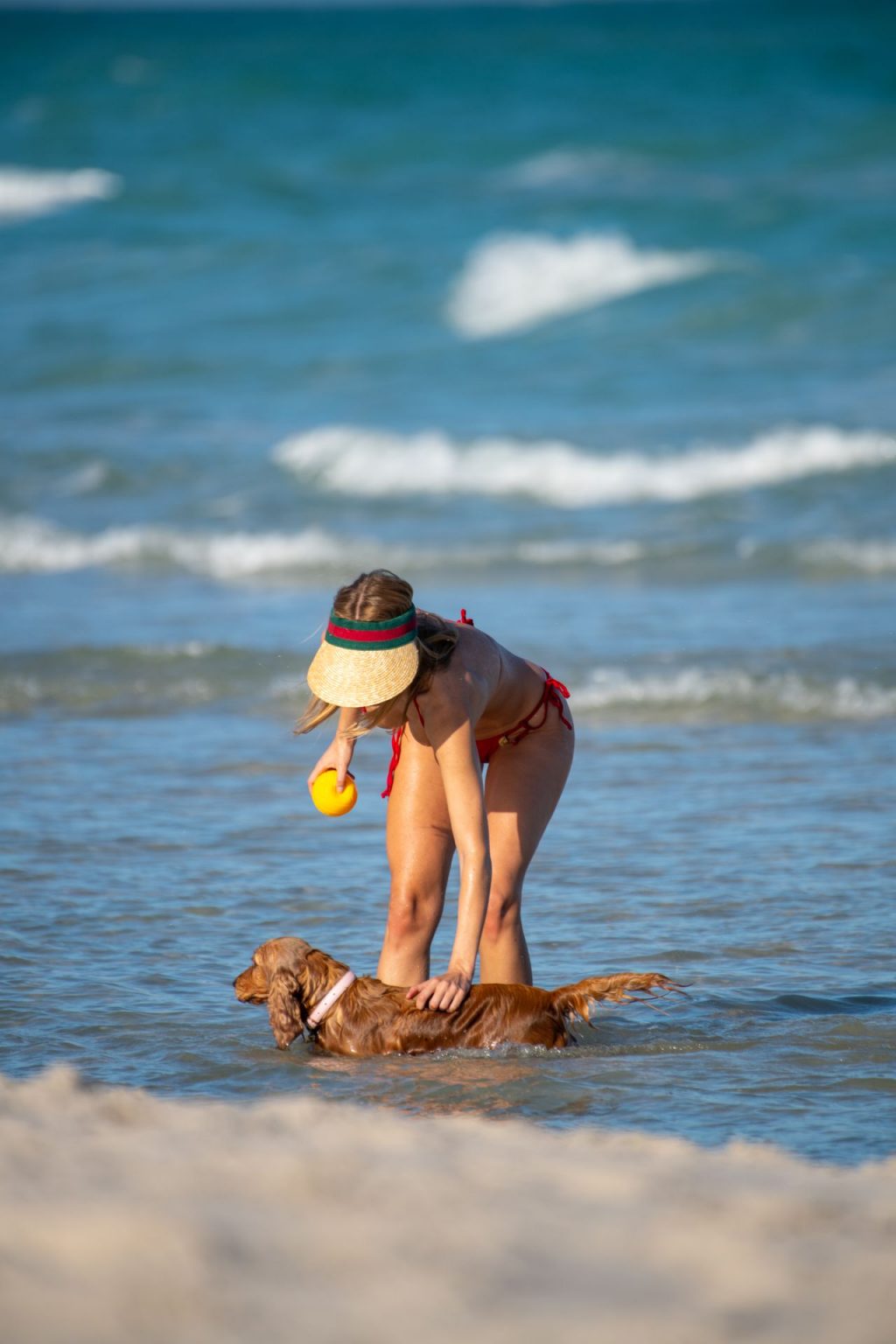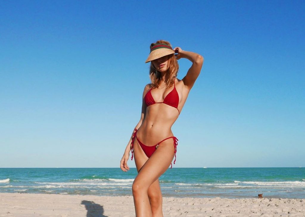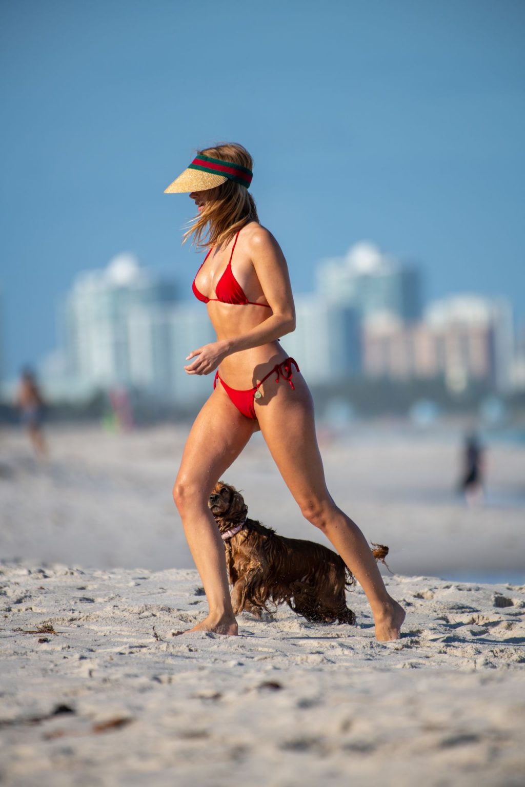 Кимберли Гарнер наслаждается днем с собакой на пляже в Майами, 14.01.2020. На ней красный купальник и козырек Gucci.