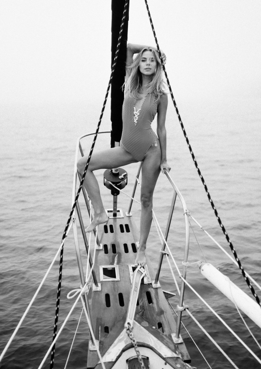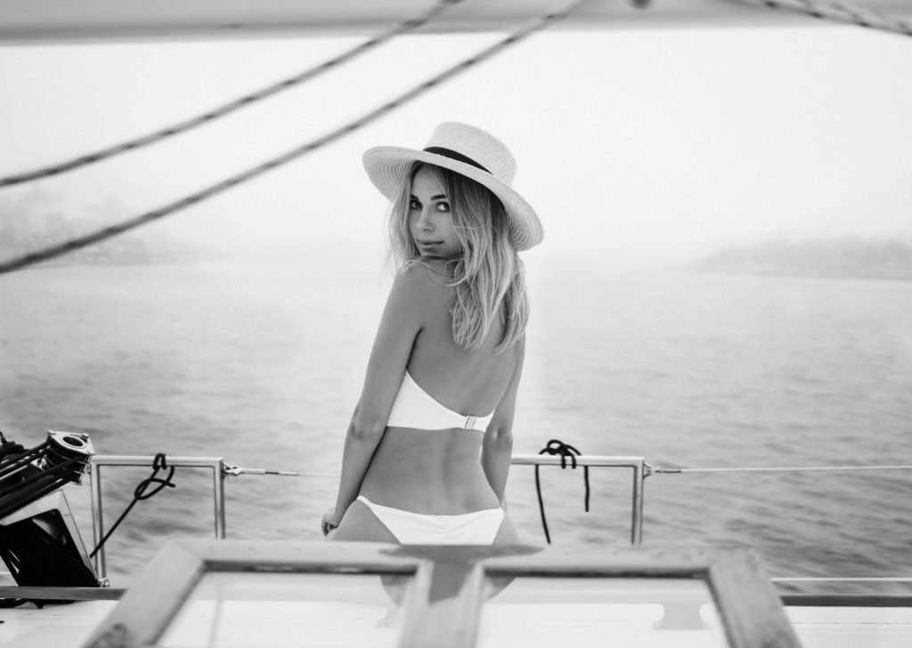 Вот черно-белые сексуальные фотографии Ким Гарнер без обнажения. Потрясающая красавица демонстрирует свою новую коллекцию купальников “Kimberley London” в Майами на яхте, 28.01.2019.