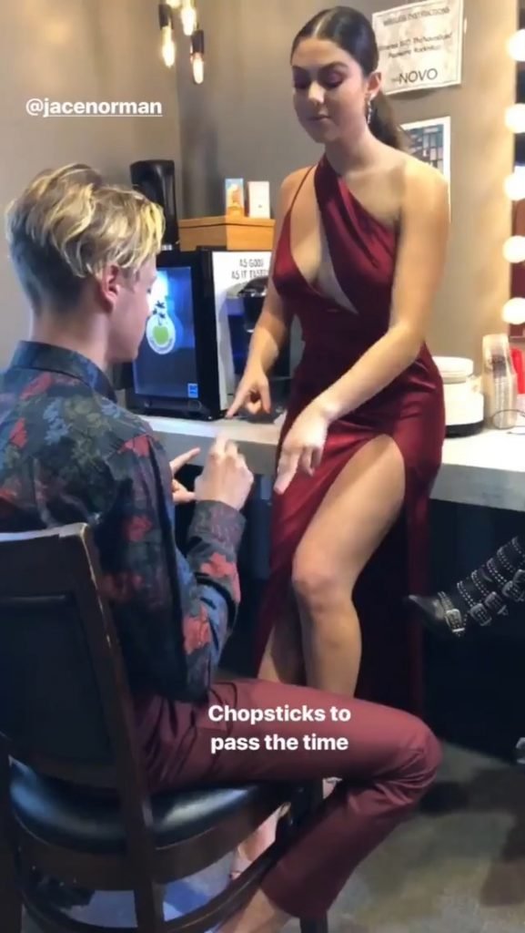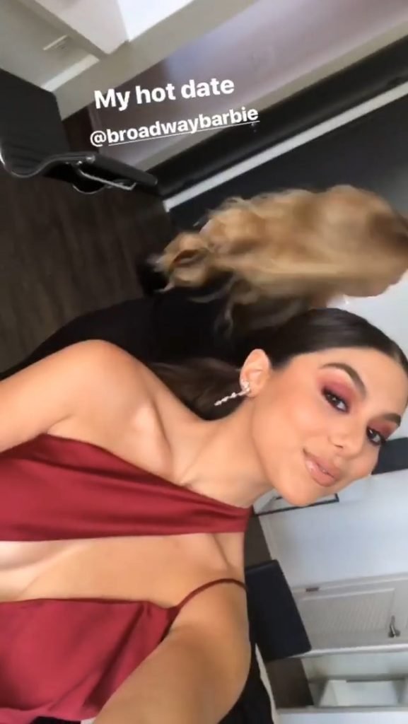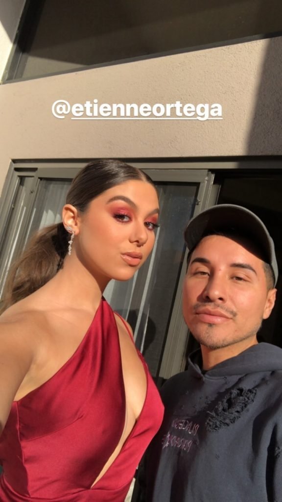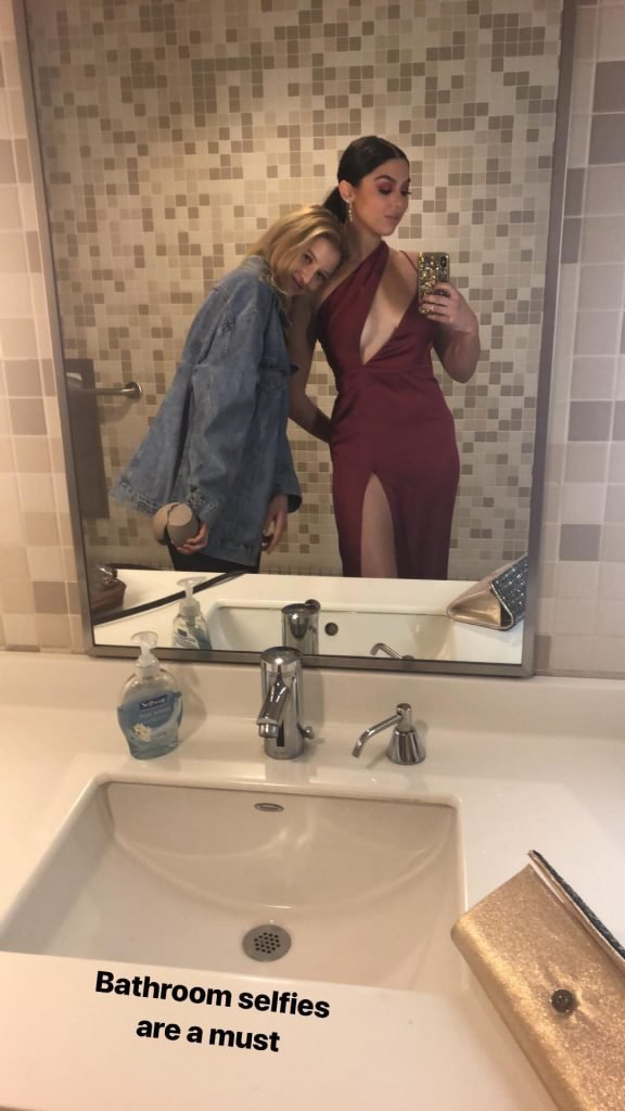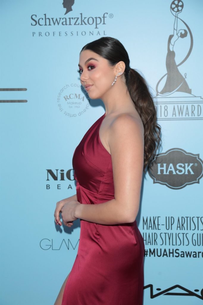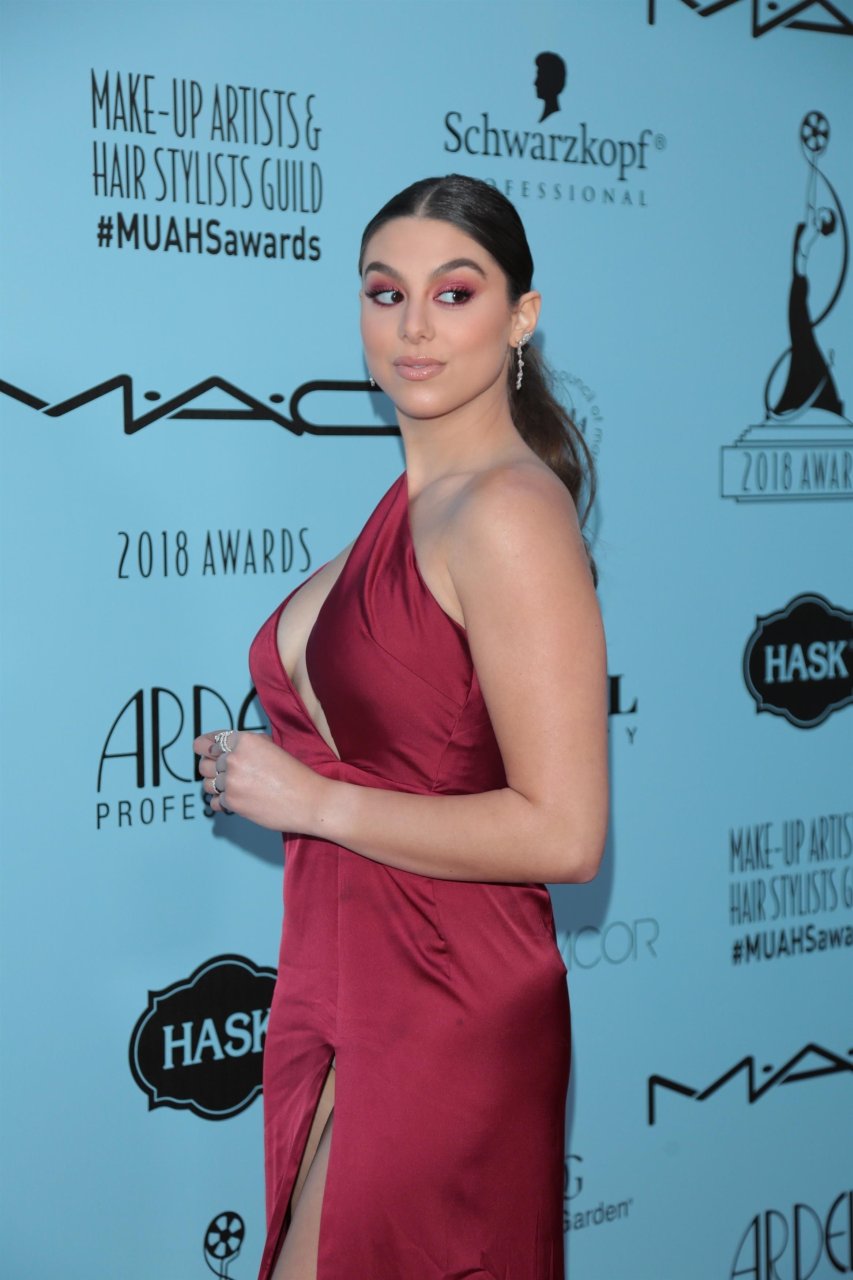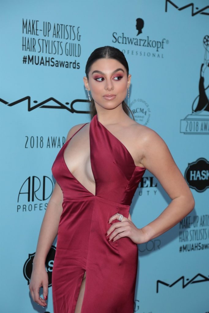 Кира Косарин носит красное платье без бюстгальтера на церемонии награждения The Make-Up Artists and Hair Stylists Guild Awards в Лос-Анджелесе, 24.02.2018. Кира Косарин — актриса и певица. Возраст – 20 лет.