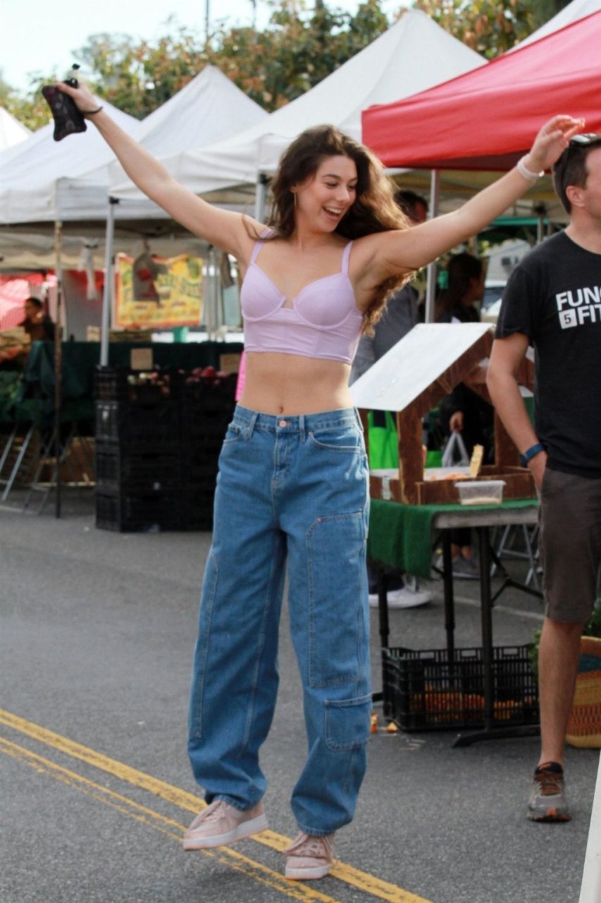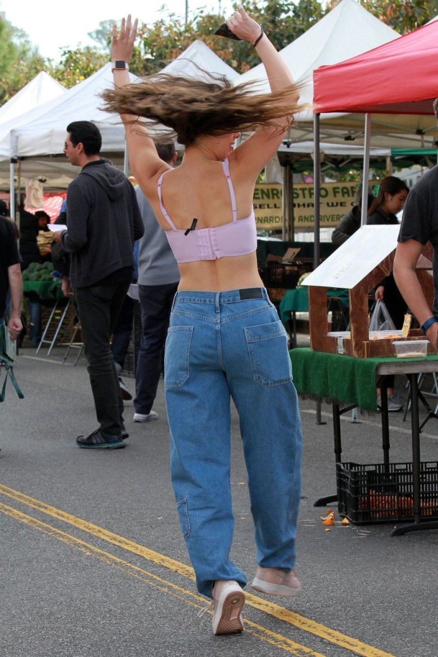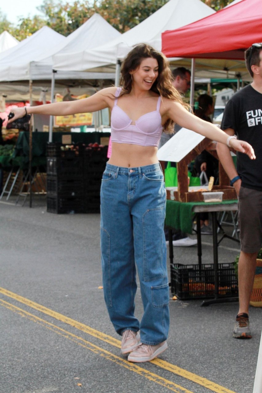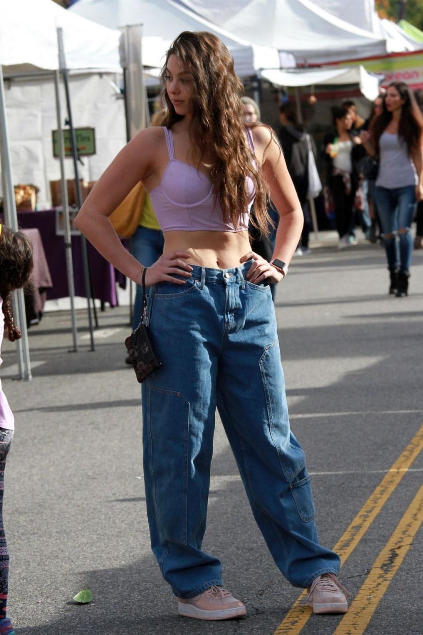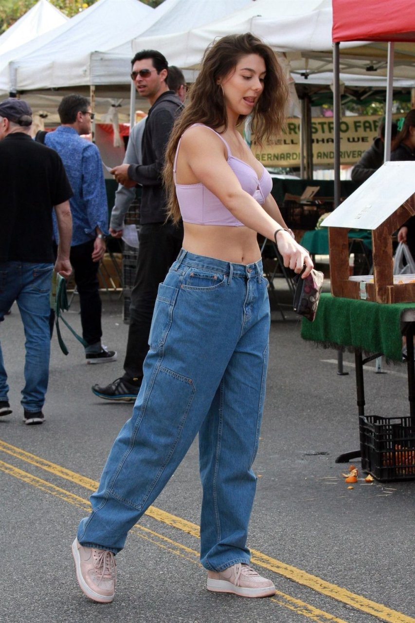 Актриса Кира Косарин демонстрирует свою подтянутую фигуру, делая покупки на фермерском рынке в Студио-Сити, 16.12.2018. Кира отлично выглядит в лавандовом корсетном бюстгальтере, джинсах с широкими штанинами и кроссовках.
