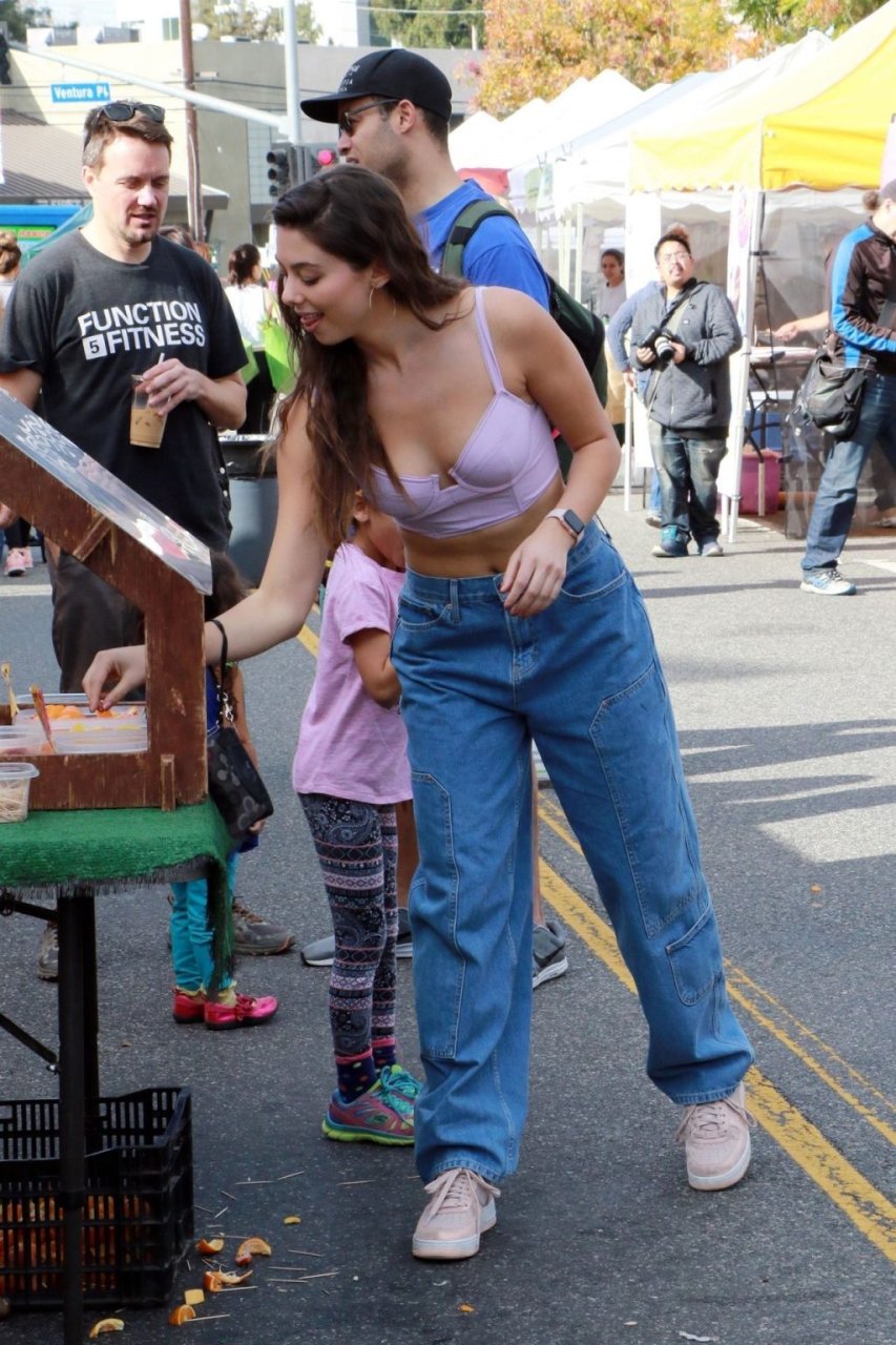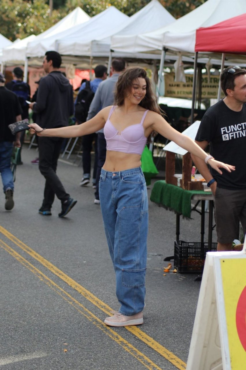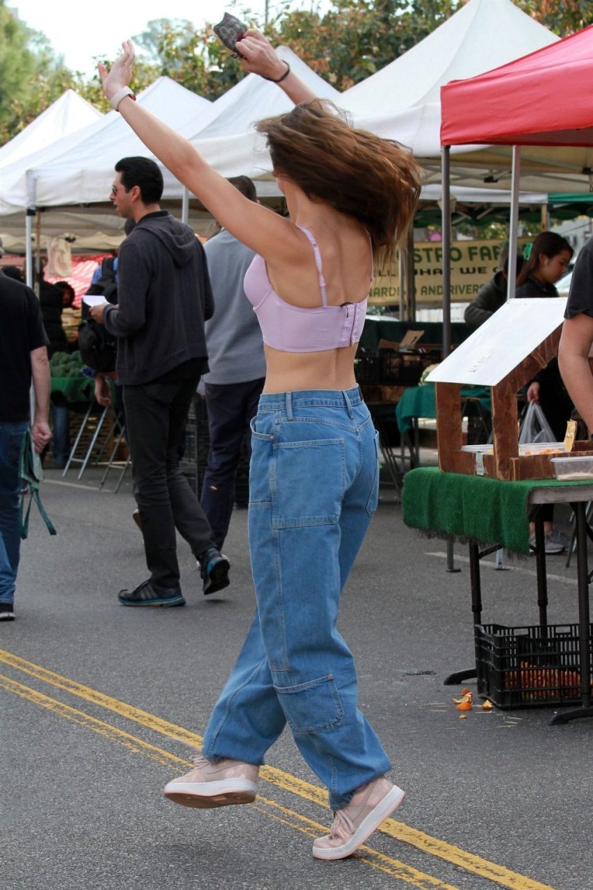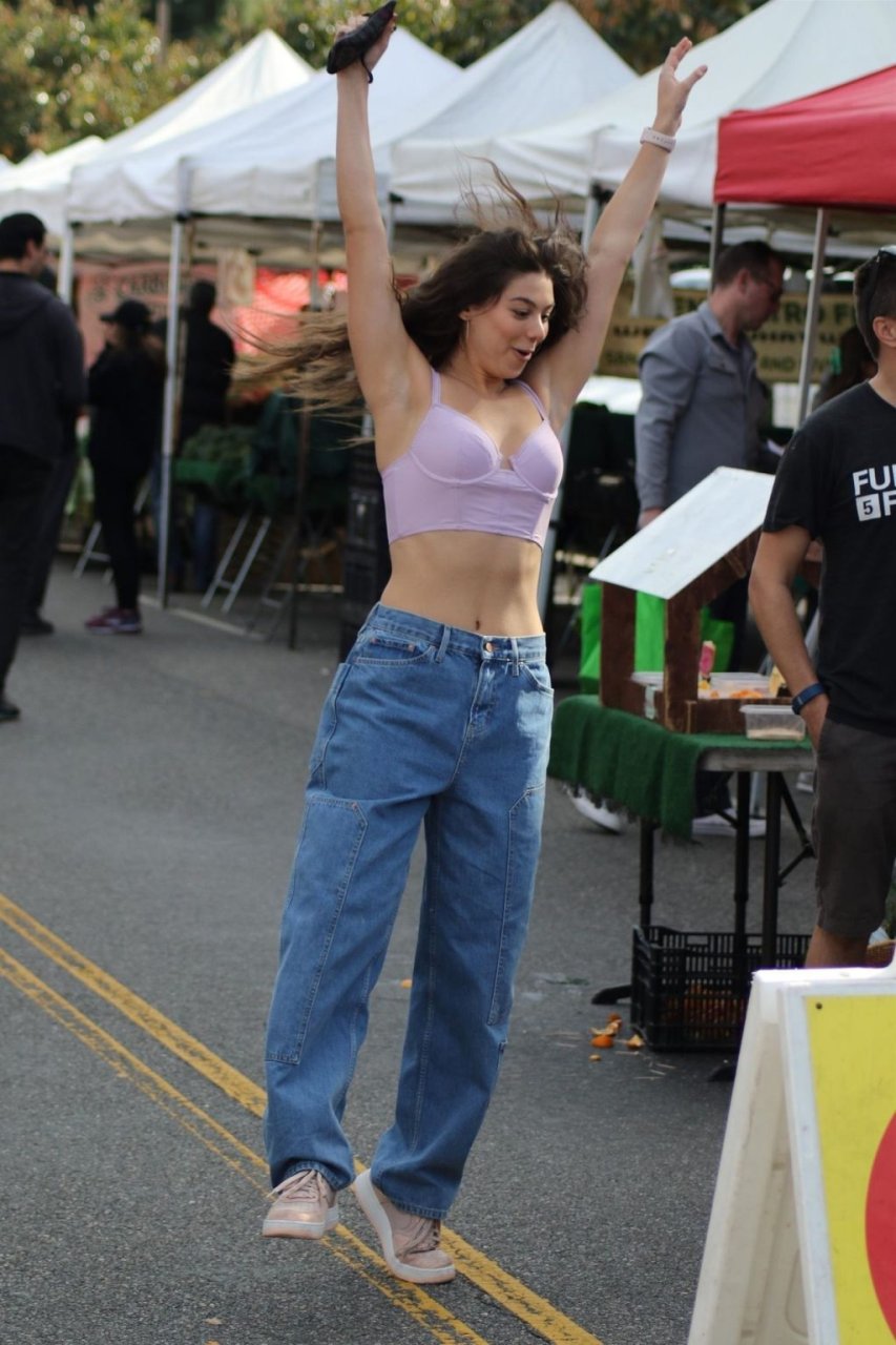 Актриса Кира Косарин демонстрирует свою подтянутую фигуру, делая покупки на фермерском рынке в Студио-Сити, 16.12.2018. Кира отлично выглядит в лавандовом корсетном бюстгальтере, джинсах с широкими штанинами и кроссовках.