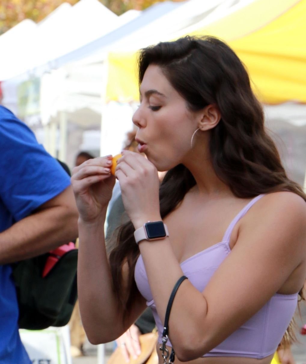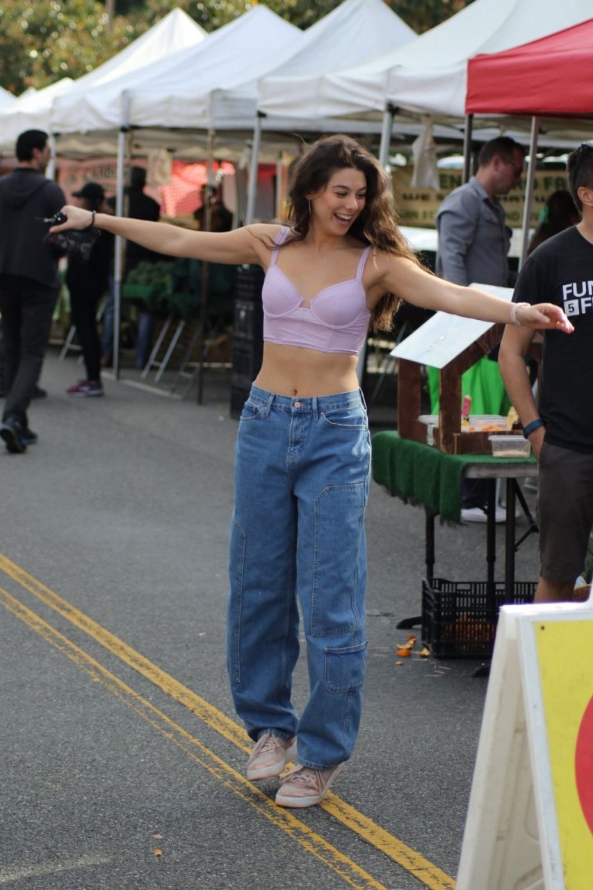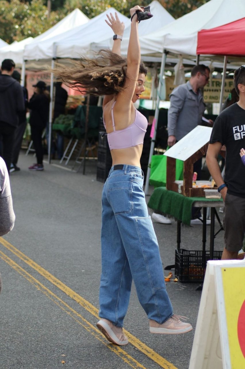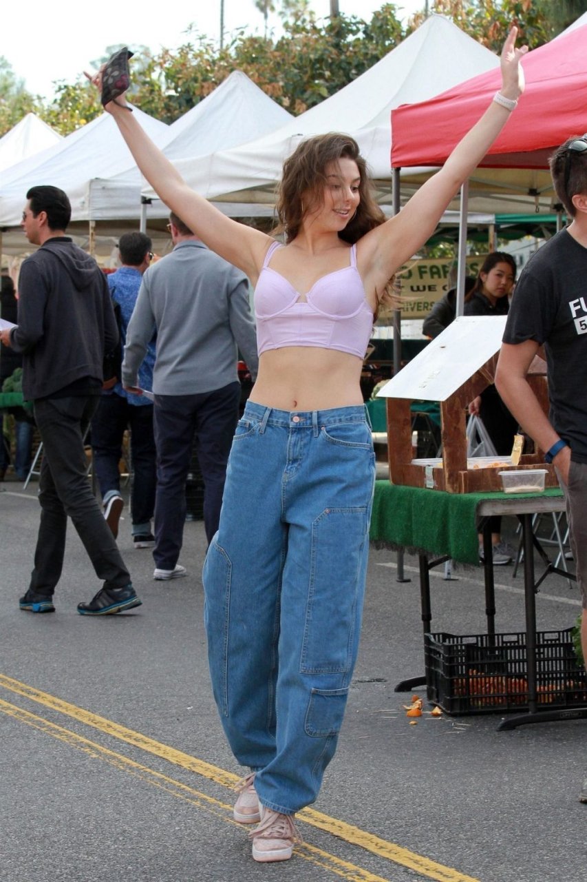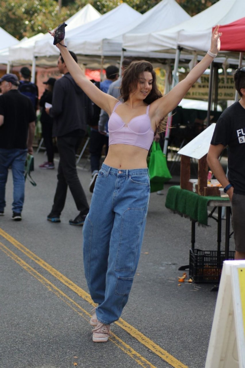 Актриса Кира Косарин демонстрирует свою подтянутую фигуру, делая покупки на фермерском рынке в Студио-Сити, 16.12.2018. Кира отлично выглядит в лавандовом корсетном бюстгальтере, джинсах с широкими штанинами и кроссовках.