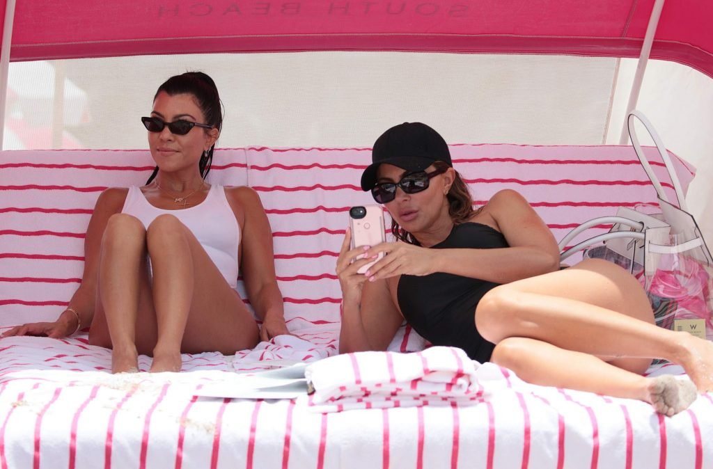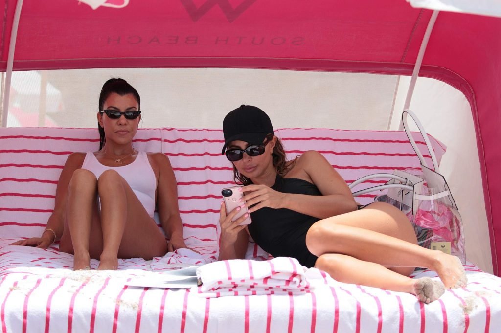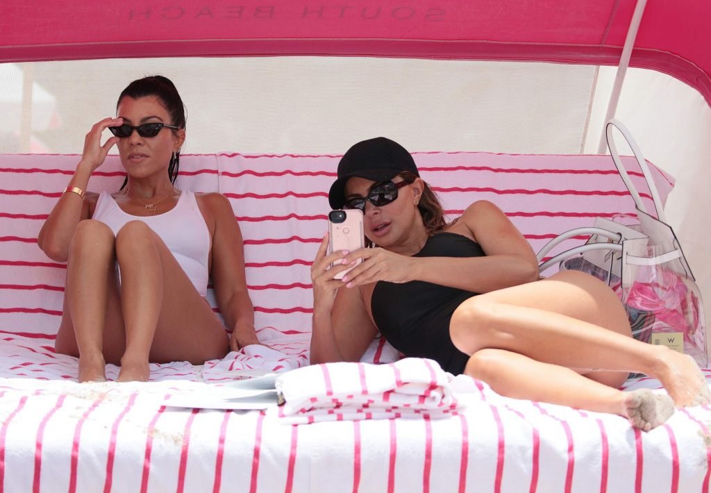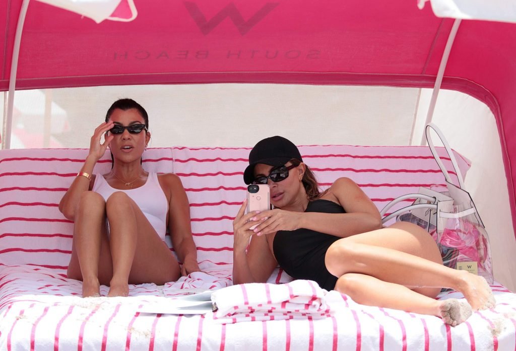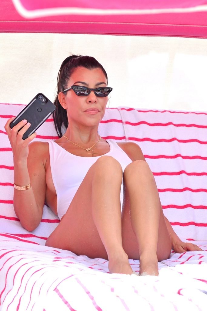 Кортни Кардашьян носит белый цельный купальник на пляже в Майами, 11.06.2017. Кортни Мэри Кардашьян — американская звезда ТВ шоу «Семейство Кардашьян», модель, светская львица. Возраст – 38.