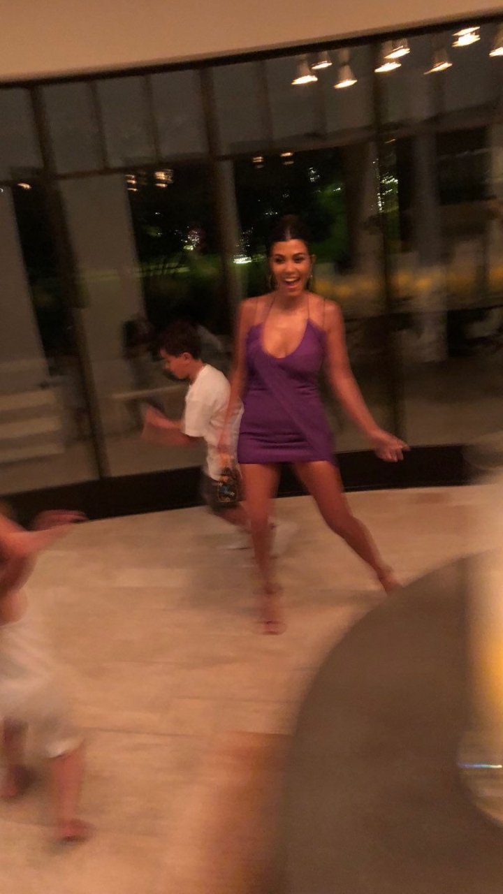 Кортни Кардашьян прибывает на вечеринку по случаю 21-го дня рождения младшей сестры Кайли Дженнер в Вест-Голливуде, 09.08.2018. Кортни Кардашьян (39) продемонстрировала свои сексуальные ноги и декольте в фиолетовом платье.