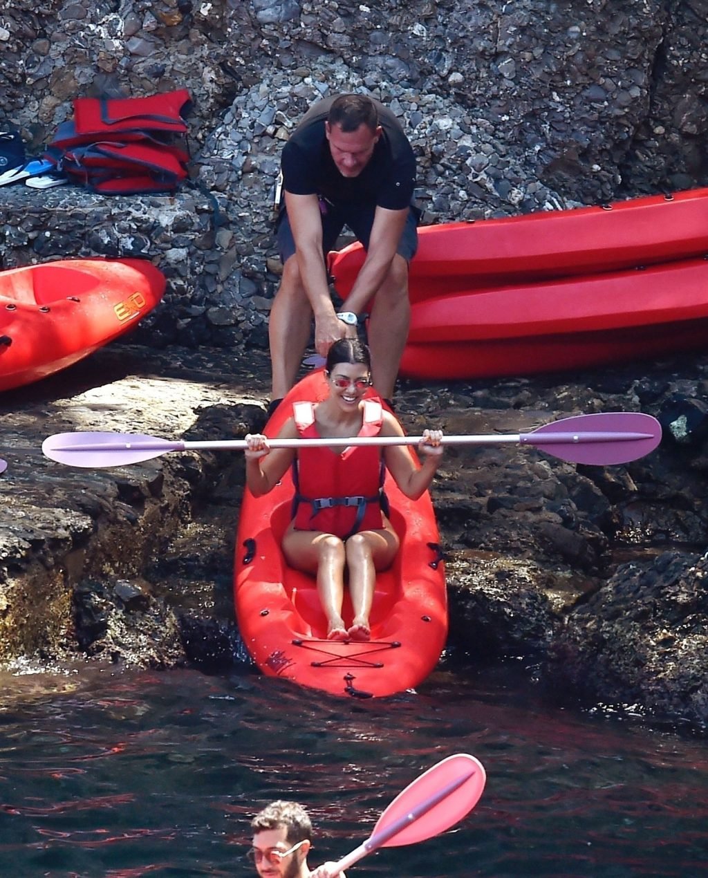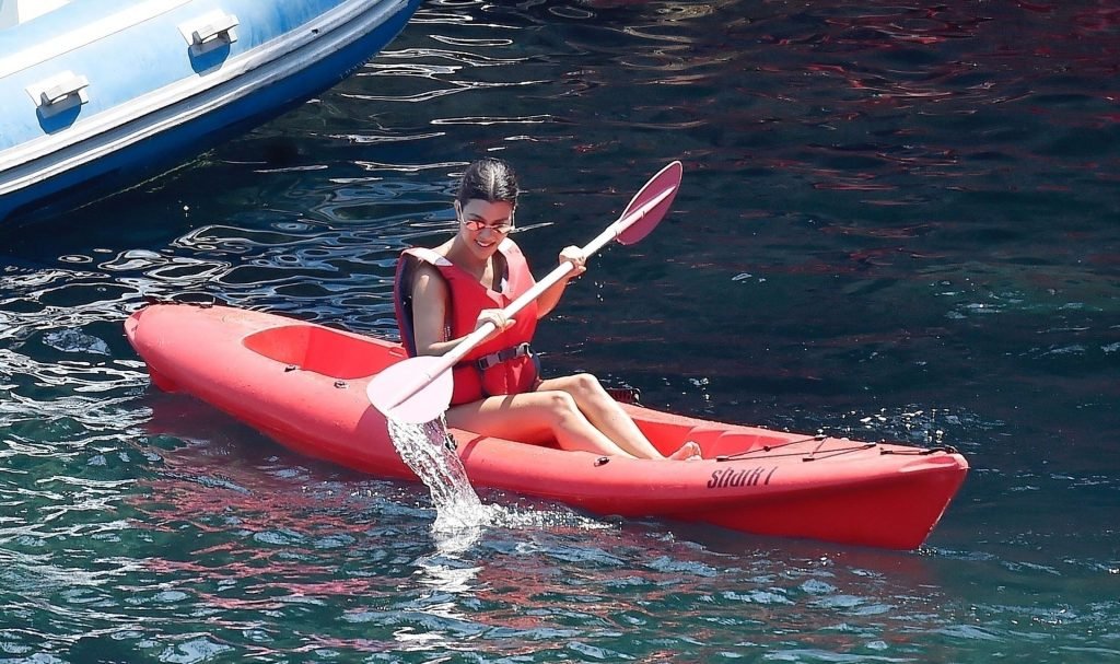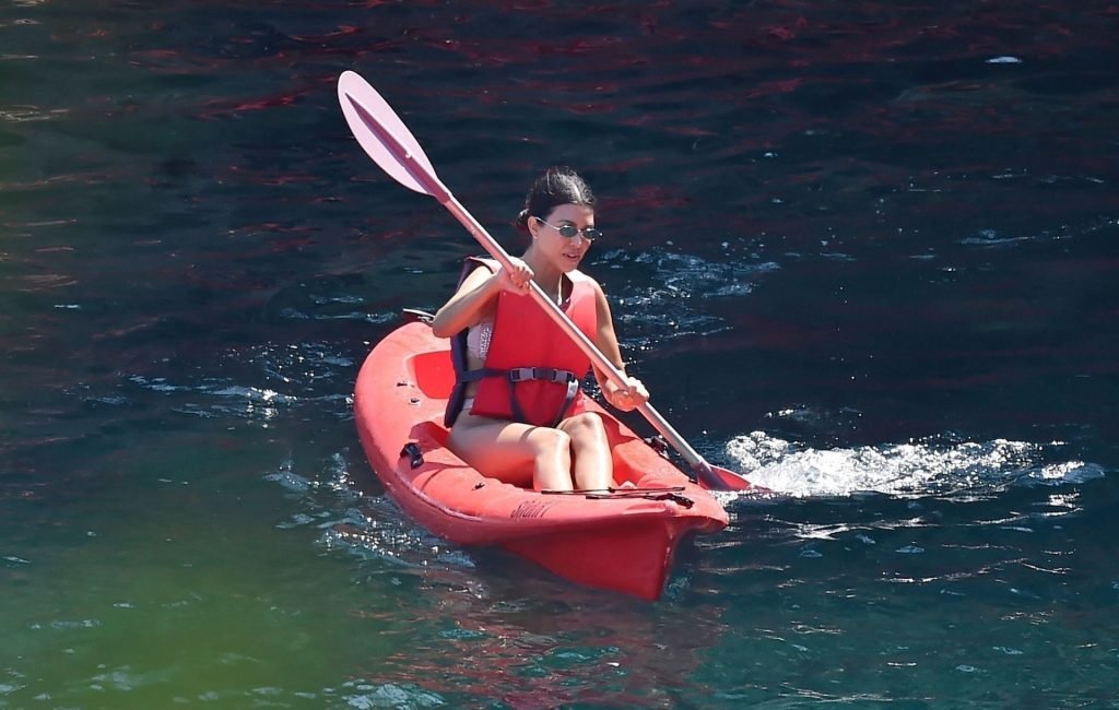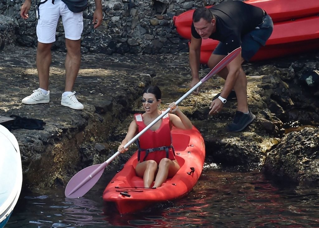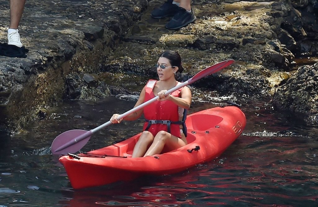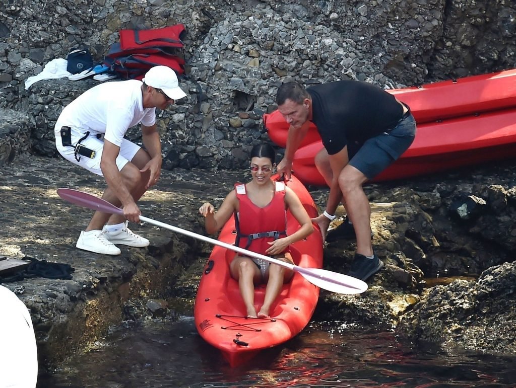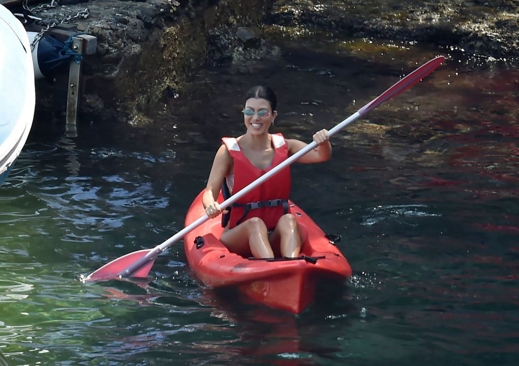 Американская звезда реалити-шоу Кортни Кардашьян отправляется на каноэ во время своего европейского отпуска с детьми в Портофино, 08/04/2019.
