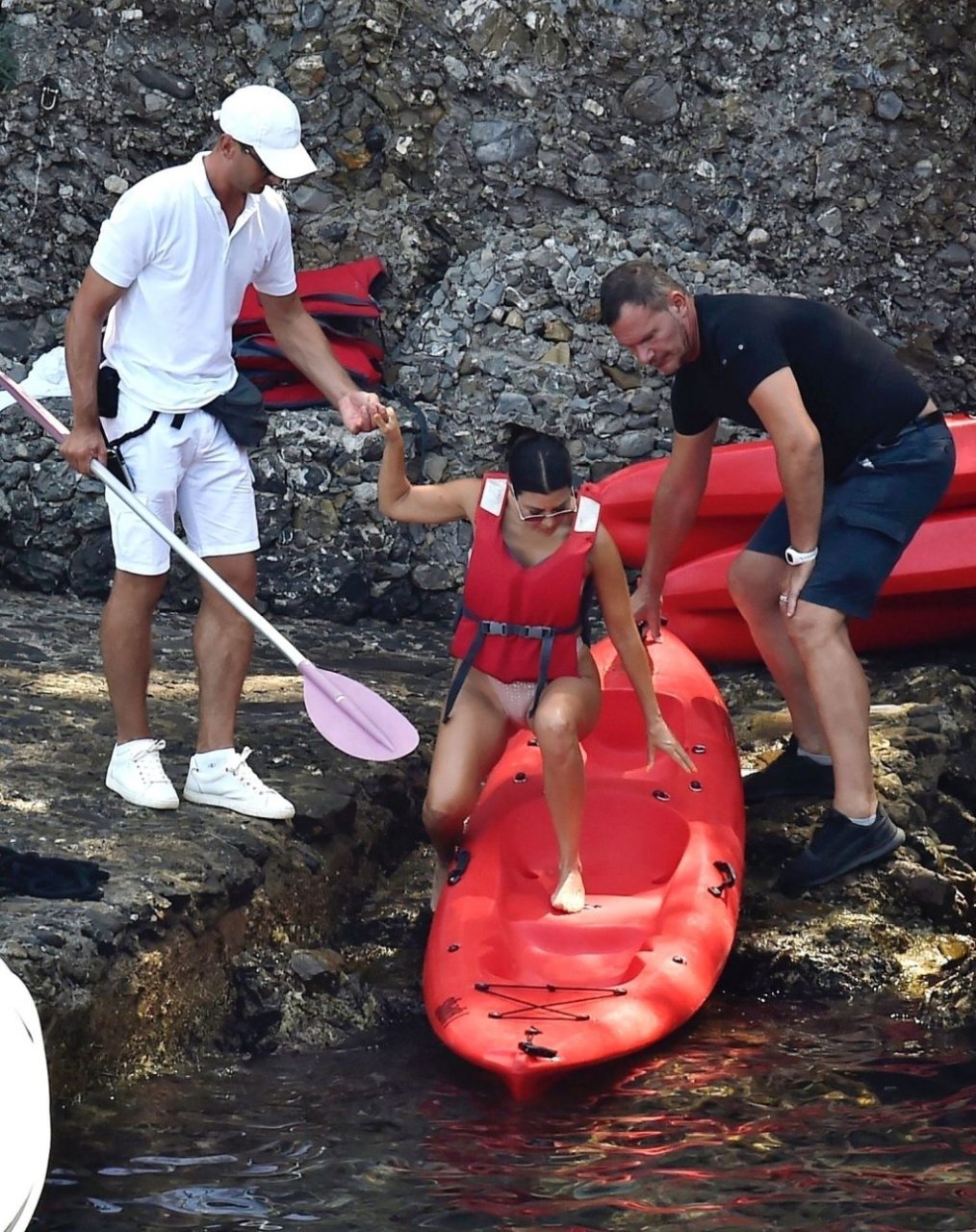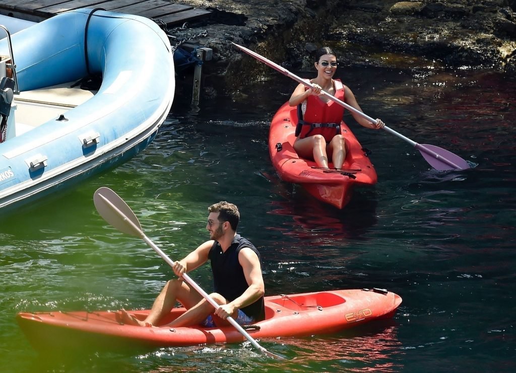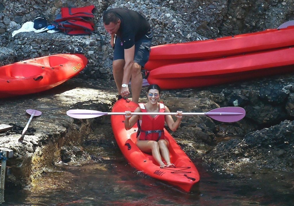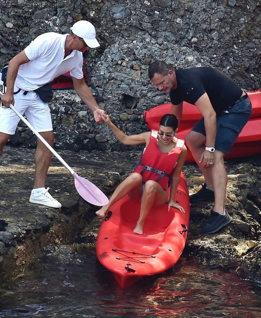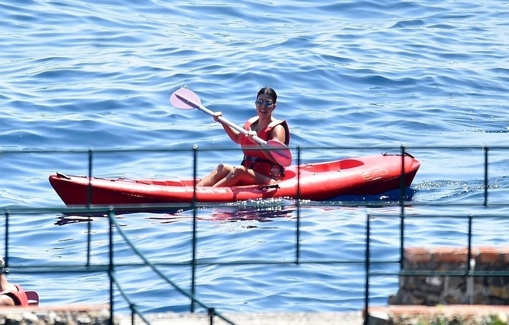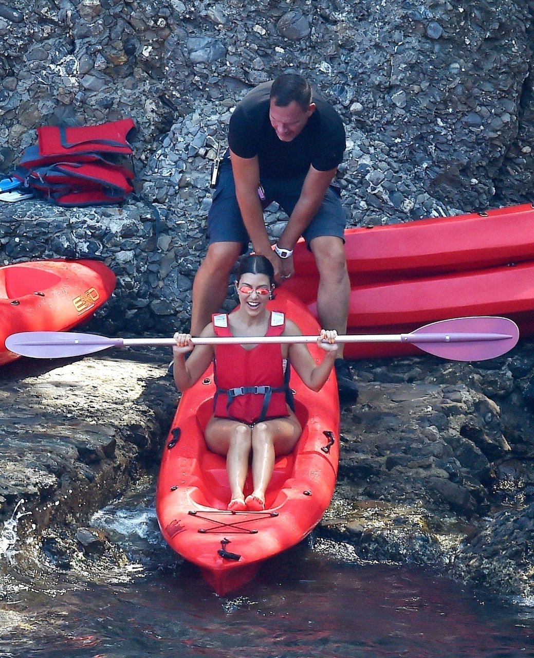 Американская звезда реалити-шоу Кортни Кардашьян отправляется на каноэ во время своего европейского отпуска с детьми в Портофино, 08/04/2019.