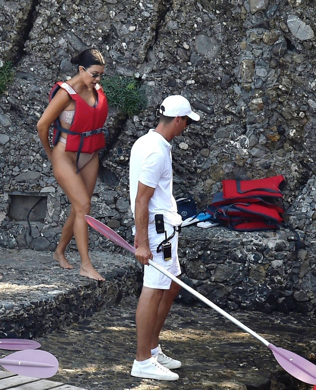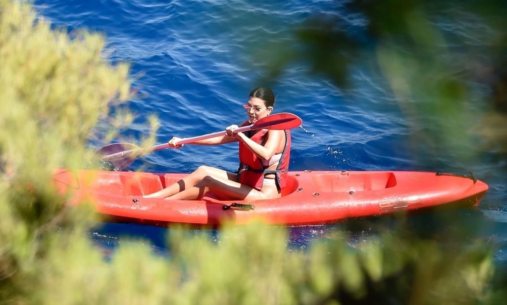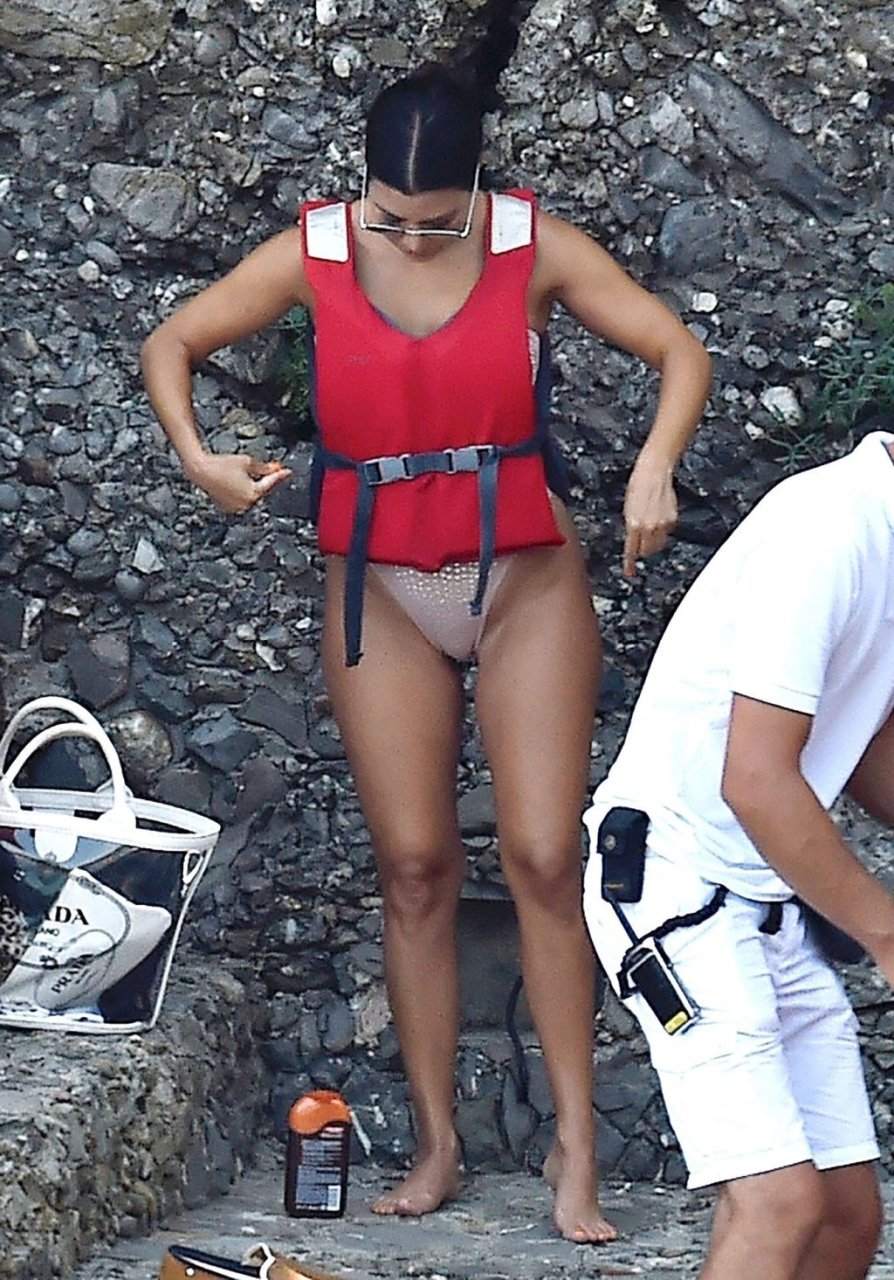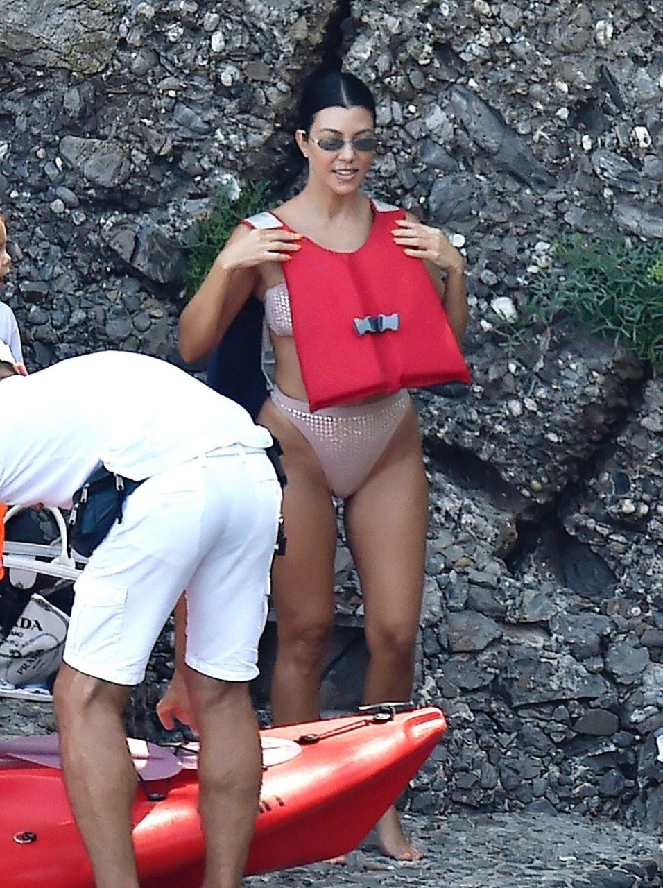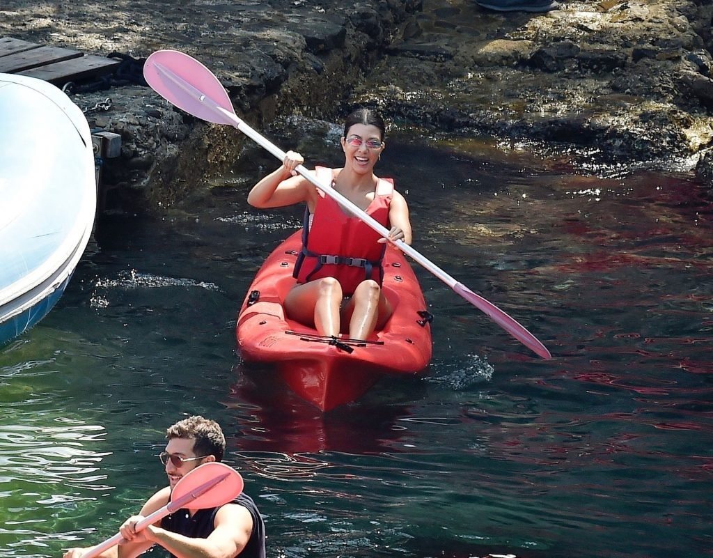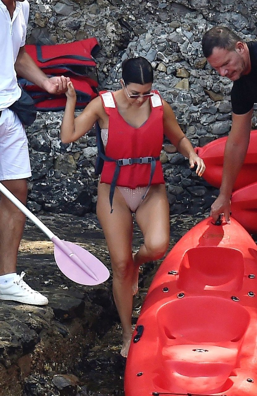 Американская звезда реалити-шоу Кортни Кардашьян отправляется на каноэ во время своего европейского отпуска с детьми в Портофино, 08/04/2019.