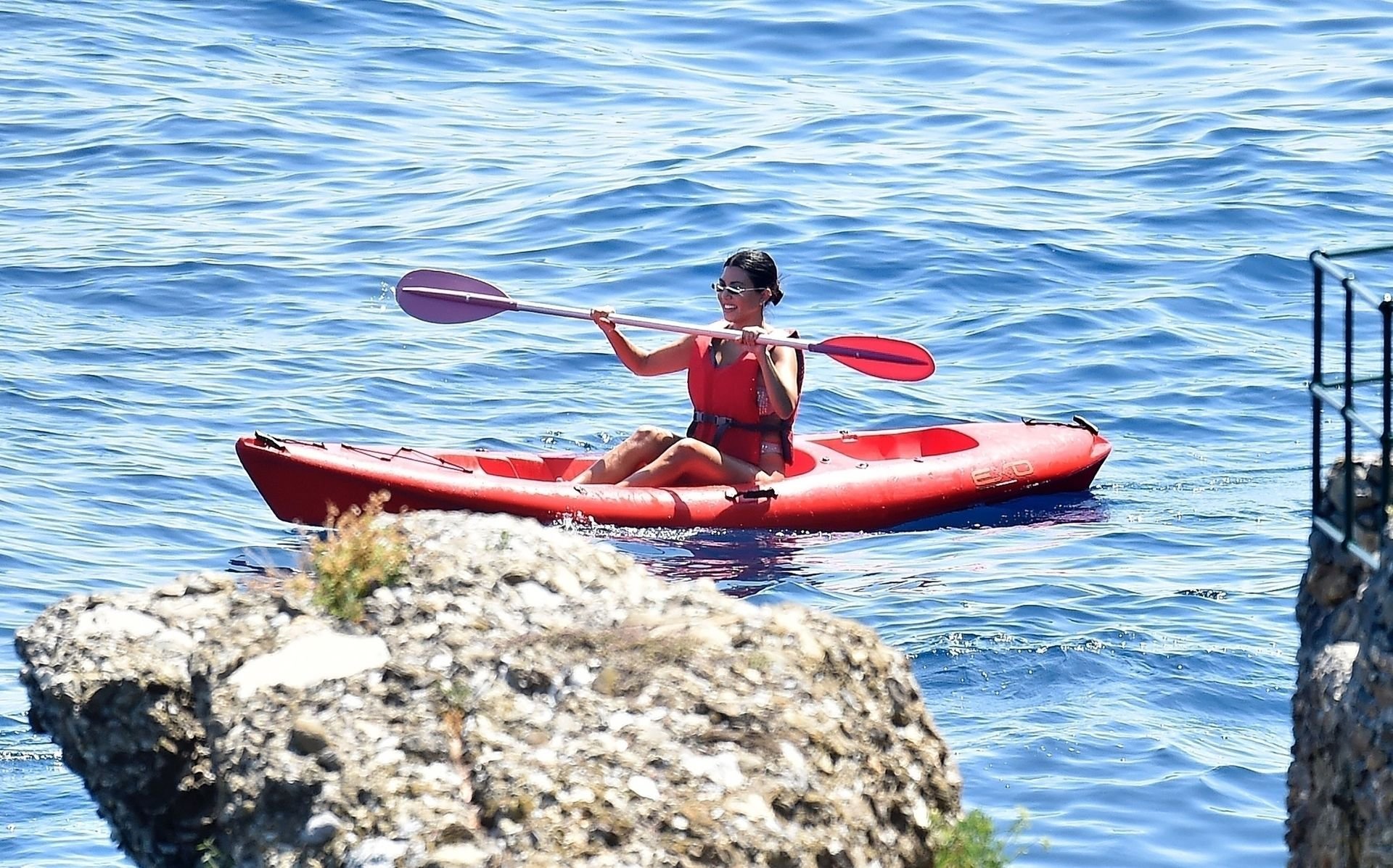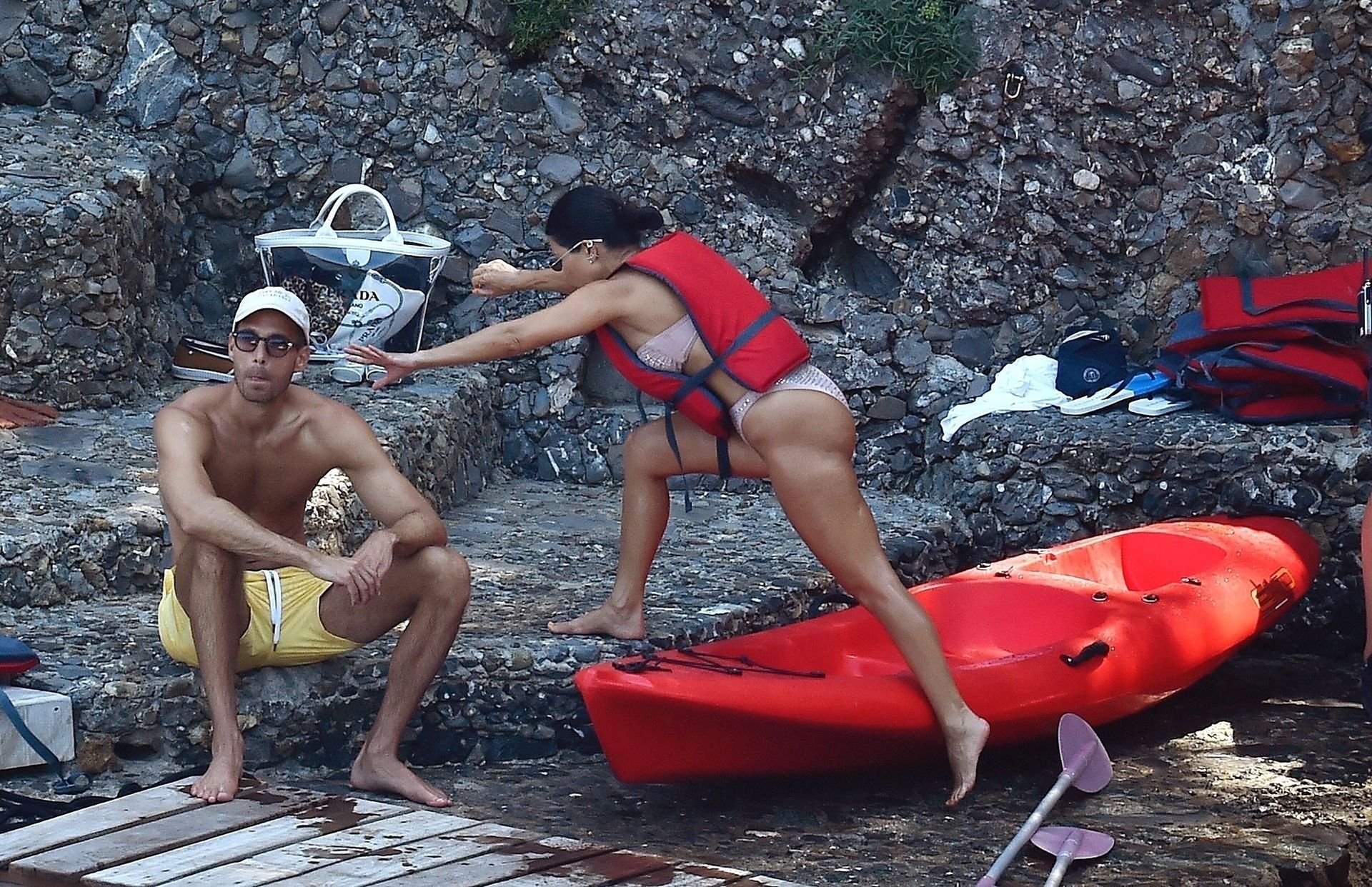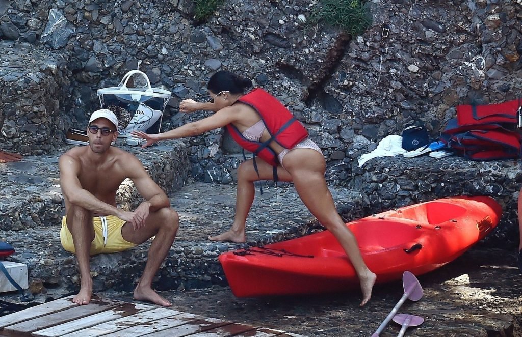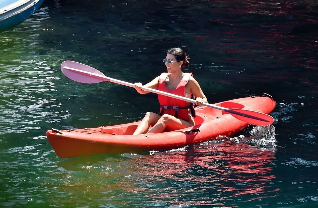 Сексуальная звезда зажигала под итальянским солнцем, сняла свое фиолетовое платье, чтобы показать крошечное бикини, и надела спасательный жилет, пока весело гребла по воде.