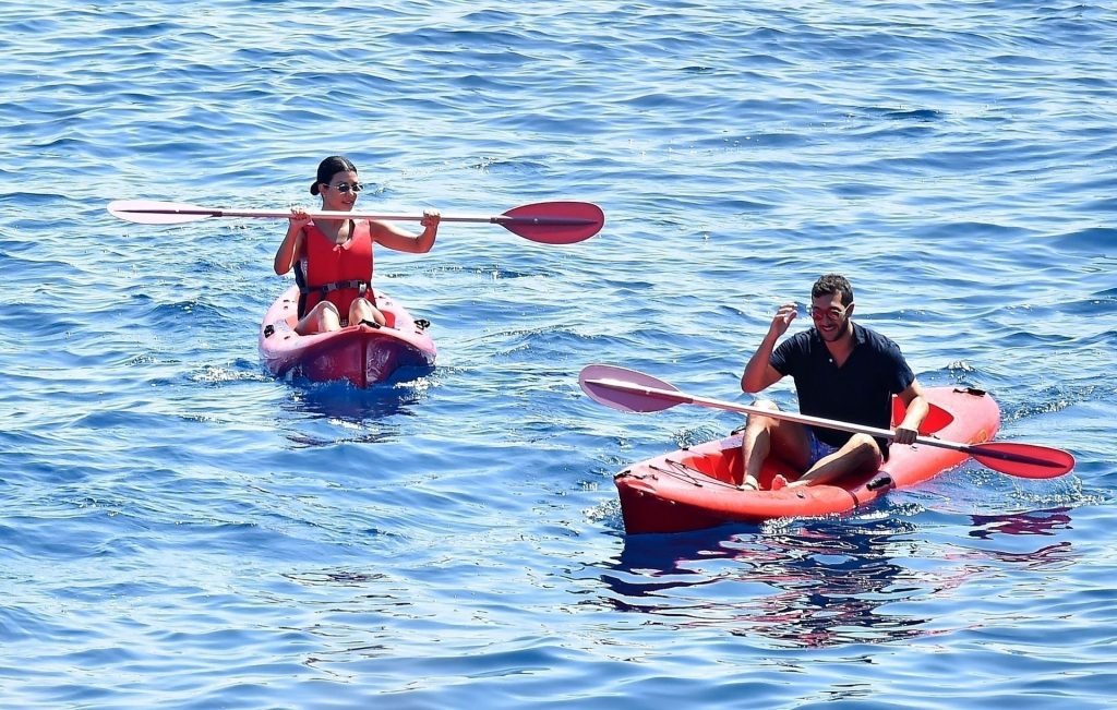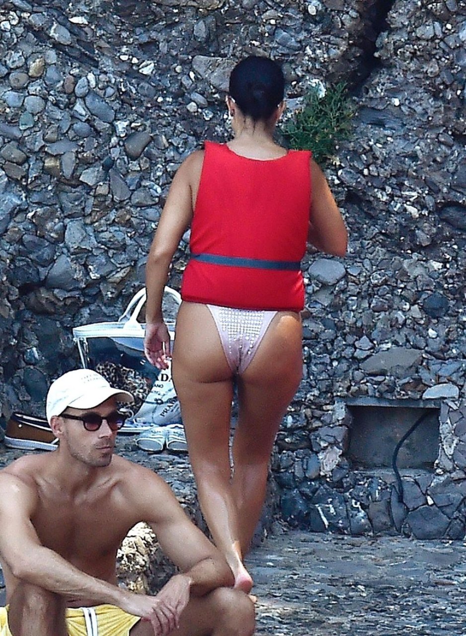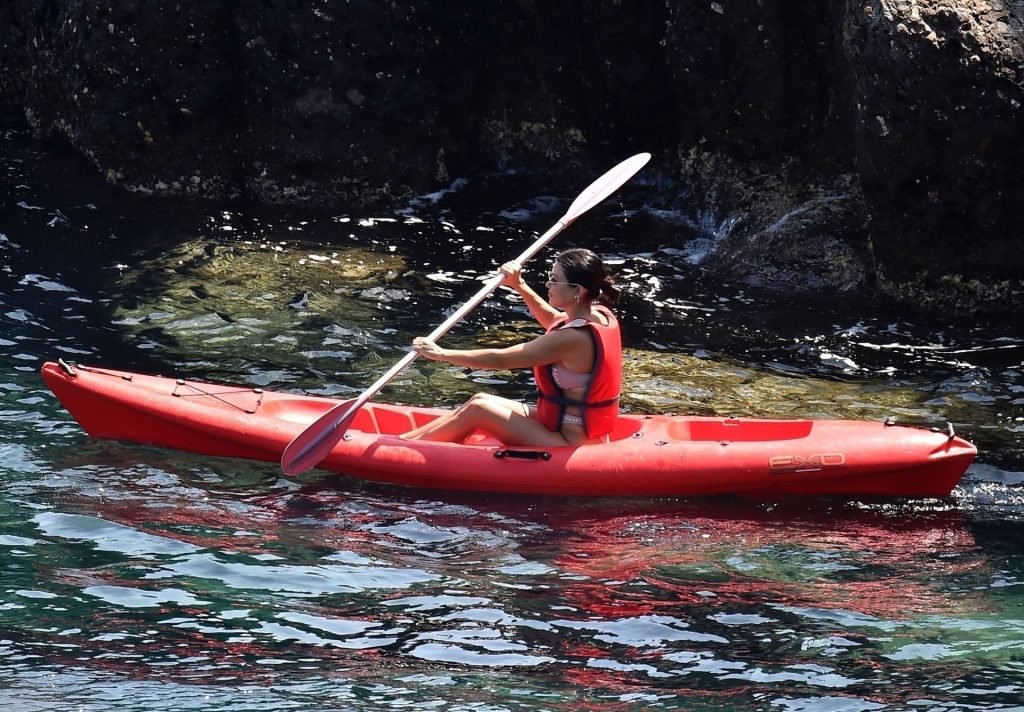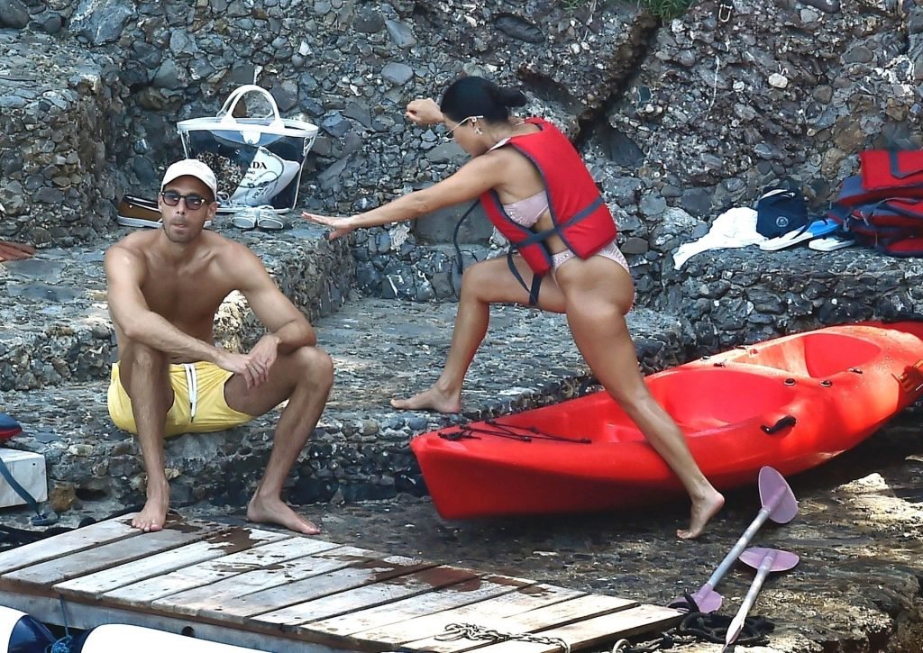 Сексуальная звезда зажигала под итальянским солнцем, сняла свое фиолетовое платье, чтобы показать крошечное бикини, и надела спасательный жилет, пока весело гребла по воде.