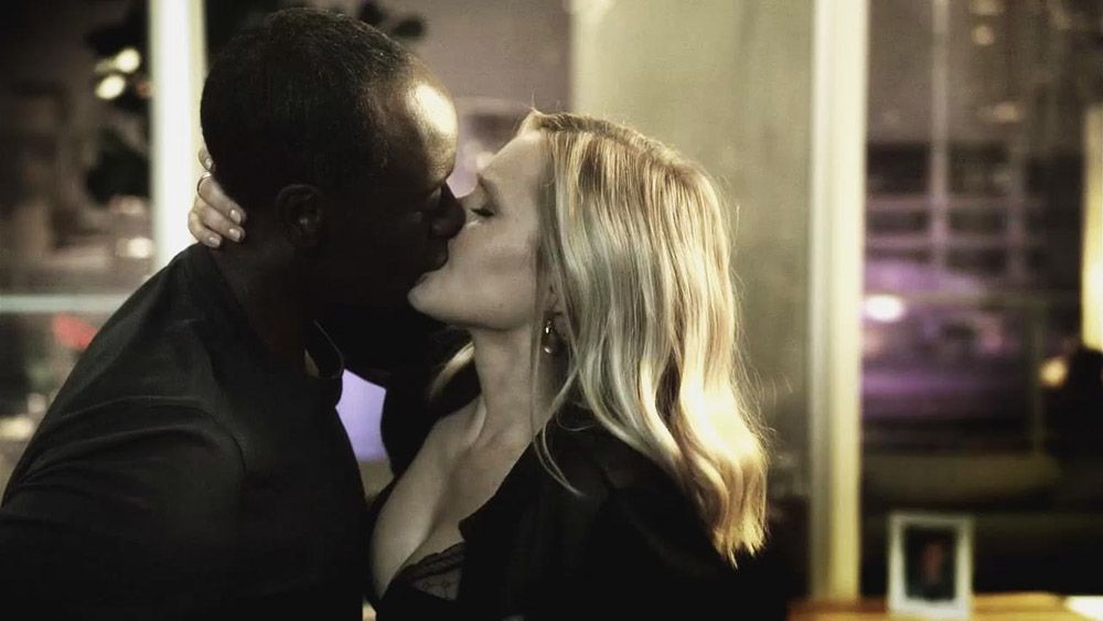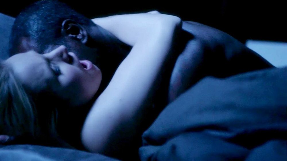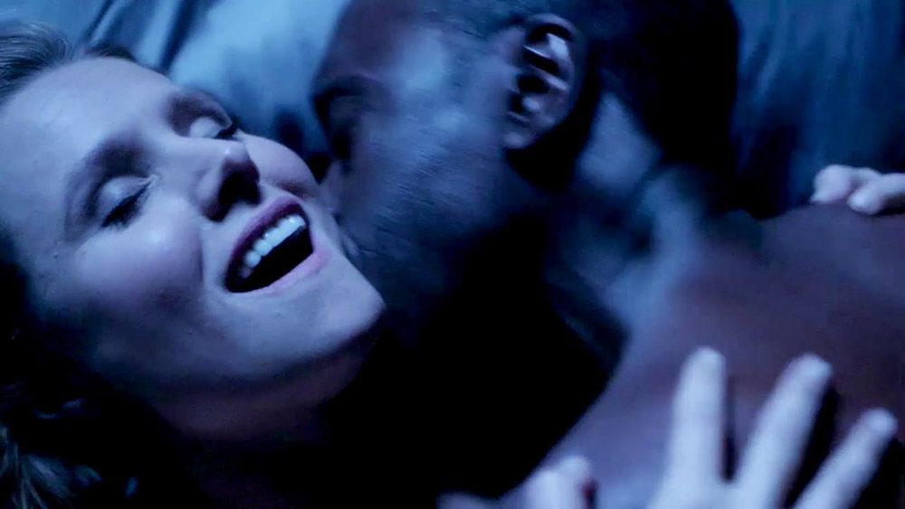 Here is Kristen Bell showing ass and cleavage in black lingerie. She rides a guy in reverse and reaches back to shove her hand in his mouth. They have sex, as she is bouncing in his lap as he lies on a bed.