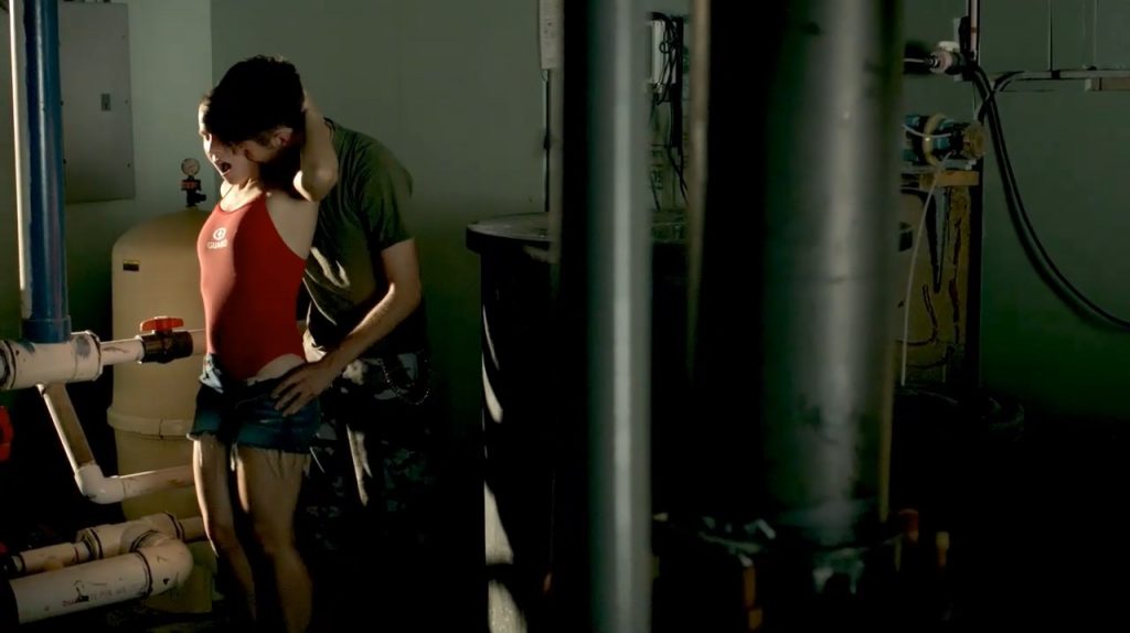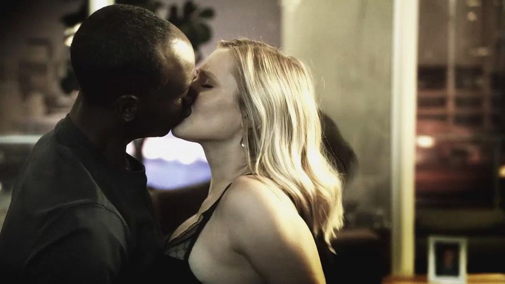 Kristen Bell being pushed up against a wall, kissing a guy passionately. They’re seen having sex on a bed with him on top of her.