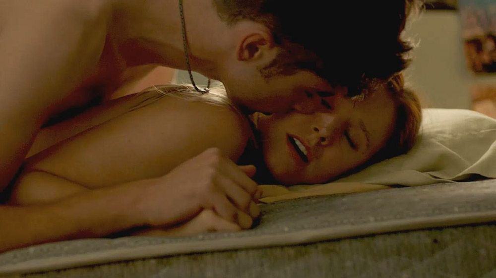 Then Kristen Bell is seen making out with a guy again, showing her boobs and ass in porn. They make their way into a bedroom. She then removes her bra, and we see her boobs as she and the guy move onto the bed and have sex with Kristen underneath him.