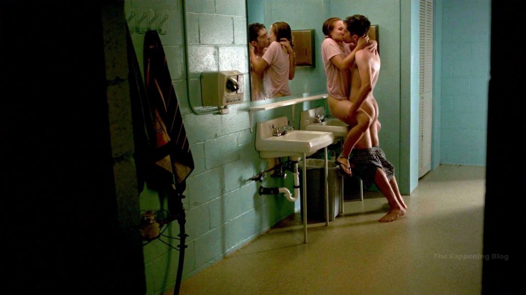 Актриса целуется с любовником в ванной, парень просовывает руку в её трусики спереди, а она делает то же самое, просовывая руку в его штаны. Затем она полностью сдвигает трусики, показывая голую ягодицу сбоку, сидя на краю раковины, а парень стоит между её ног и поднимает её, занимаясь с ней сексом.
