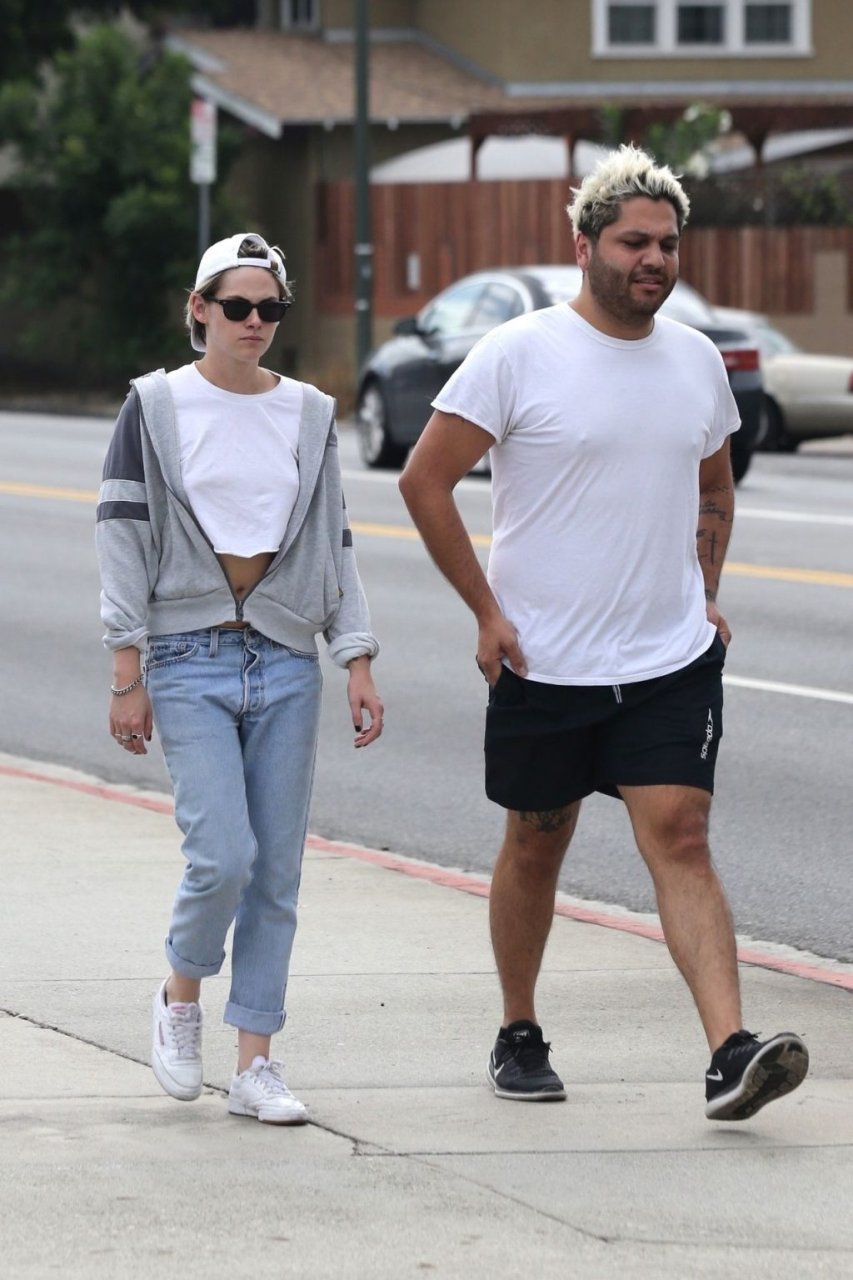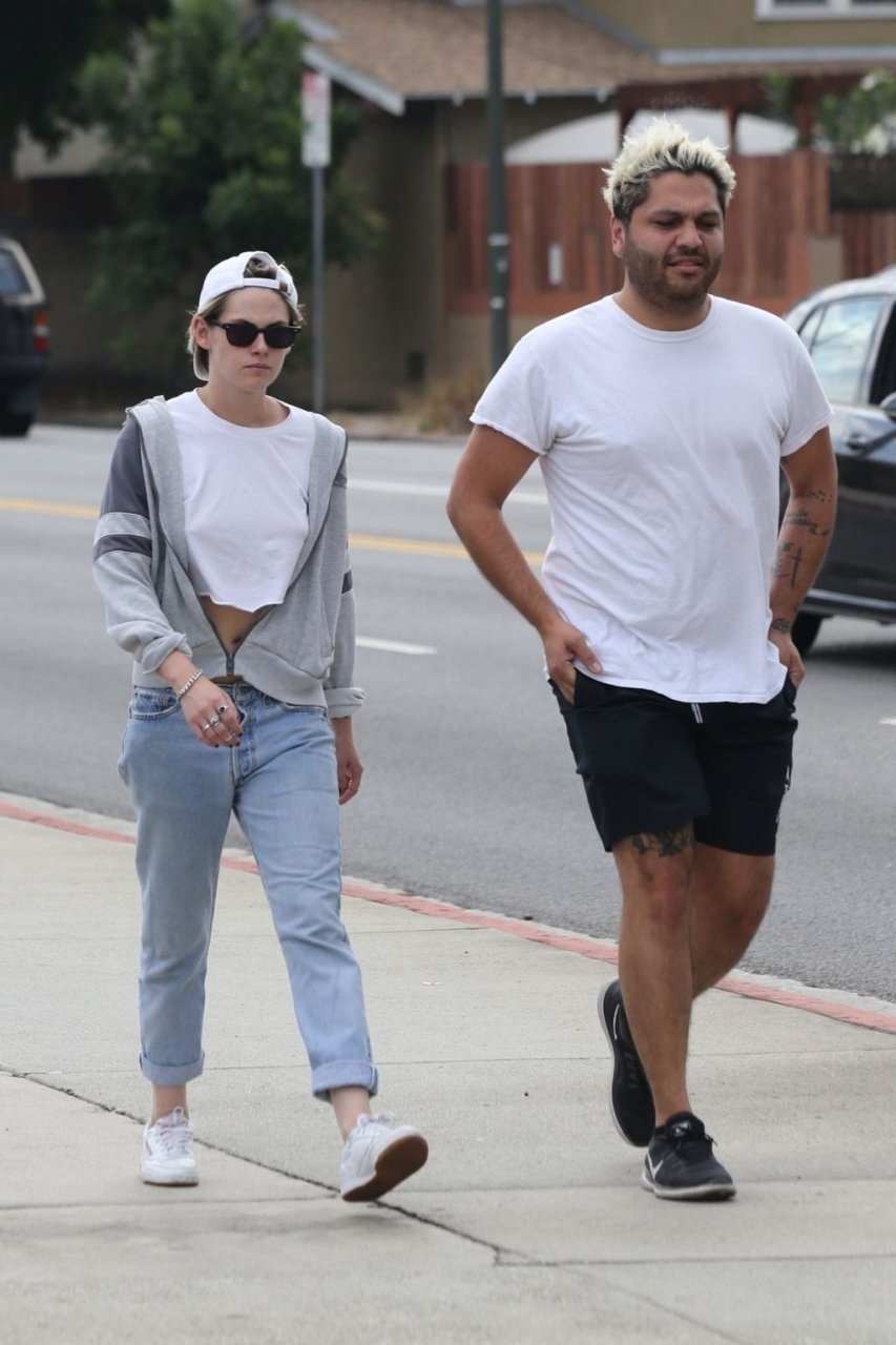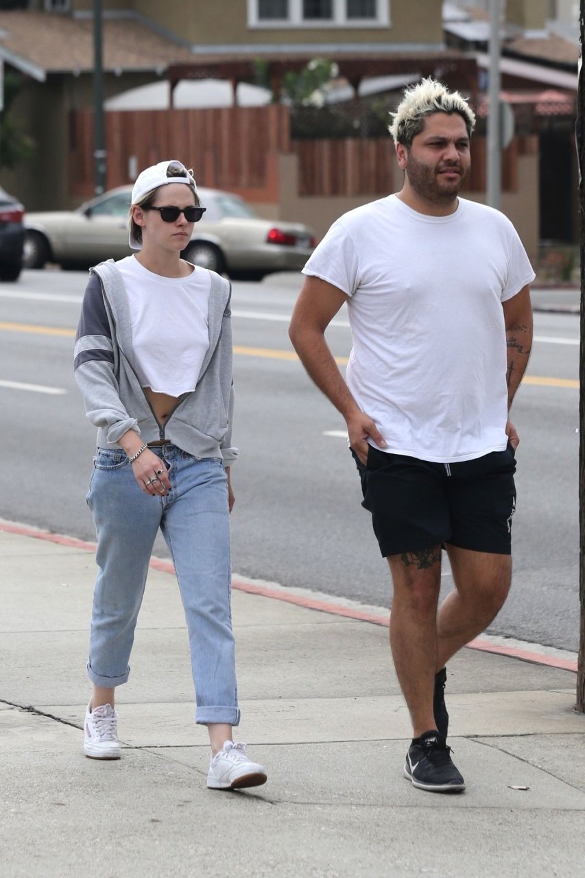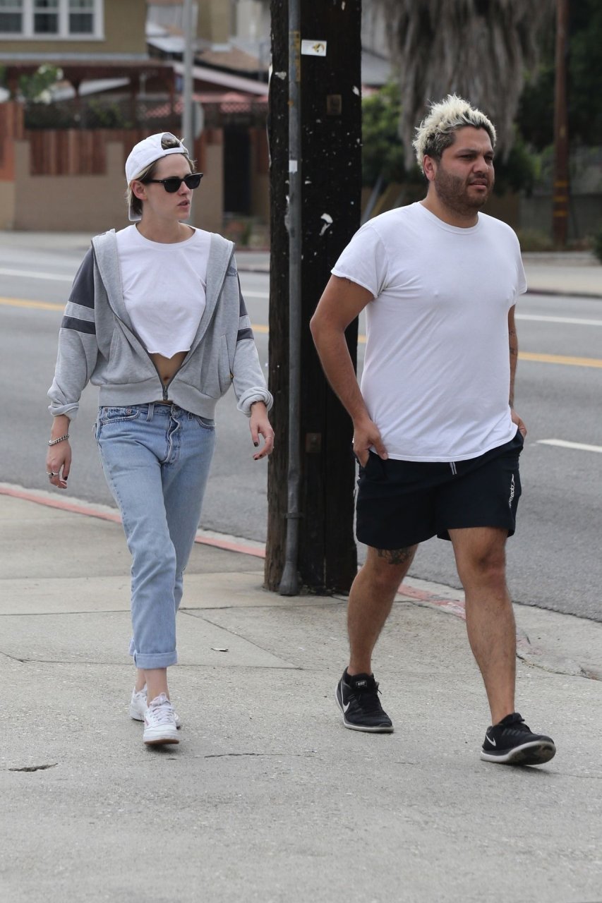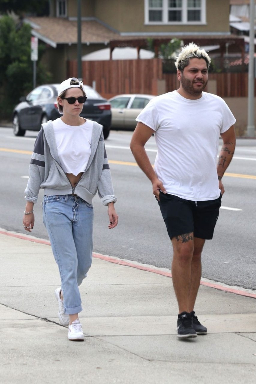 Кристен Стюарт выбирает не носить бюстгальтер, прогуливаясь на завтрак с подругой в Лос-Анджелесе, 23.07.2019. Кристен выглядит повседневно в солнцезащитных очках, тонком белом коротком топе, синих джинсах и белых кроссовках.