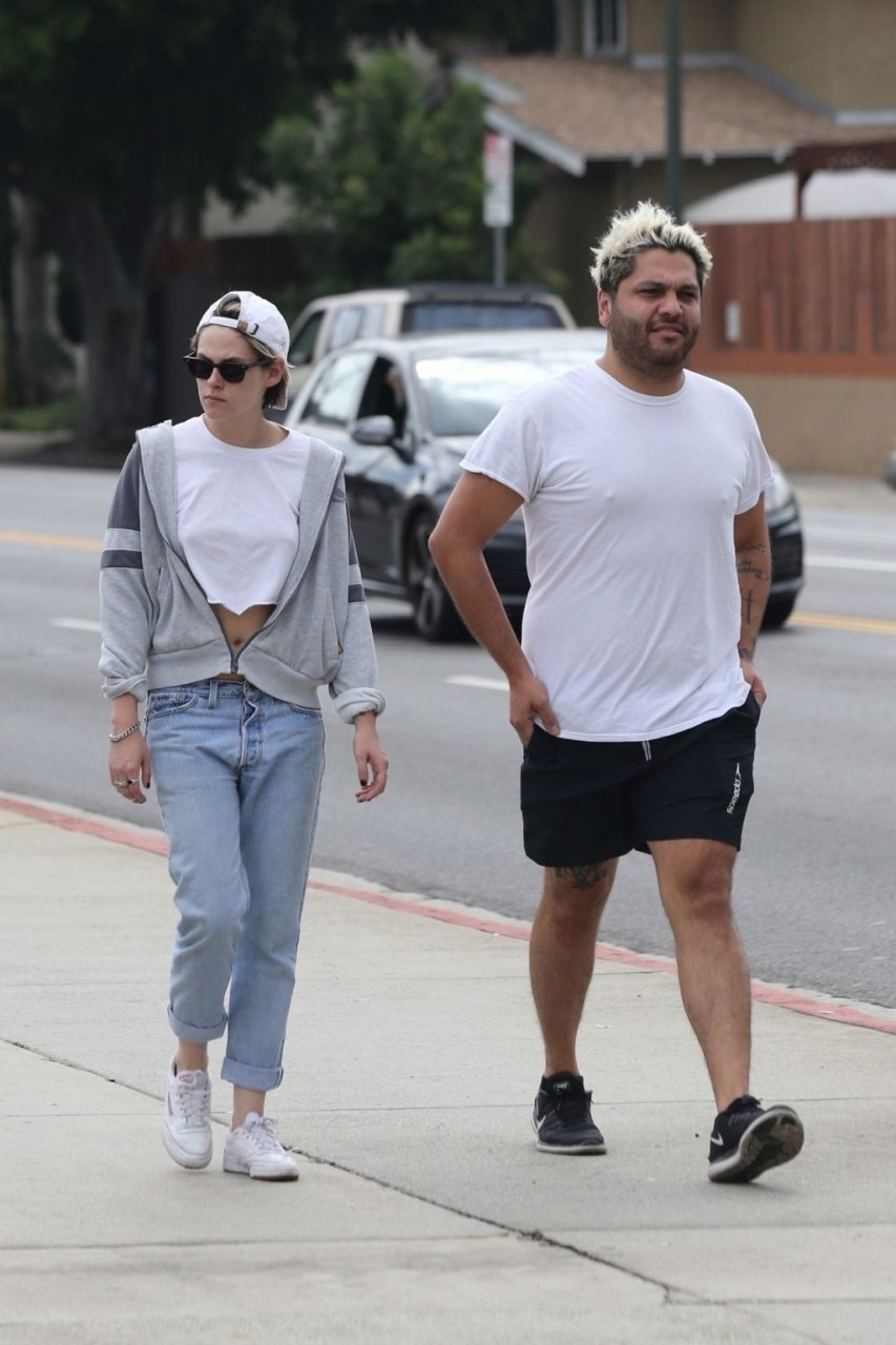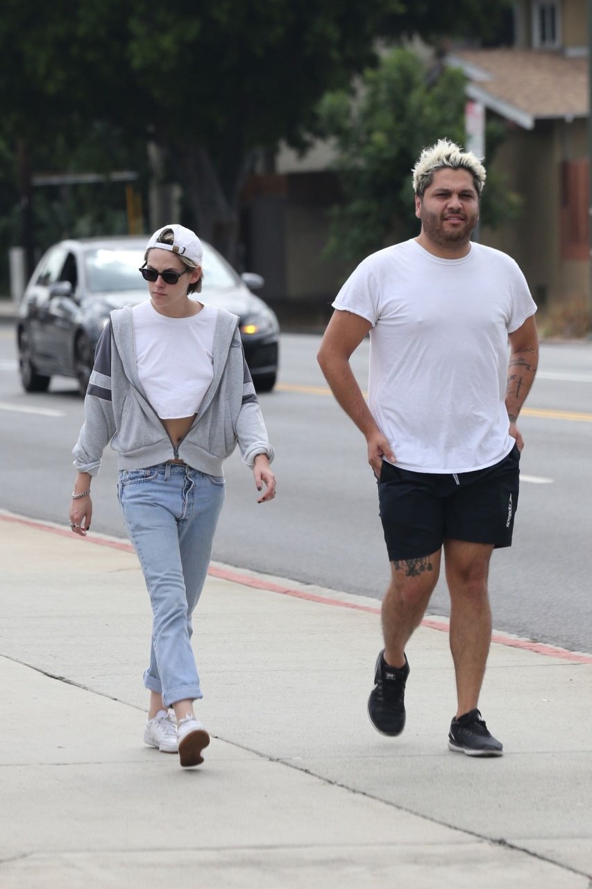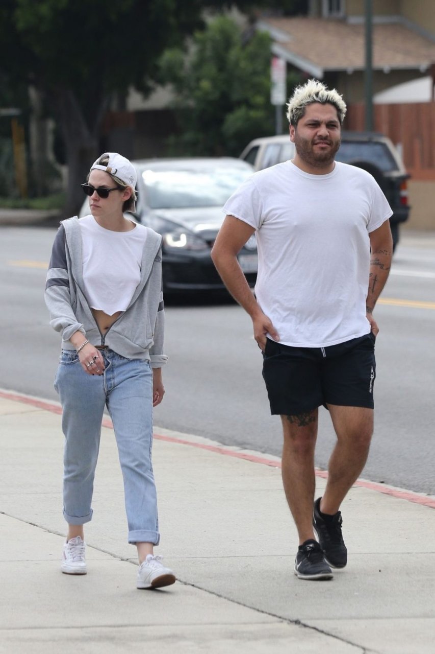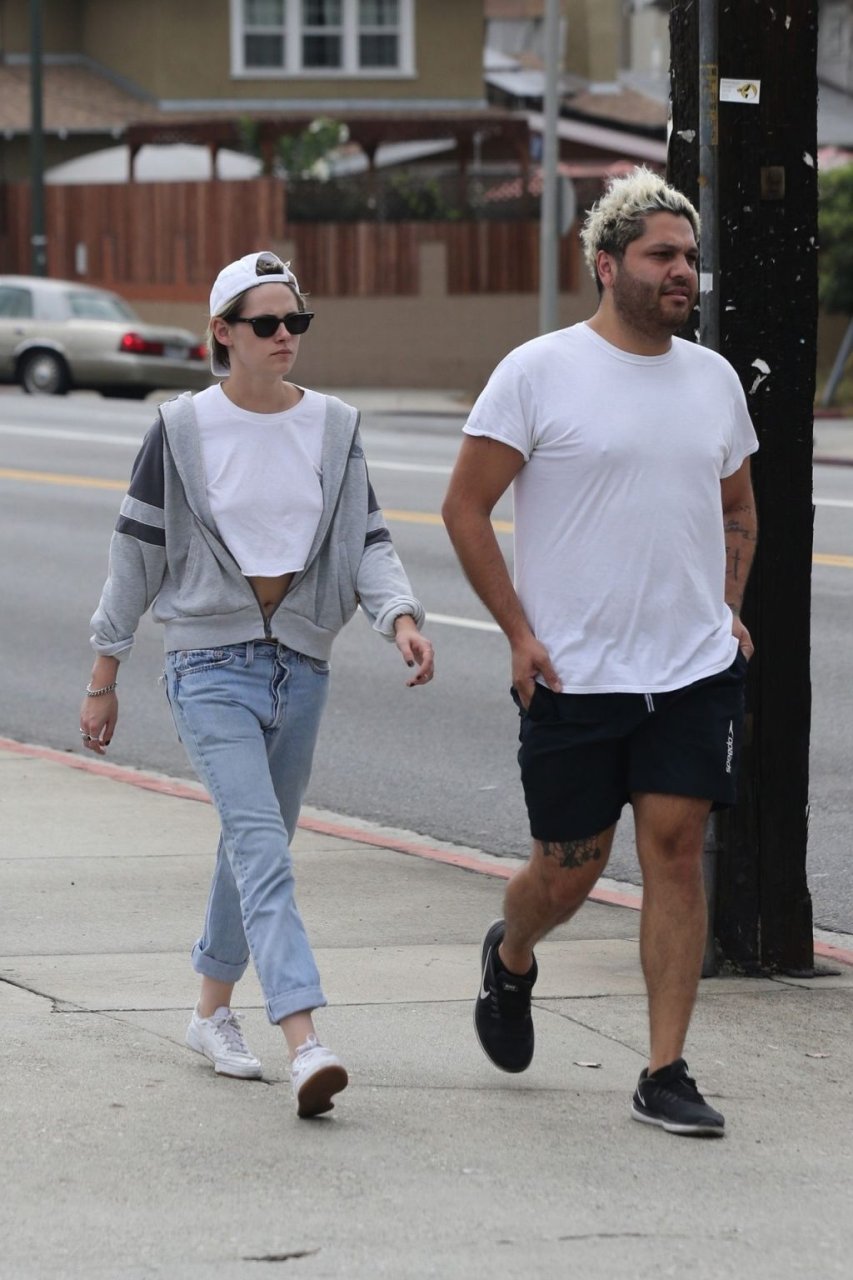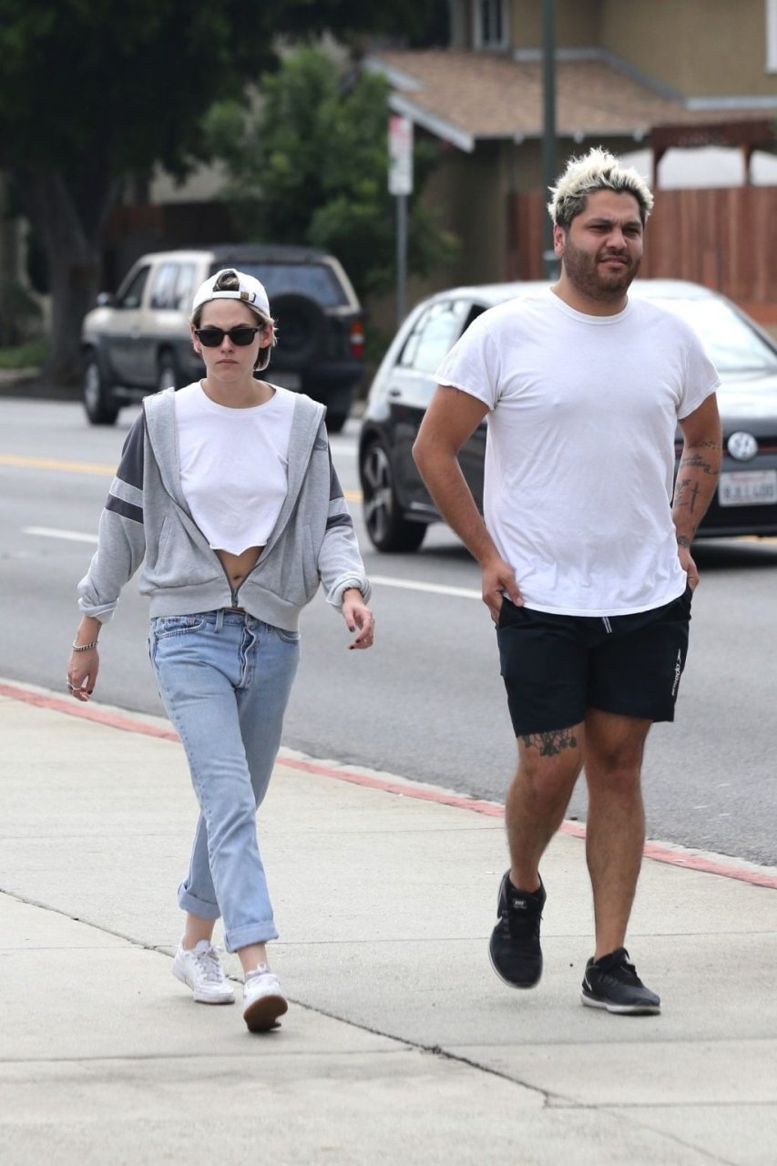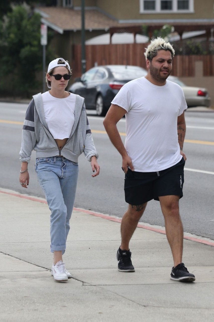 Кристен Стюарт выбирает не носить бюстгальтер, прогуливаясь на завтрак с подругой в Лос-Анджелесе, 23.07.2019. Кристен выглядит повседневно в солнцезащитных очках, тонком белом коротком топе, синих джинсах и белых кроссовках.