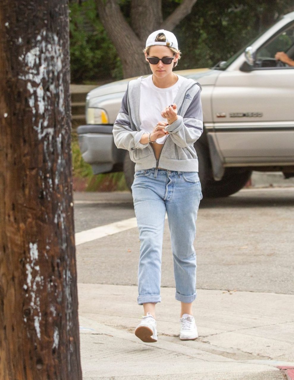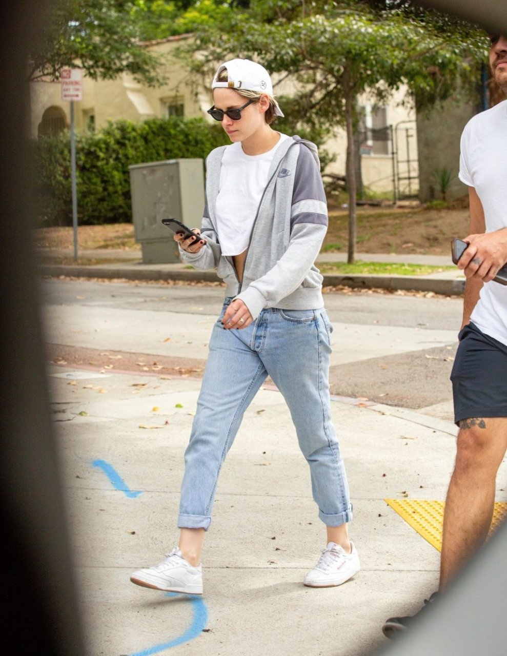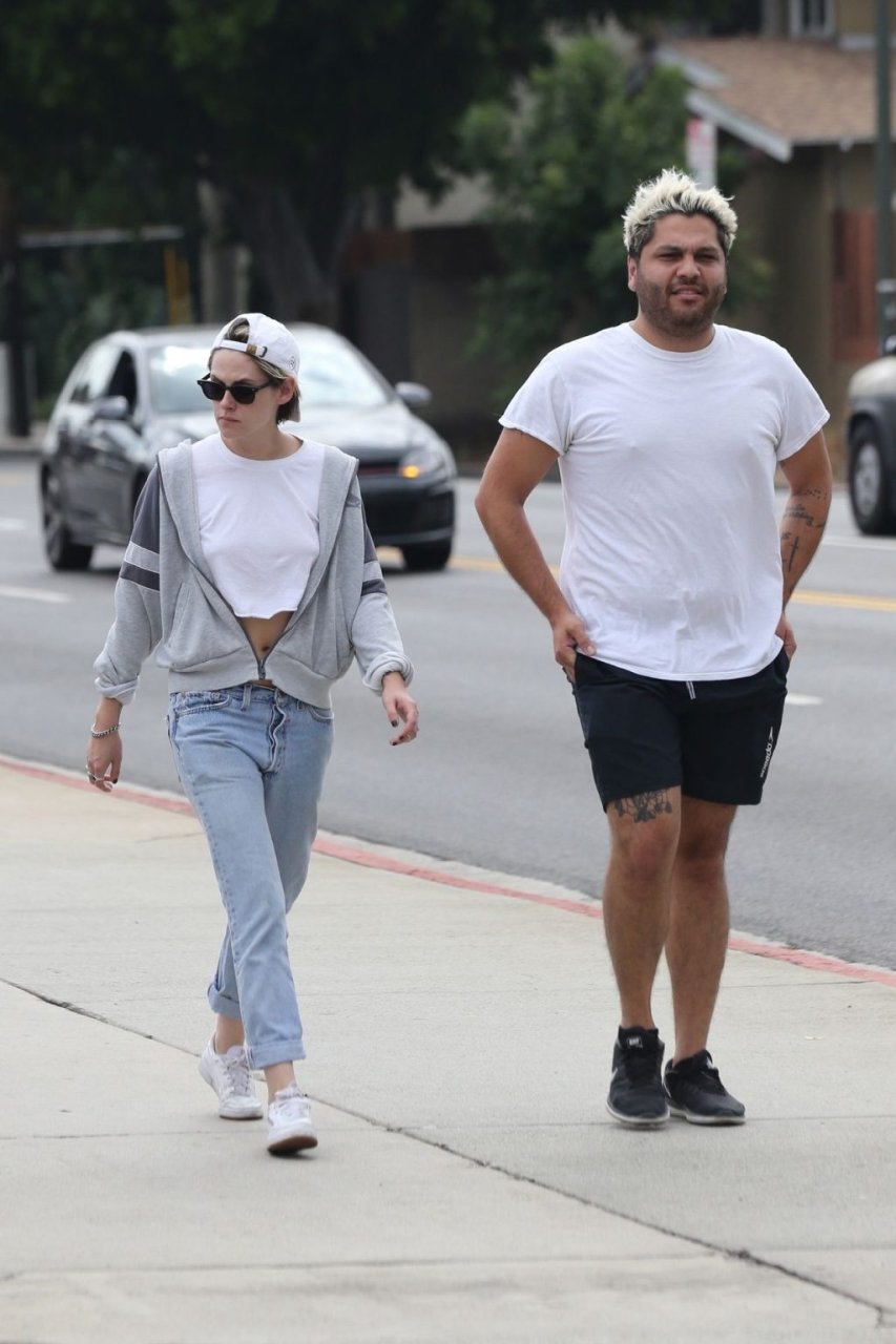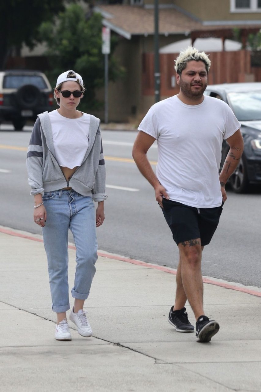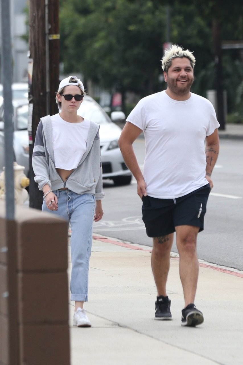 Кристен Стюарт выбирает не носить бюстгальтер, прогуливаясь на завтрак с подругой в Лос-Анджелесе, 23.07.2019. Кристен выглядит повседневно в солнцезащитных очках, тонком белом коротком топе, синих джинсах и белых кроссовках.