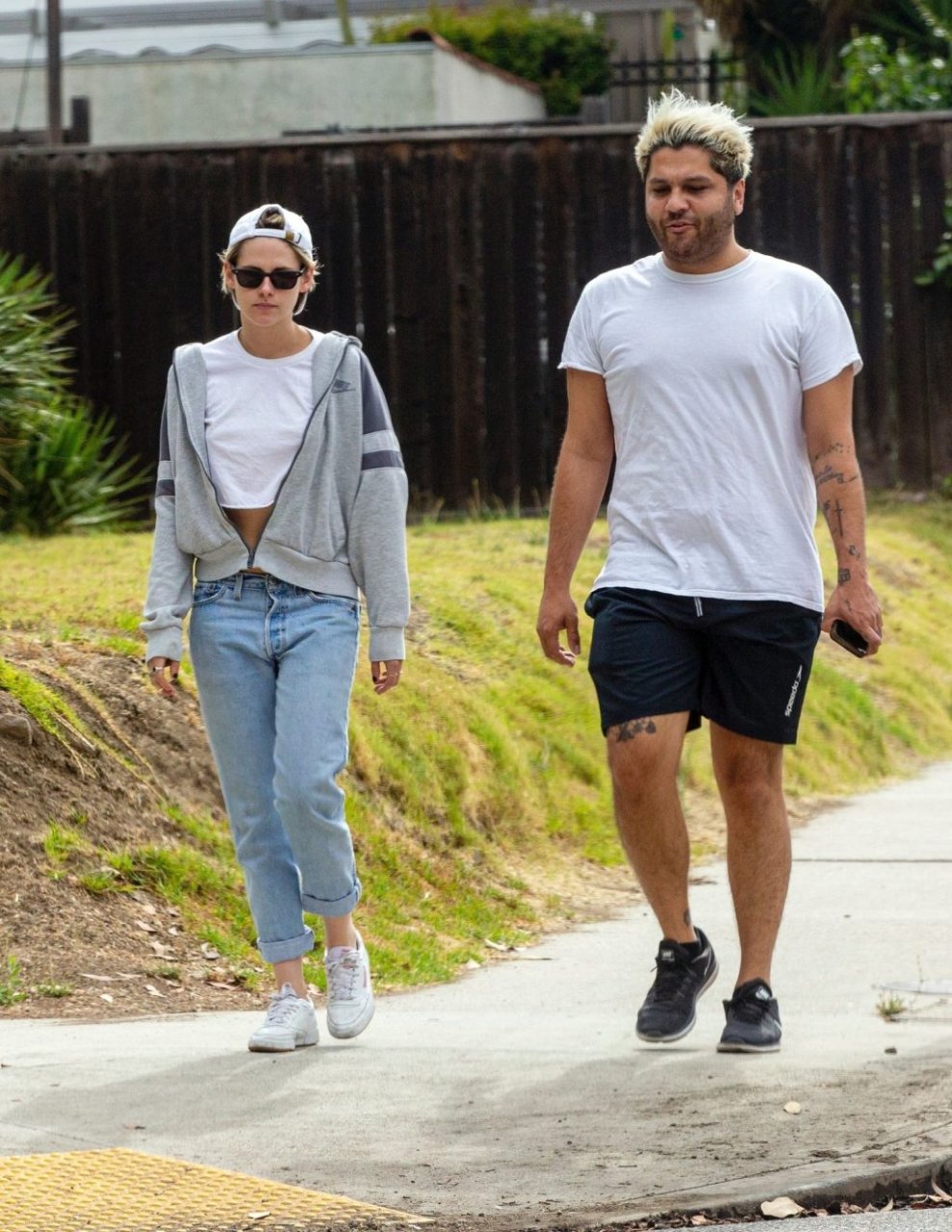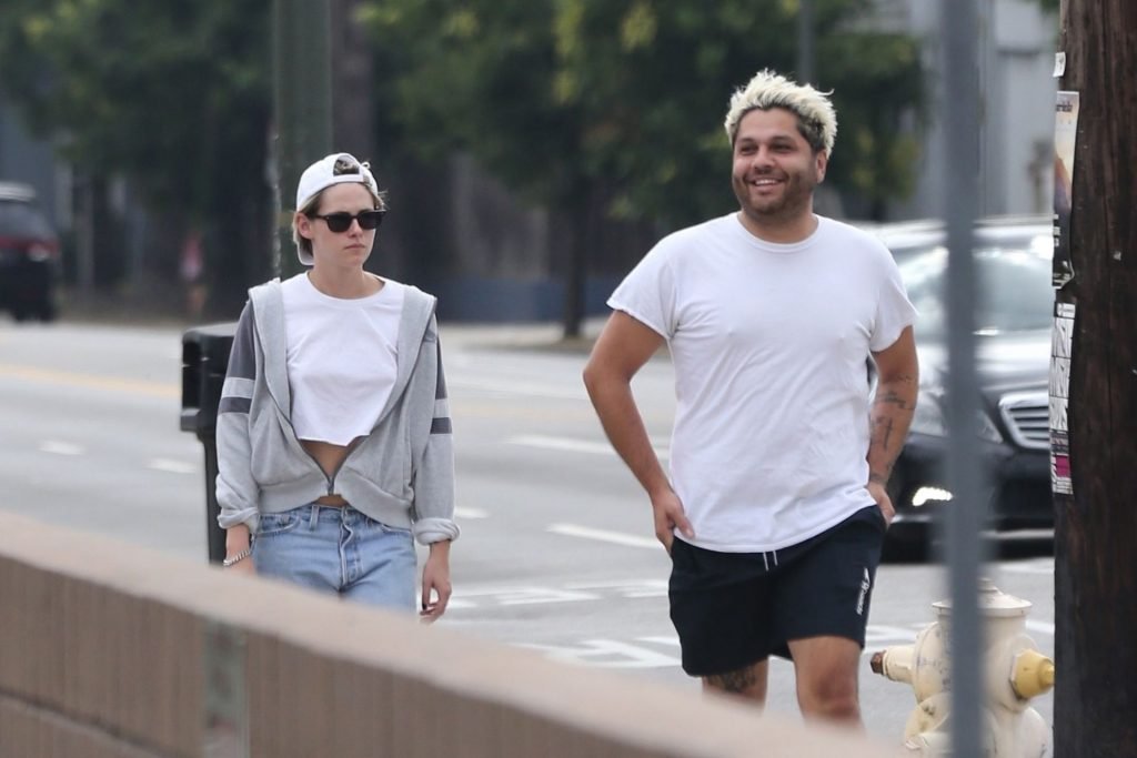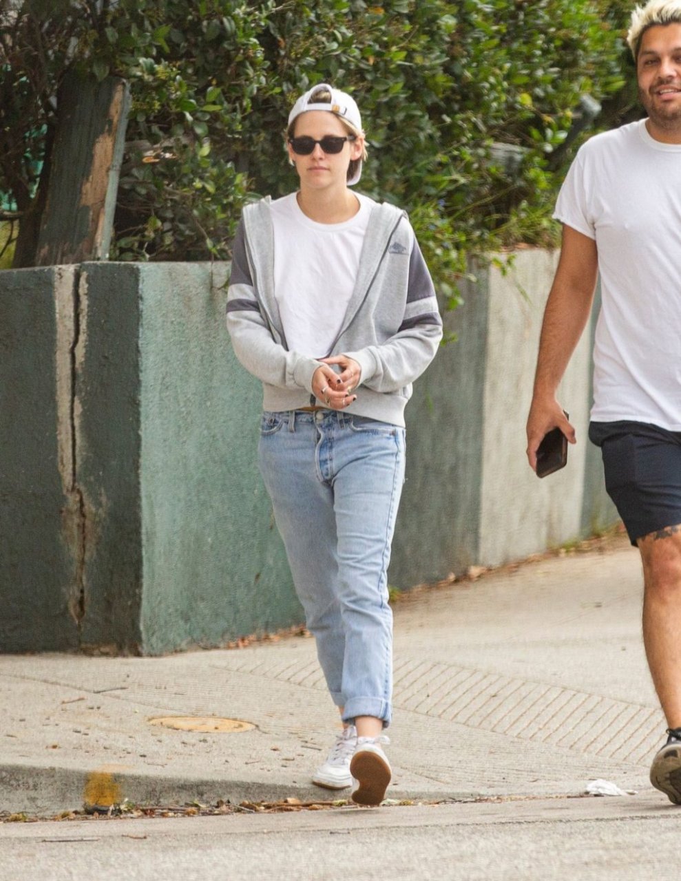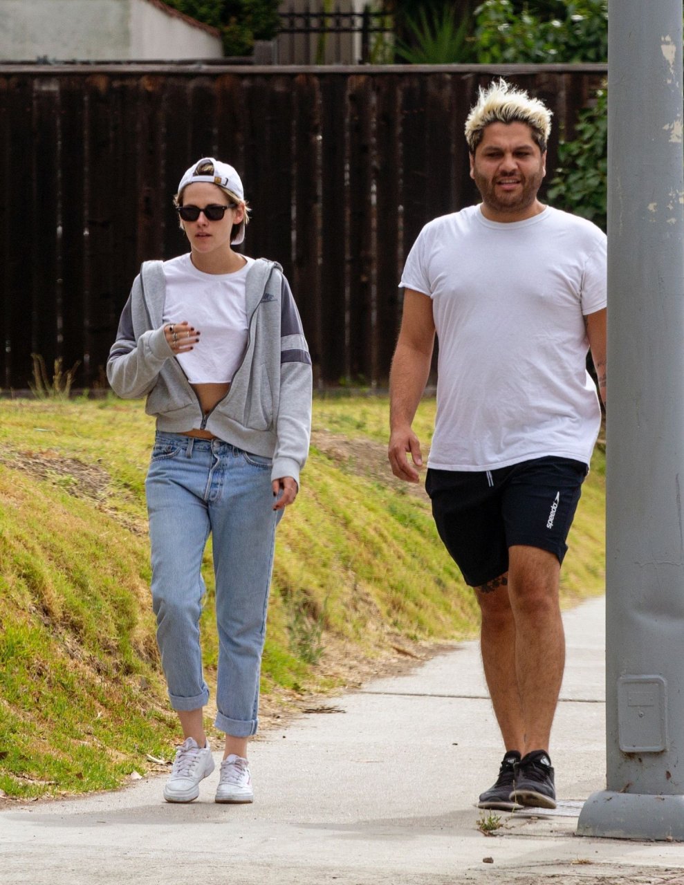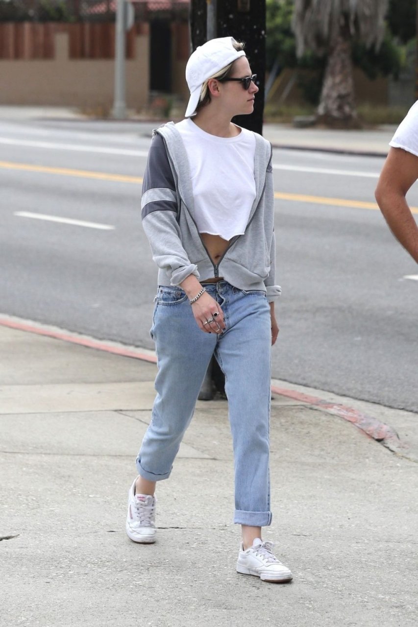 Кристен Стюарт выбирает не носить бюстгальтер, прогуливаясь на завтрак с подругой в Лос-Анджелесе, 23.07.2019. Кристен выглядит повседневно в солнцезащитных очках, тонком белом коротком топе, синих джинсах и белых кроссовках.