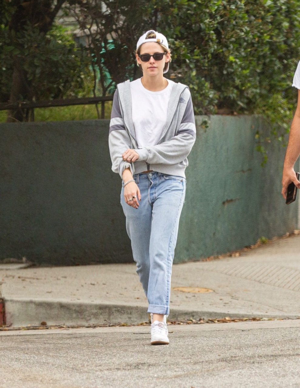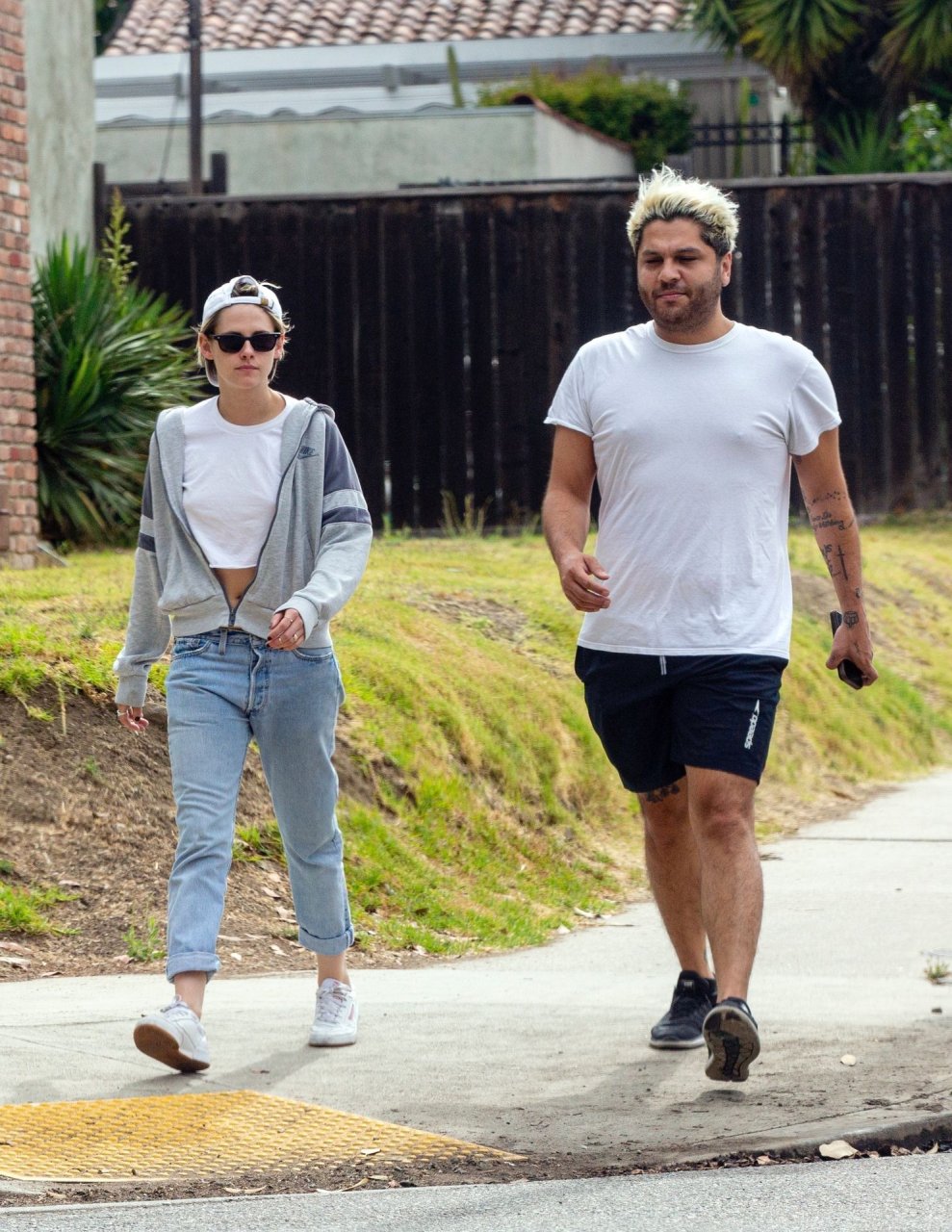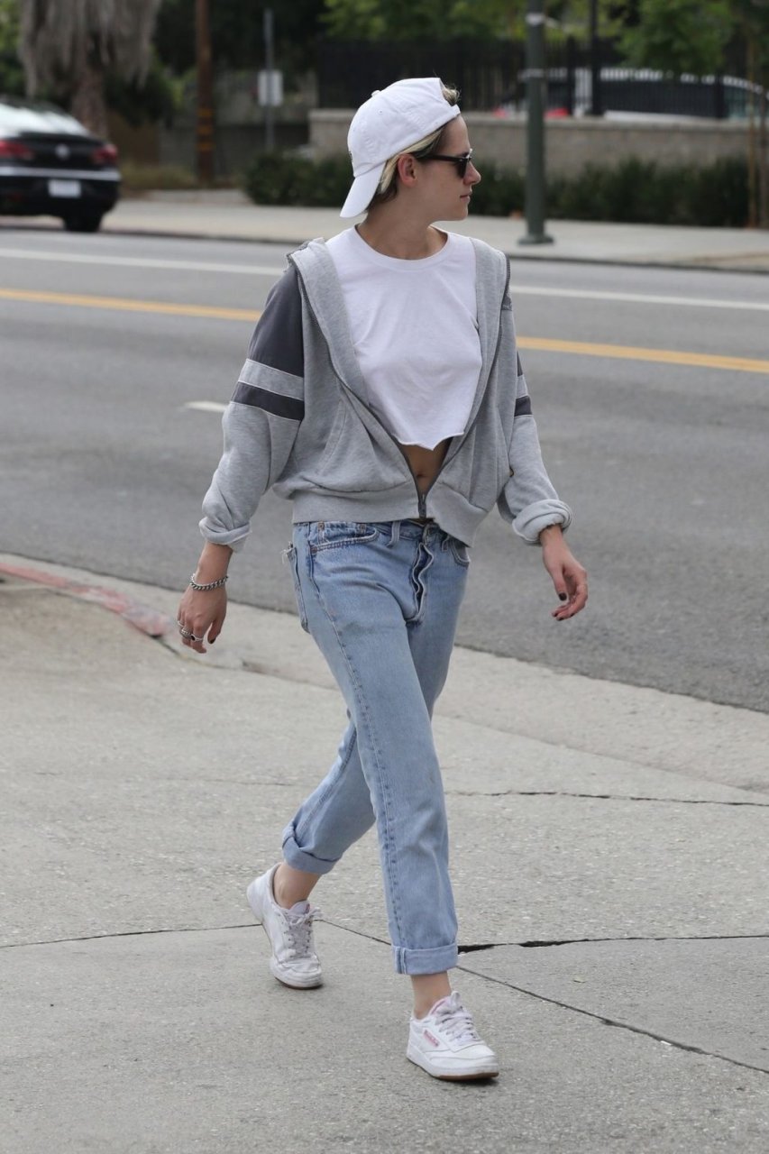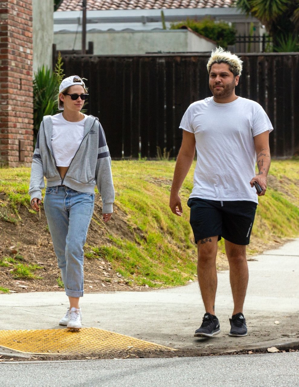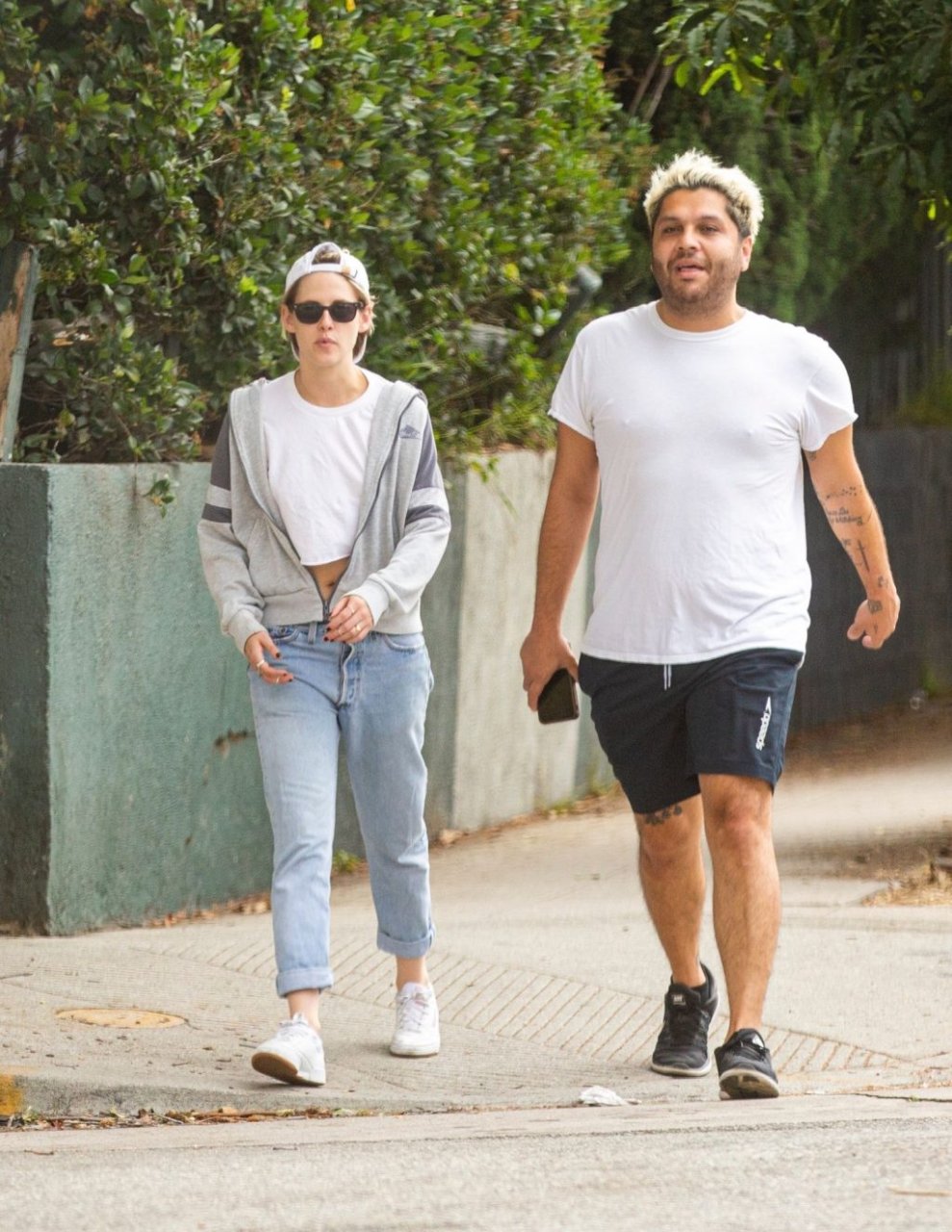 Кристен Стюарт выбирает не носить бюстгальтер, прогуливаясь на завтрак с подругой в Лос-Анджелесе, 23.07.2019. Кристен выглядит повседневно в солнцезащитных очках, тонком белом коротком топе, синих джинсах и белых кроссовках.