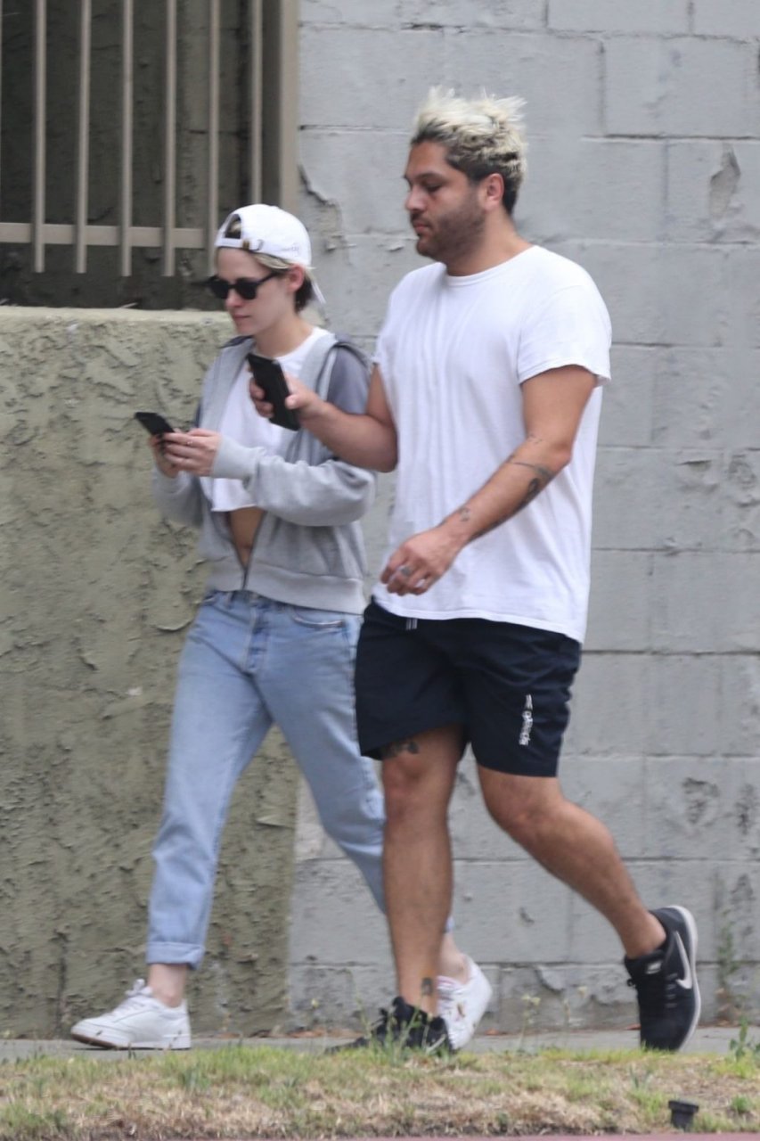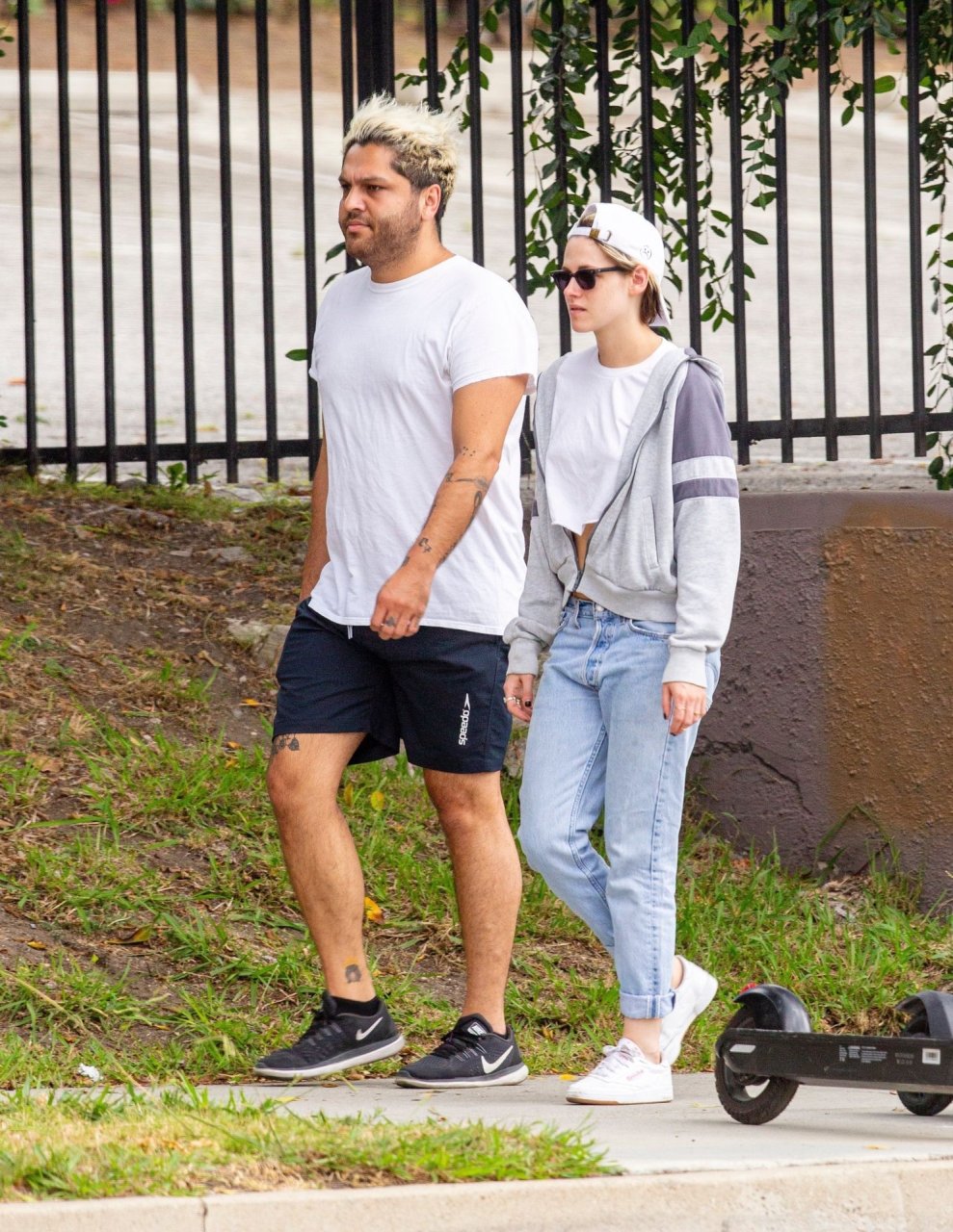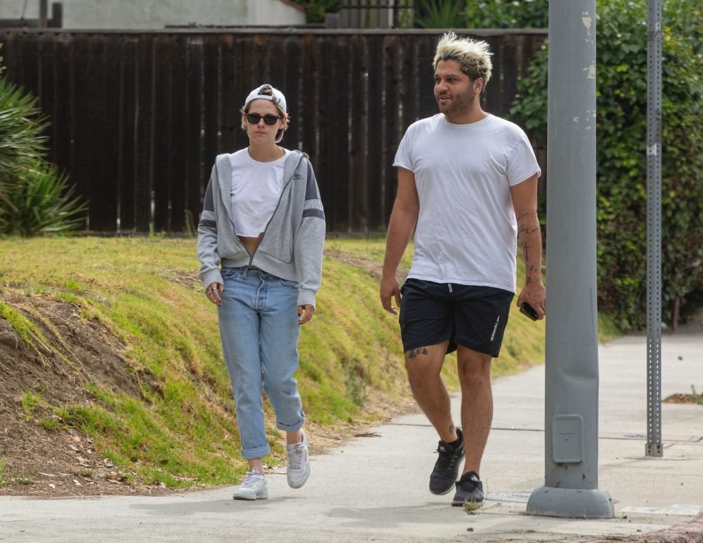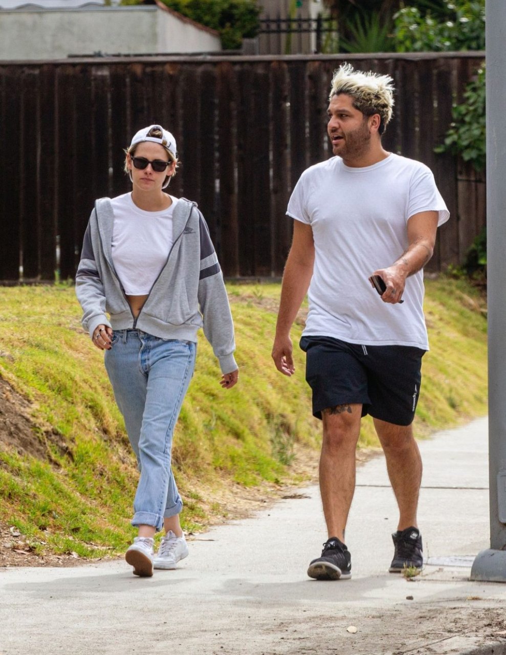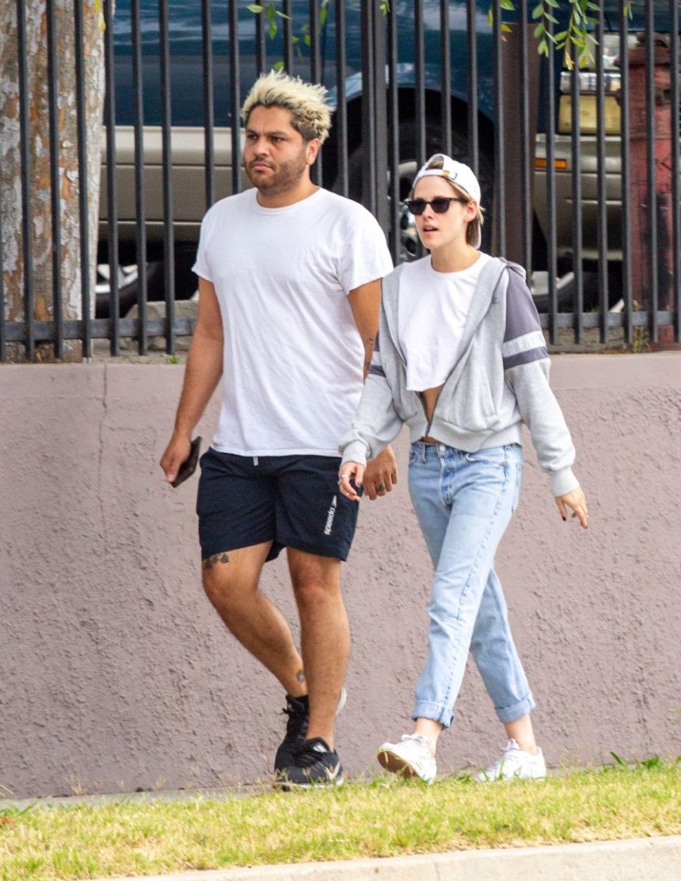 Кристен Стюарт выбирает не носить бюстгальтер, прогуливаясь на завтрак с подругой в Лос-Анджелесе, 23.07.2019. Кристен выглядит повседневно в солнцезащитных очках, тонком белом коротком топе, синих джинсах и белых кроссовках.