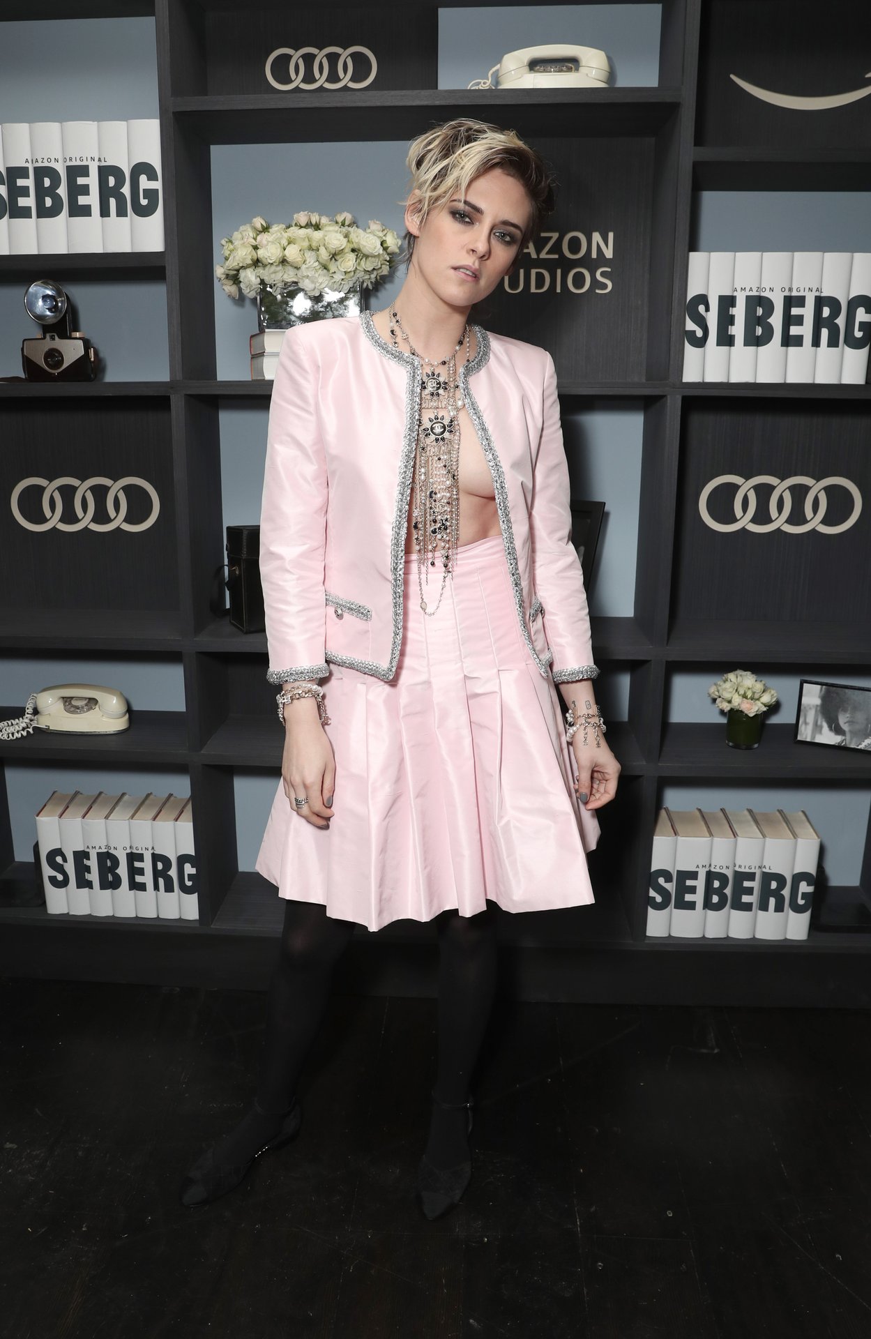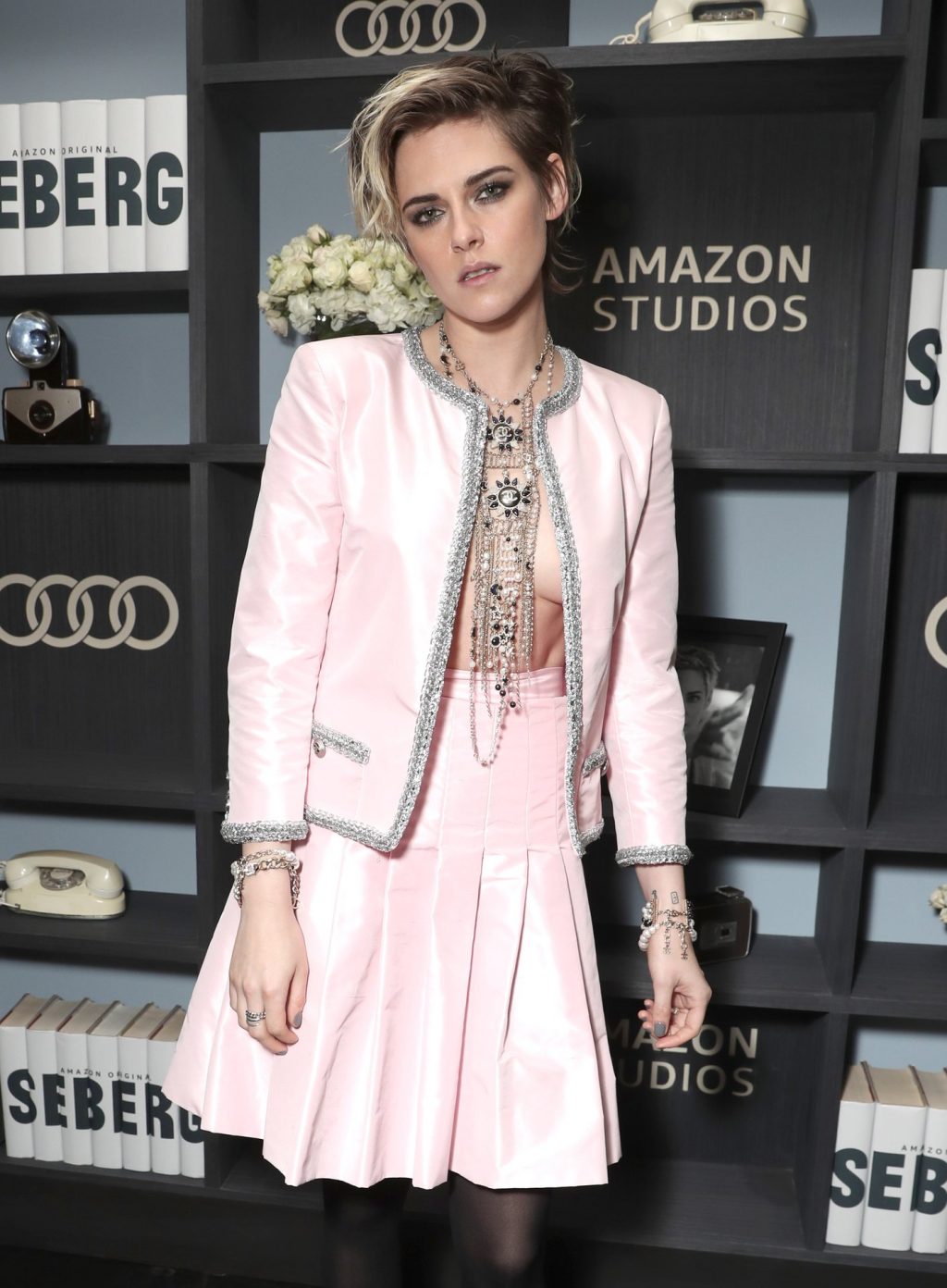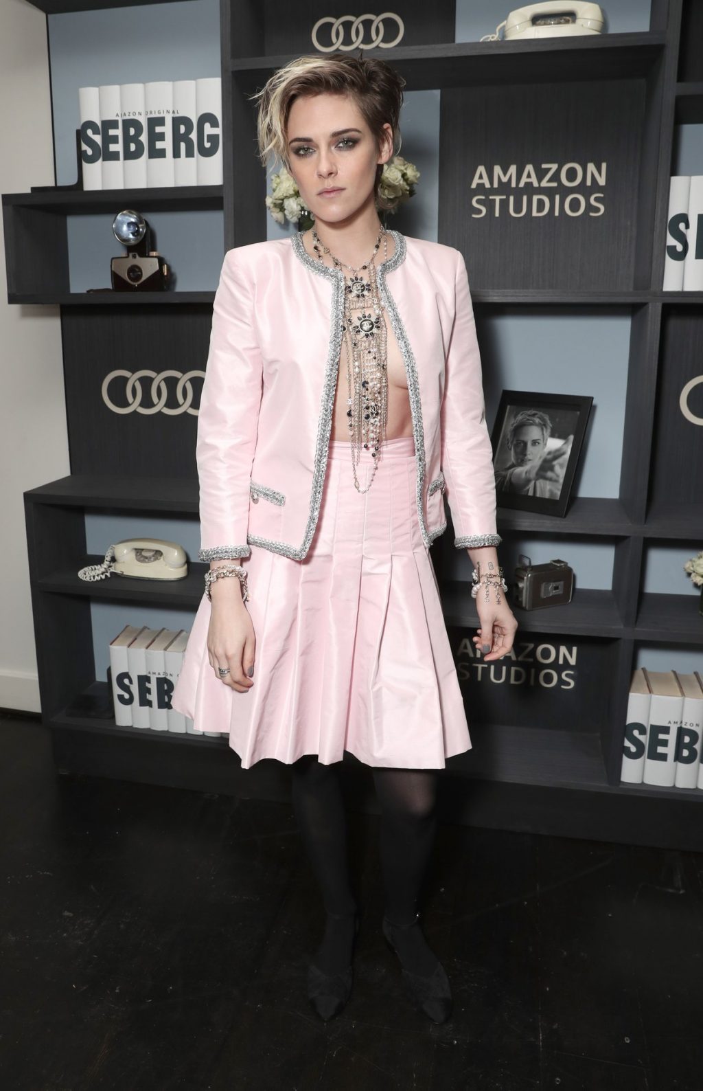 Актриса и звезда The Fappening Кристен Стюарт была замечена в розовом платье без бюстгальтера на специальном показе фильма Amazon Studios «Seberg» в Лос-Анджелесе, 12/10/2019.