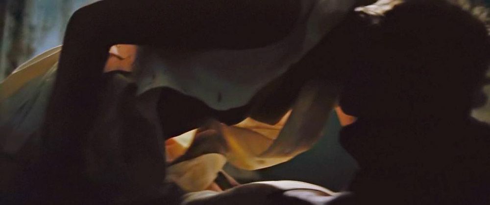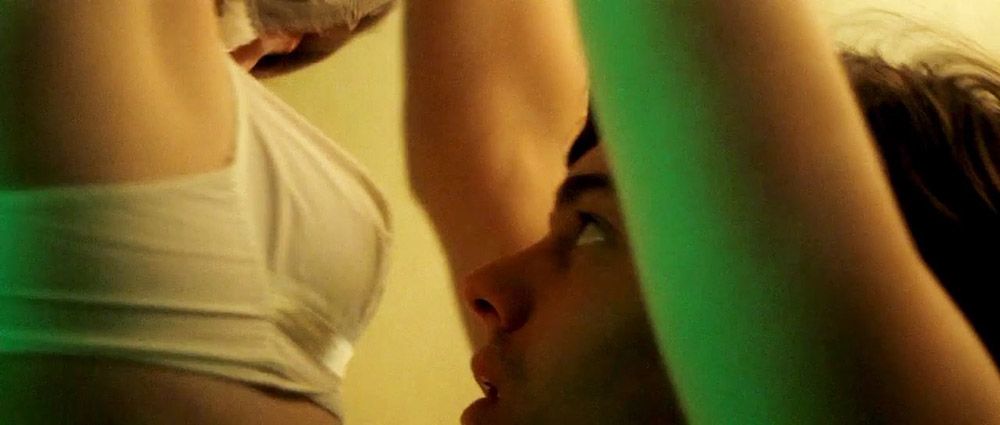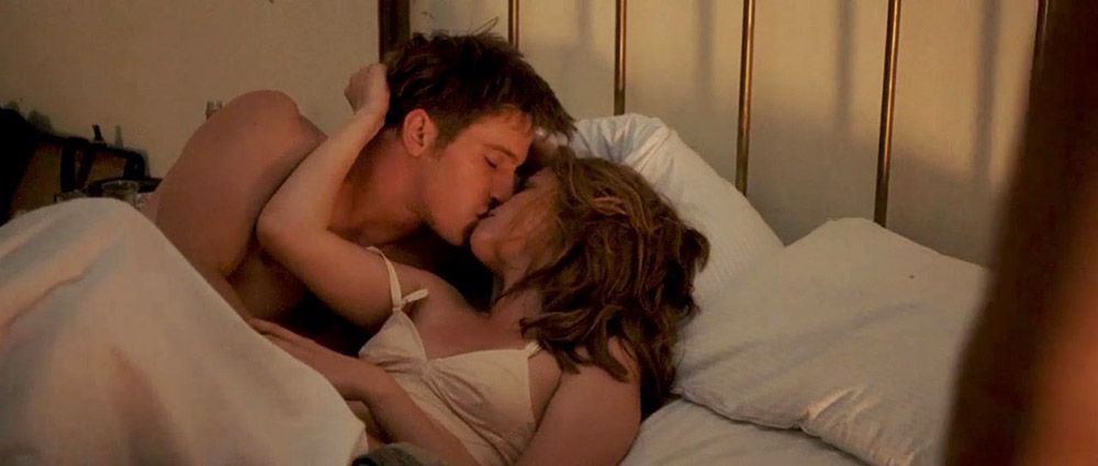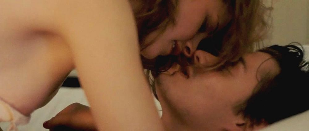 I like Kristen Stewart making out with a guy on a bed. Then she’s climbing on top of him and removing her shirt to reveal a white bra and then removing the bra to show tits. Stewart has sex with him while riding him.