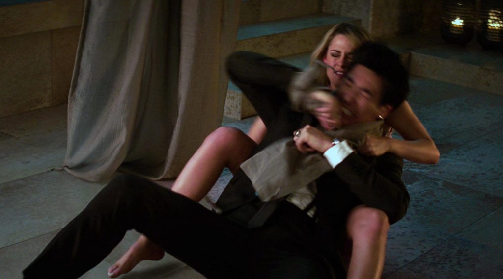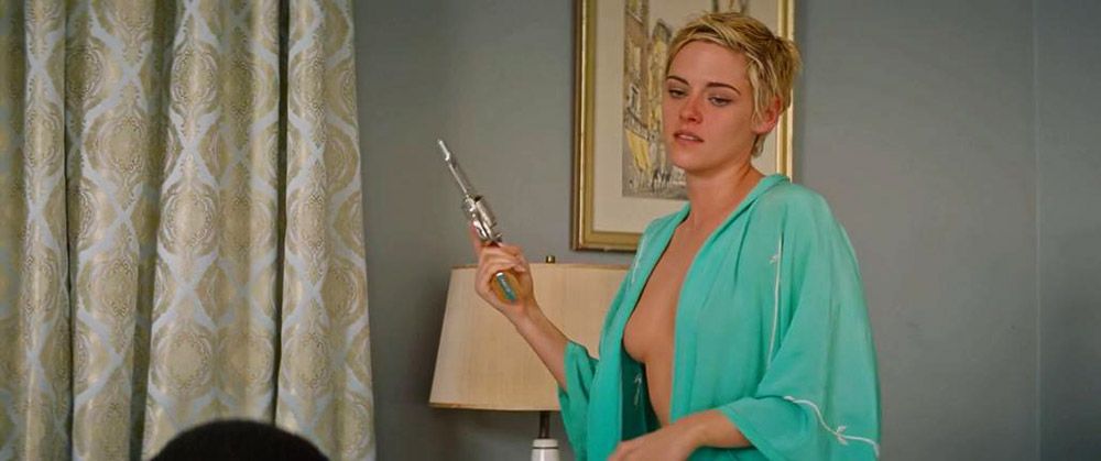 Kristen Stewart is undressing out of her maid’s outfit and showing bare breasts. She approaches a guy naked while holding a hatchet. She raises it but cannot hit him, backing away with the hatchet above her head. Kristen is then seen leaning against a door and falling to the floor with her hand on her mouth.