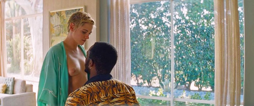 Here are the newest nude scenes of Kristen Stewart. She is falling back onto a bed in an unbuttoned white dress as she kisses a guy. He then opens the dress to reveal her boobs as he stops to examine a scar underneath her tit.