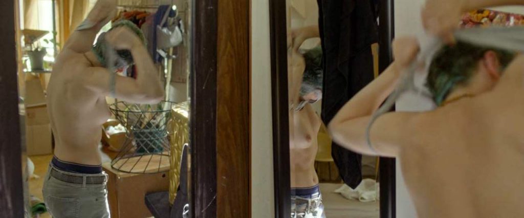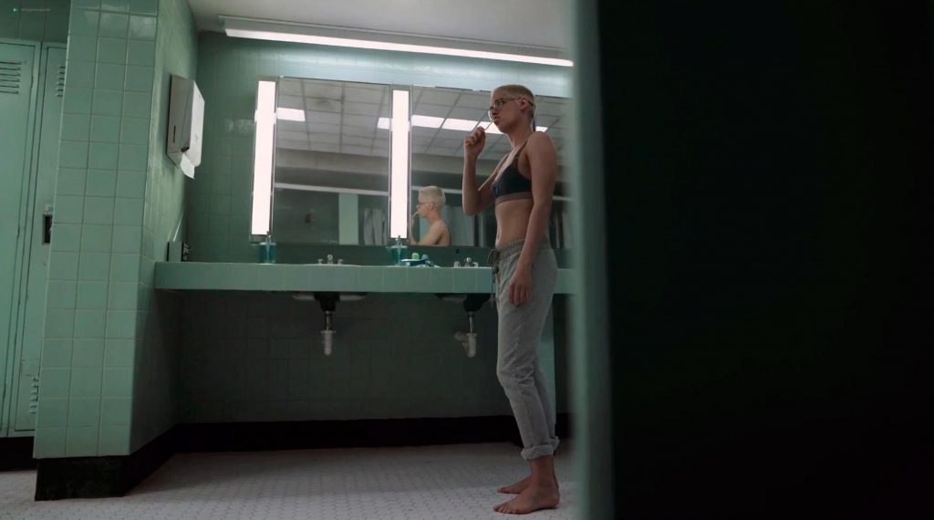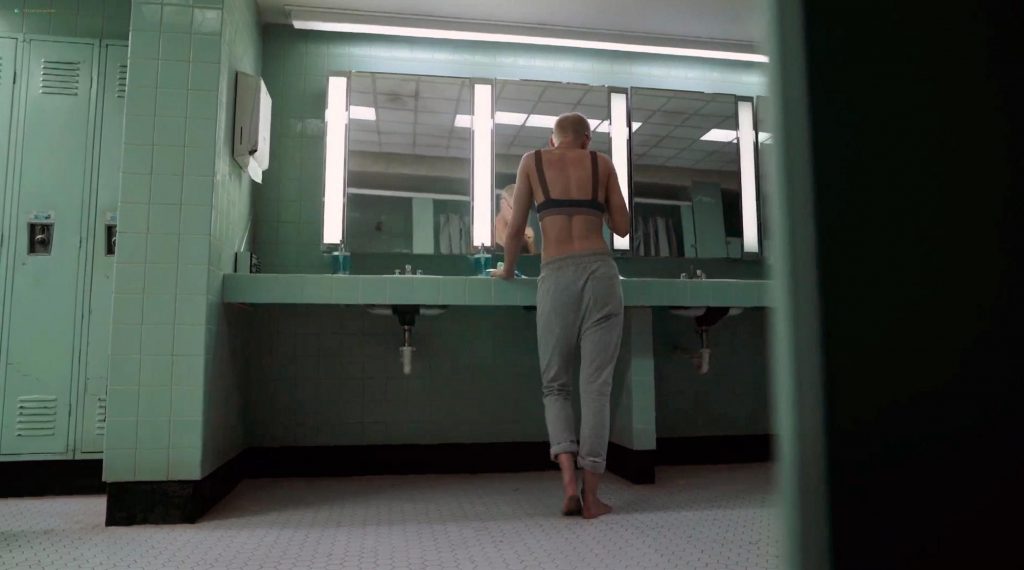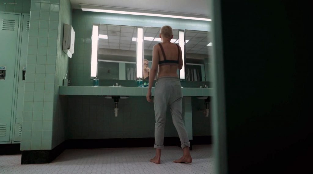 Kristen Stewart topless as she stands near a couple of mirrors. She is showing her breasts in the reflections before she pulls on a grey sports bra.