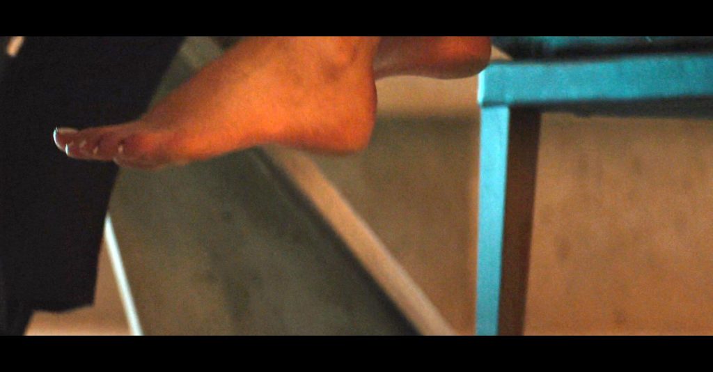 Topless Kristen Stewart is lying on her side on a doctor’s table. She then sits up and walks across the room, still without her shirt on.
