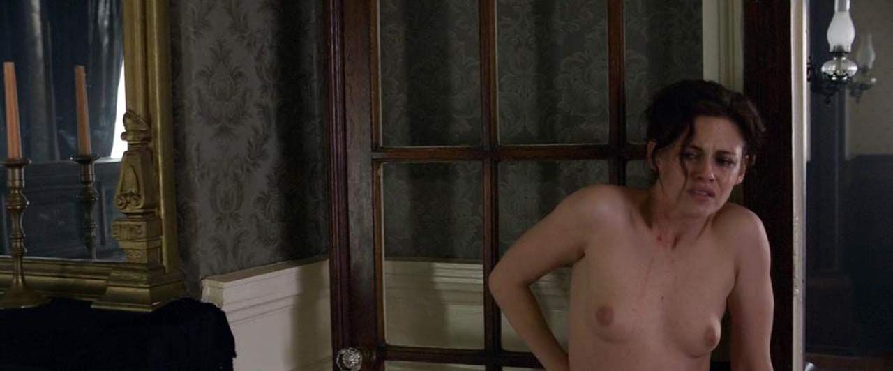Kristen Stewart is undressing out of her maid’s outfit and showing bare breasts. She approaches a guy naked while holding a hatchet. She raises it but cannot hit him, backing away with the hatchet above her head. Kristen is then seen leaning against a door and falling to the floor with her hand on her mouth.