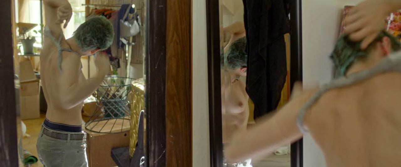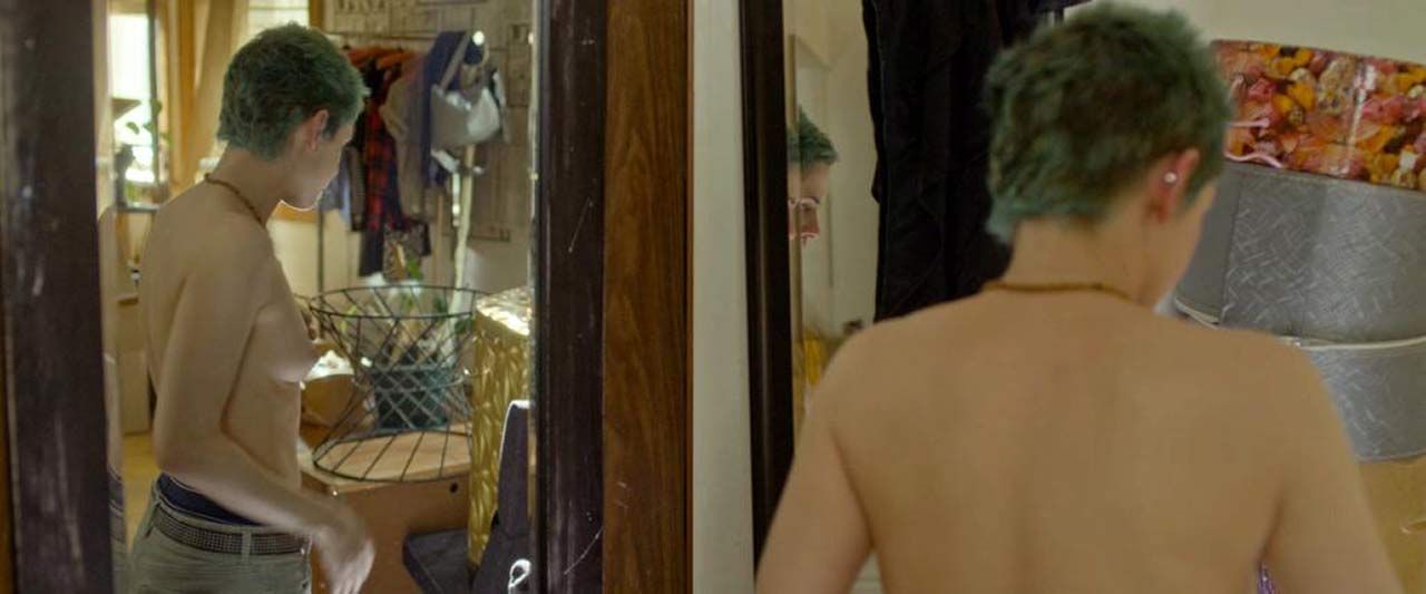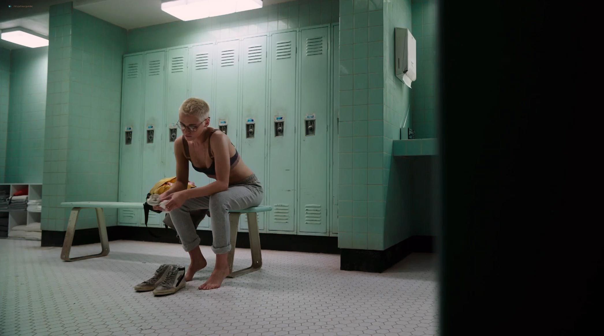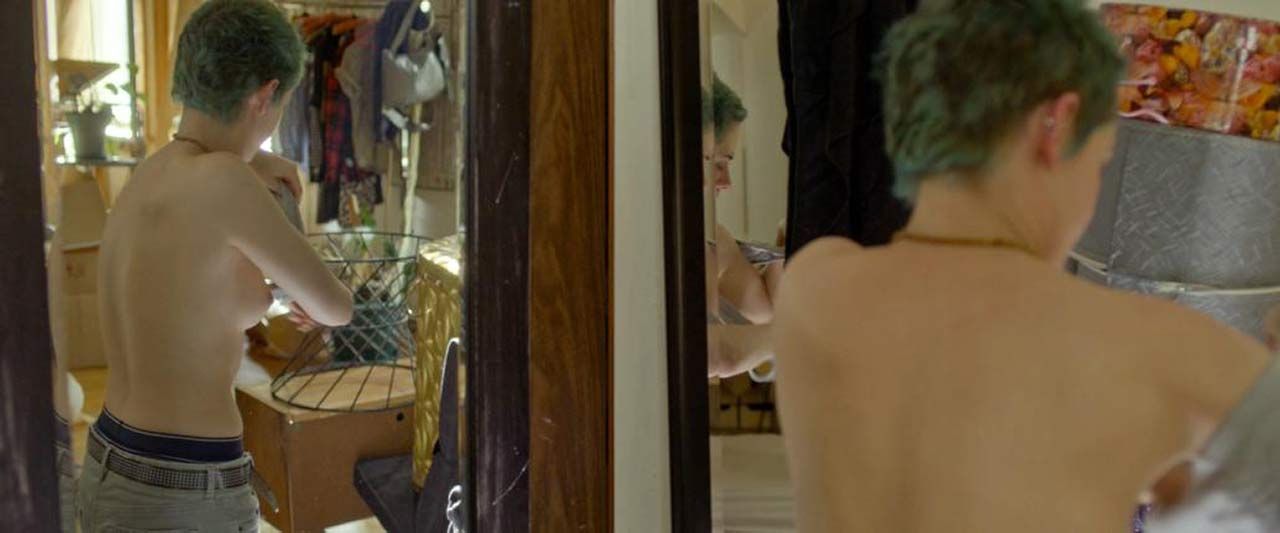 Kristen Stewart topless as she stands near a couple of mirrors. She is showing her breasts in the reflections before she pulls on a grey sports bra.