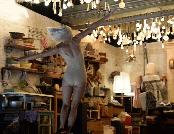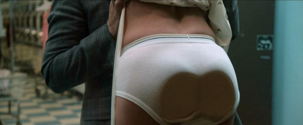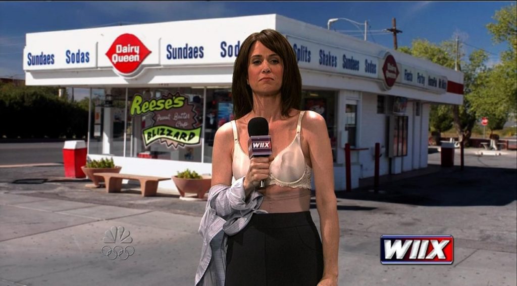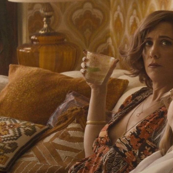 Kristen Wiig is wearing a purple bikini as she stands in front of a mirror and checks herself out. We then see her on a TV set pulling her dress open to reveal the same bikini underneath and then strutting around a little.